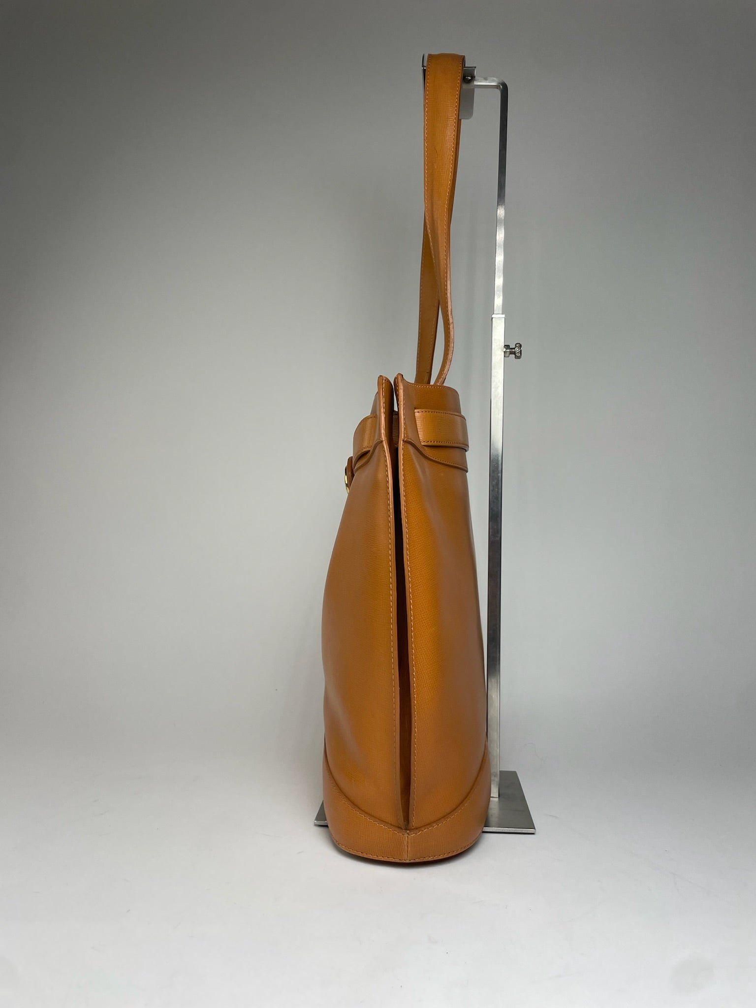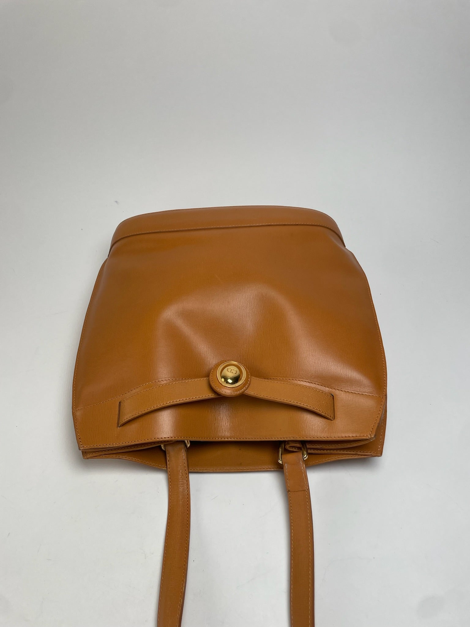 CHRISTIAN DIOR Vintage Handbag. This elegant vintage handbag is crafted of orange-brown leather. The bag features two medium-length handles that allow it to be worn over the shoulder, gold-tone steel hardware, and a gold-tone CD appliqué on the front. The interior opens to a black coated lining with two interior pockets. The sale includes a Christian Dior dustbag.