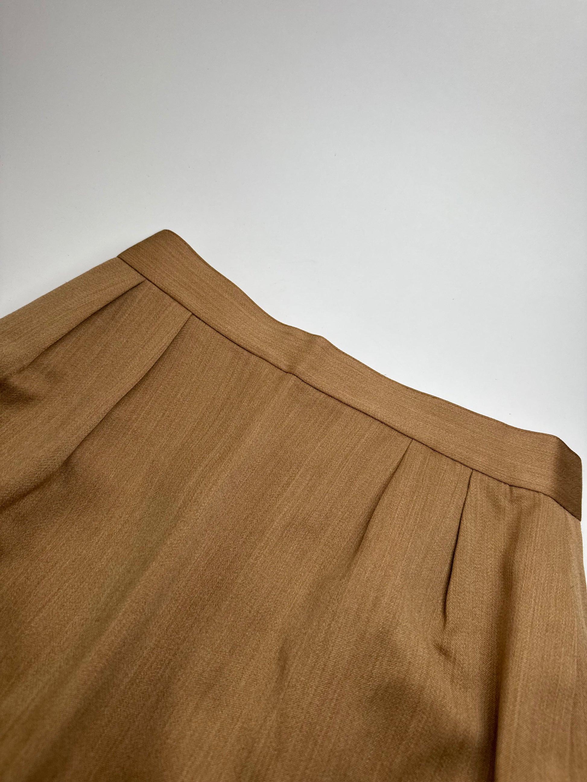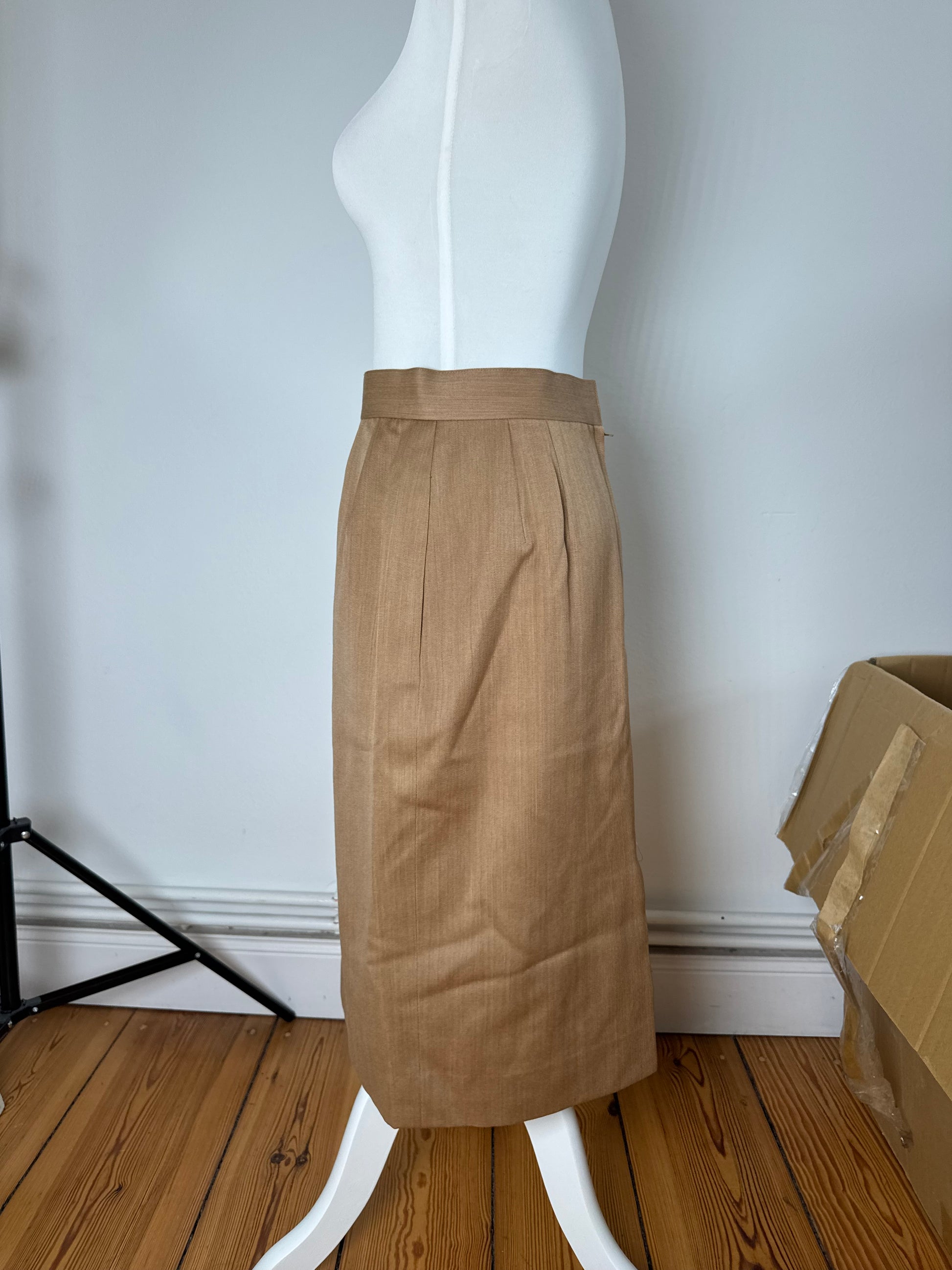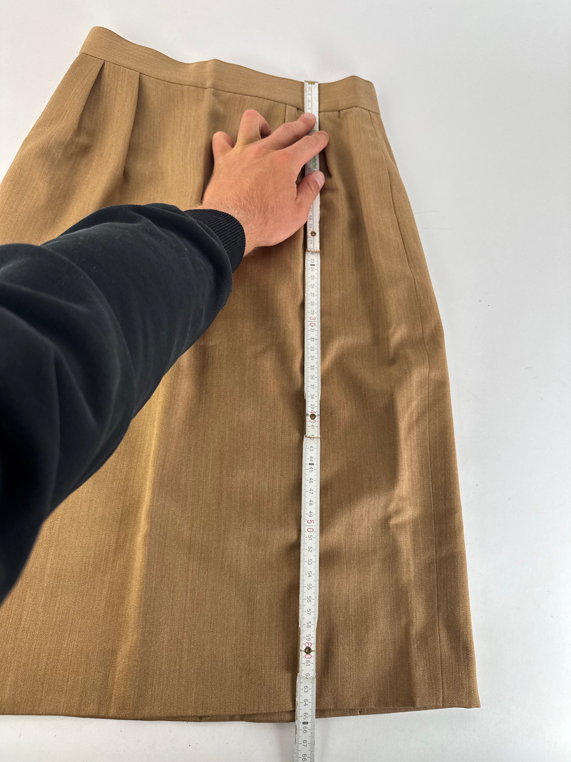 DIOR Vintage Brown Wool & Linen High-Waist Skirt. This elegant vintage skirt by Dior is crafted from a brown wool and linen blend, featuring a flattering high-waist cut. The interior is lined in soft grey viscose for added comfort. Made with refined tailoring, this timeless piece offers structured elegance and a classic silhouette.