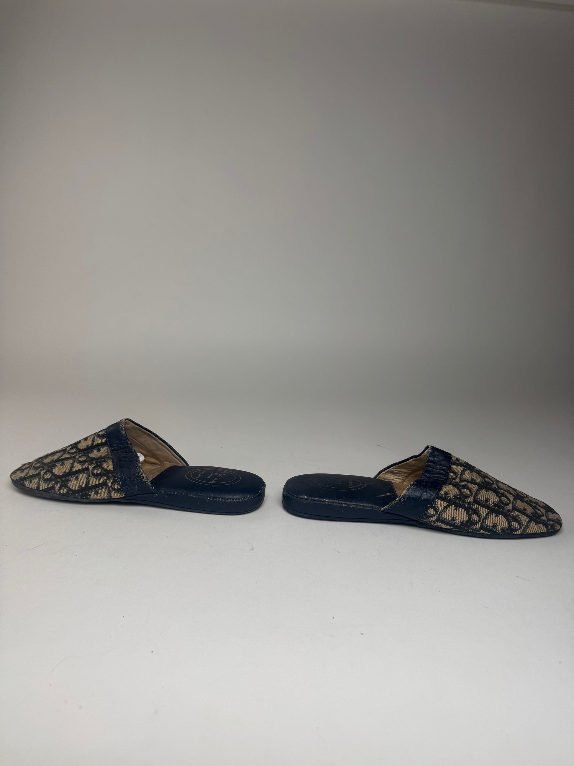 DIOR Vintage Slides. These chic unisex slides are finely crafted of navy beige Dior Oblique monogram canvas with navy leather details. The shoes feature a black sole.