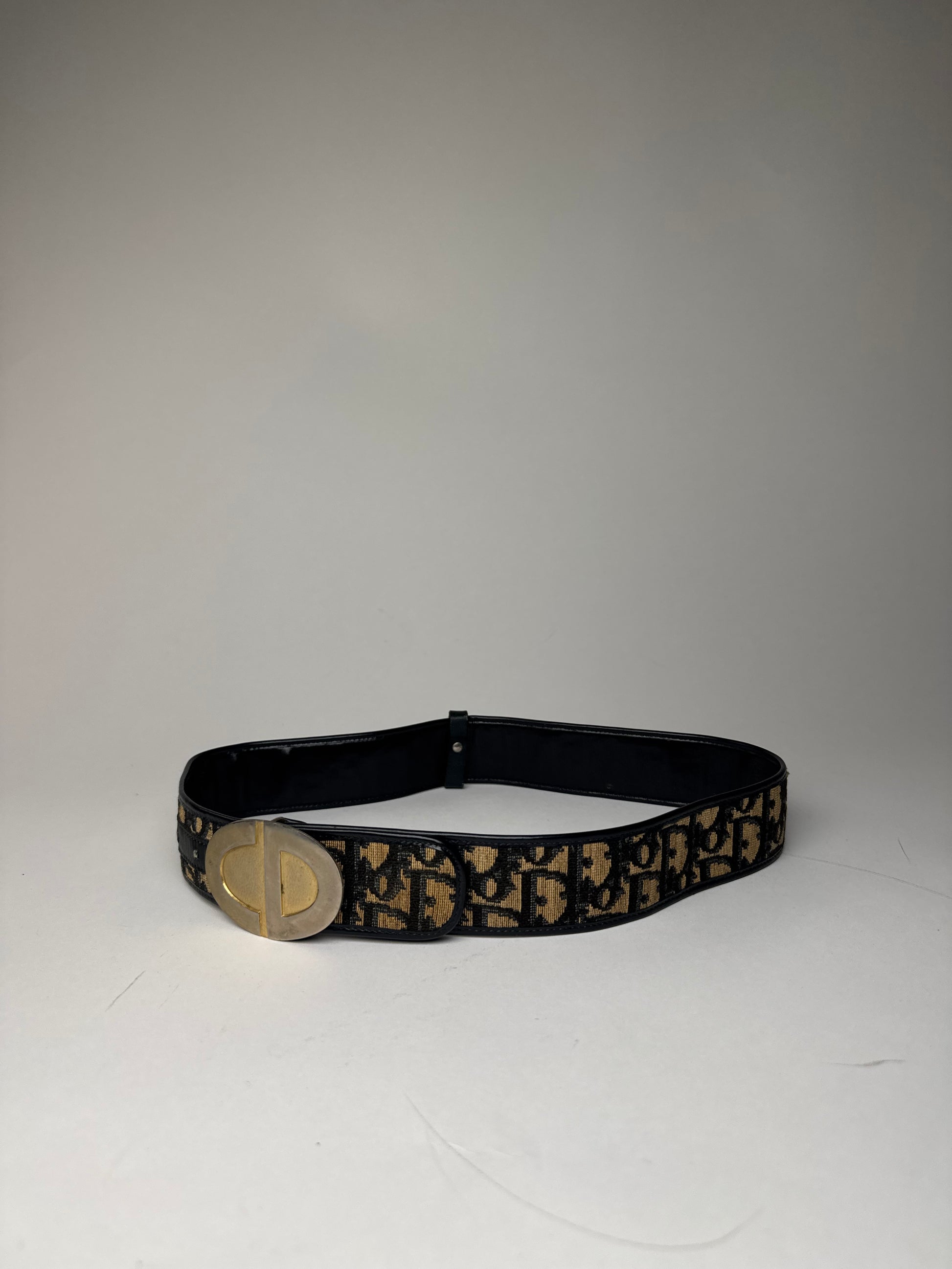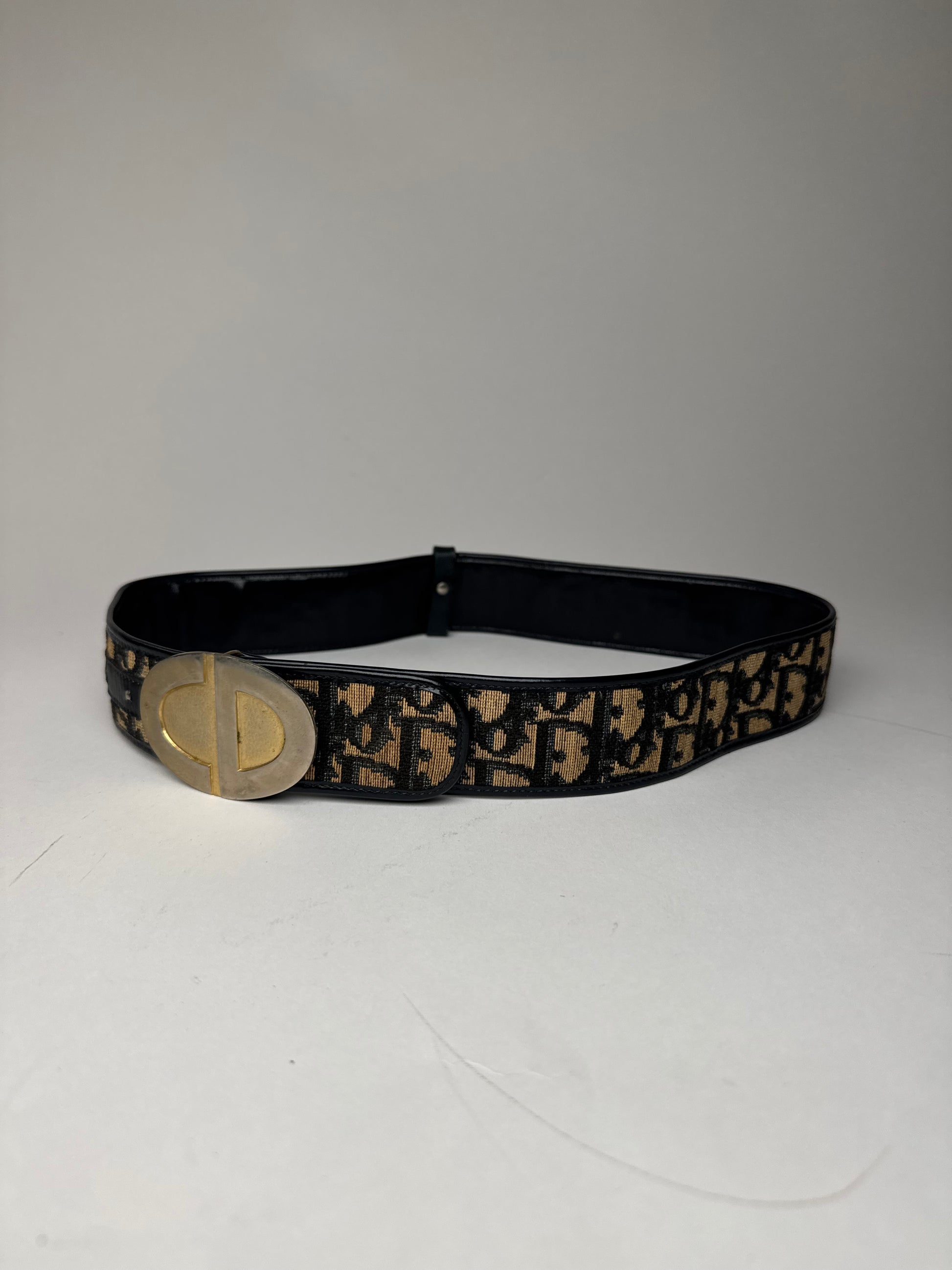 DIOR Vintage Belt. This statement belt is crafted of beige and navy canvas in the iconic Dior Oblique monogram, complemented by patent leather details. The Dior Oblique motif was first introduced in 1967 by Marc Bohan and has since become one of the house’s most recognizable signatures, symbolizing Dior’s heritage of Parisian elegance and modern luxury. The buckle is designed in the shape of the CD logo in mixed silver- and gold-tone steel. The interior is lined with navy patent leather.