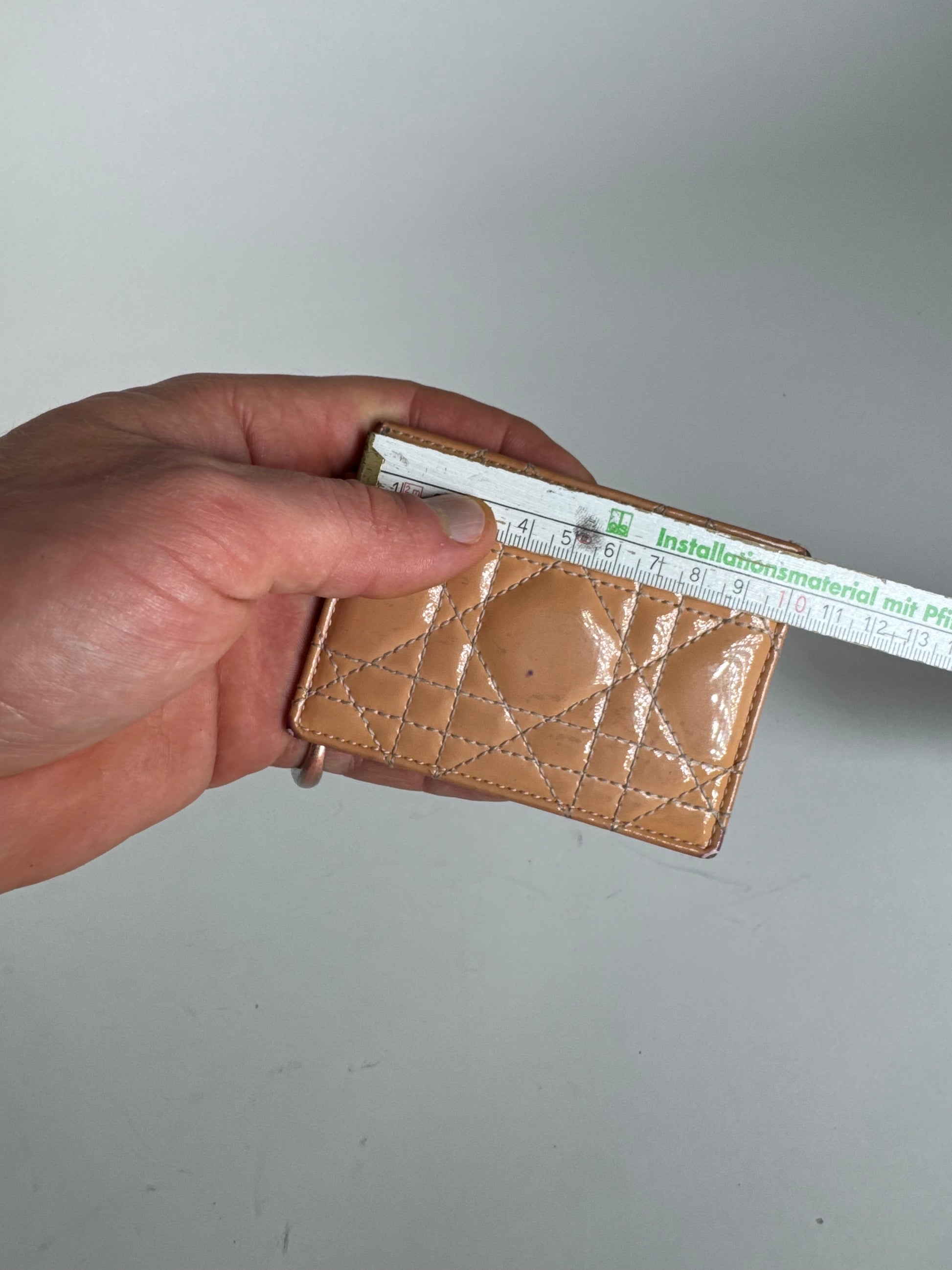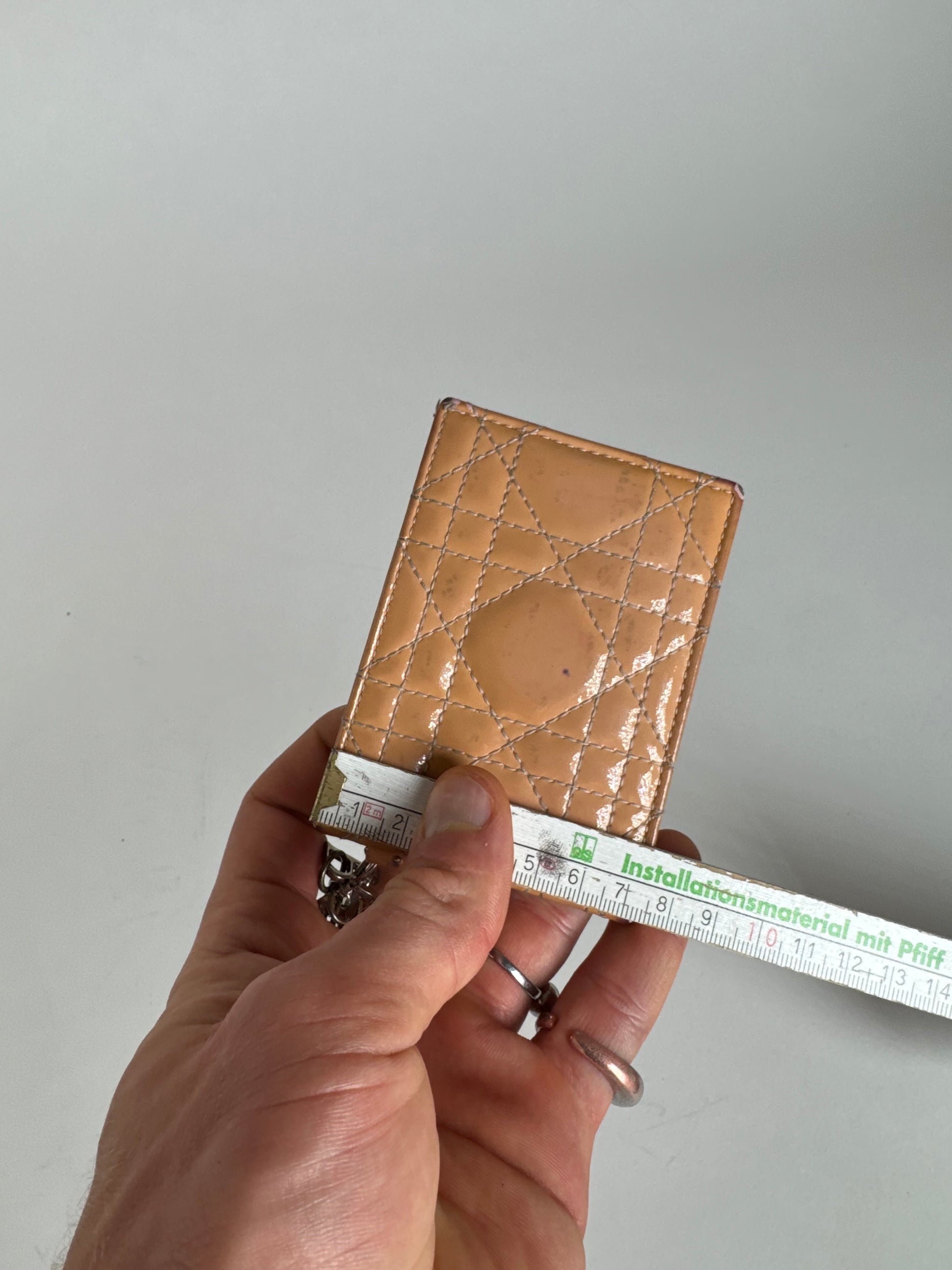 DIOR Vintage Lady Dior Card Holder. This elegant vintage Lady Dior card holder from Dior is crafted from peach-colored patent leather, exuding a refined and timeless aesthetic. The interior is lined with soft pink leather, adding a delicate contrast. Made in Italy, this unisex accessory is both stylish and functional.