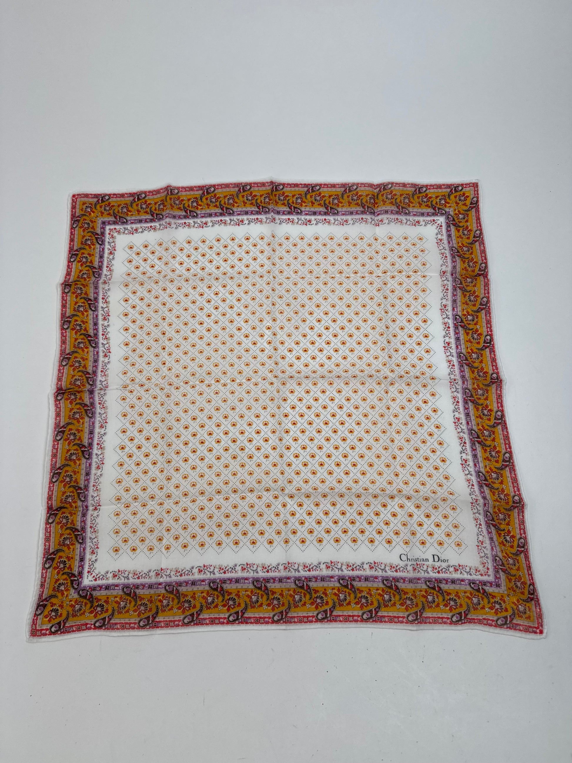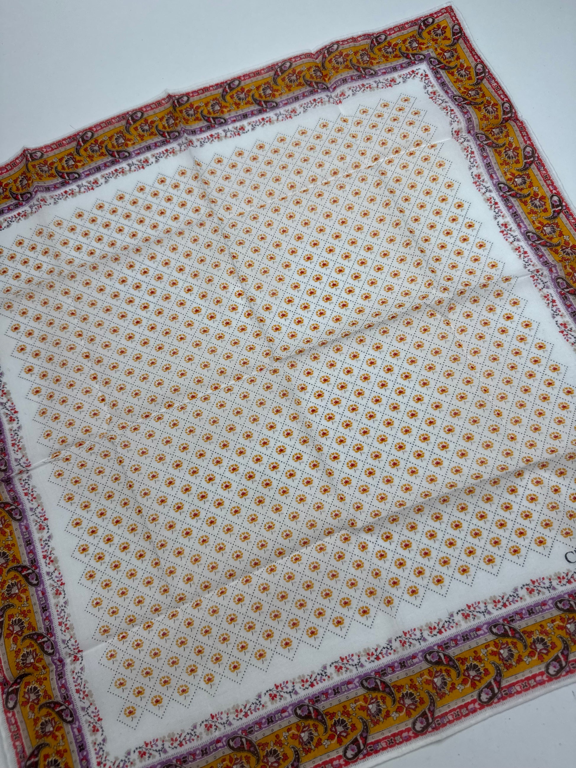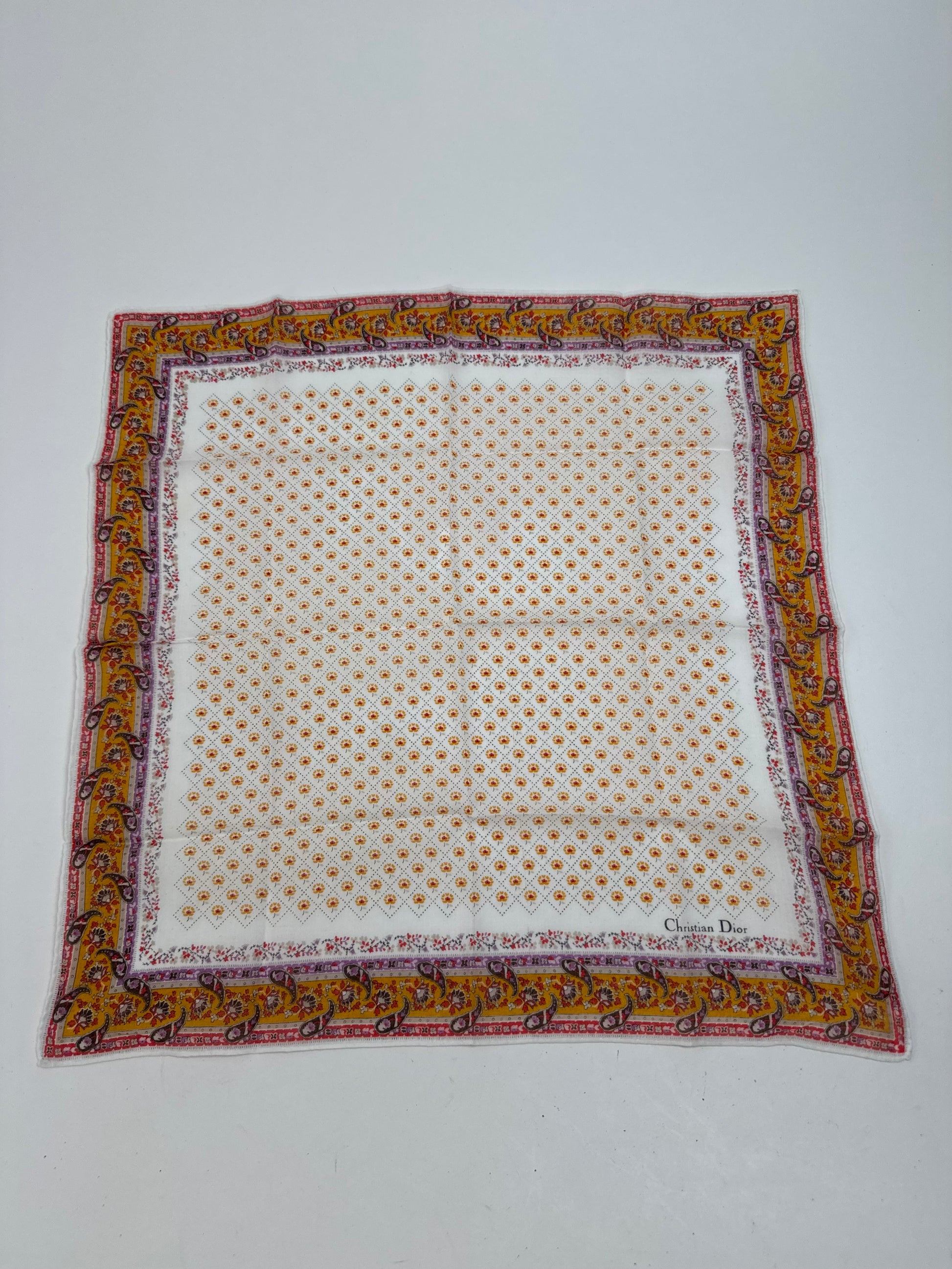 This unique vintage scarf by Dior is likely crafted from a silk-canvas blend and features a white base with dotted patterns throughout. The border showcases an ornate, baroque-inspired design in rich yellow, purple, and red tones, adding a luxurious and artistic touch.