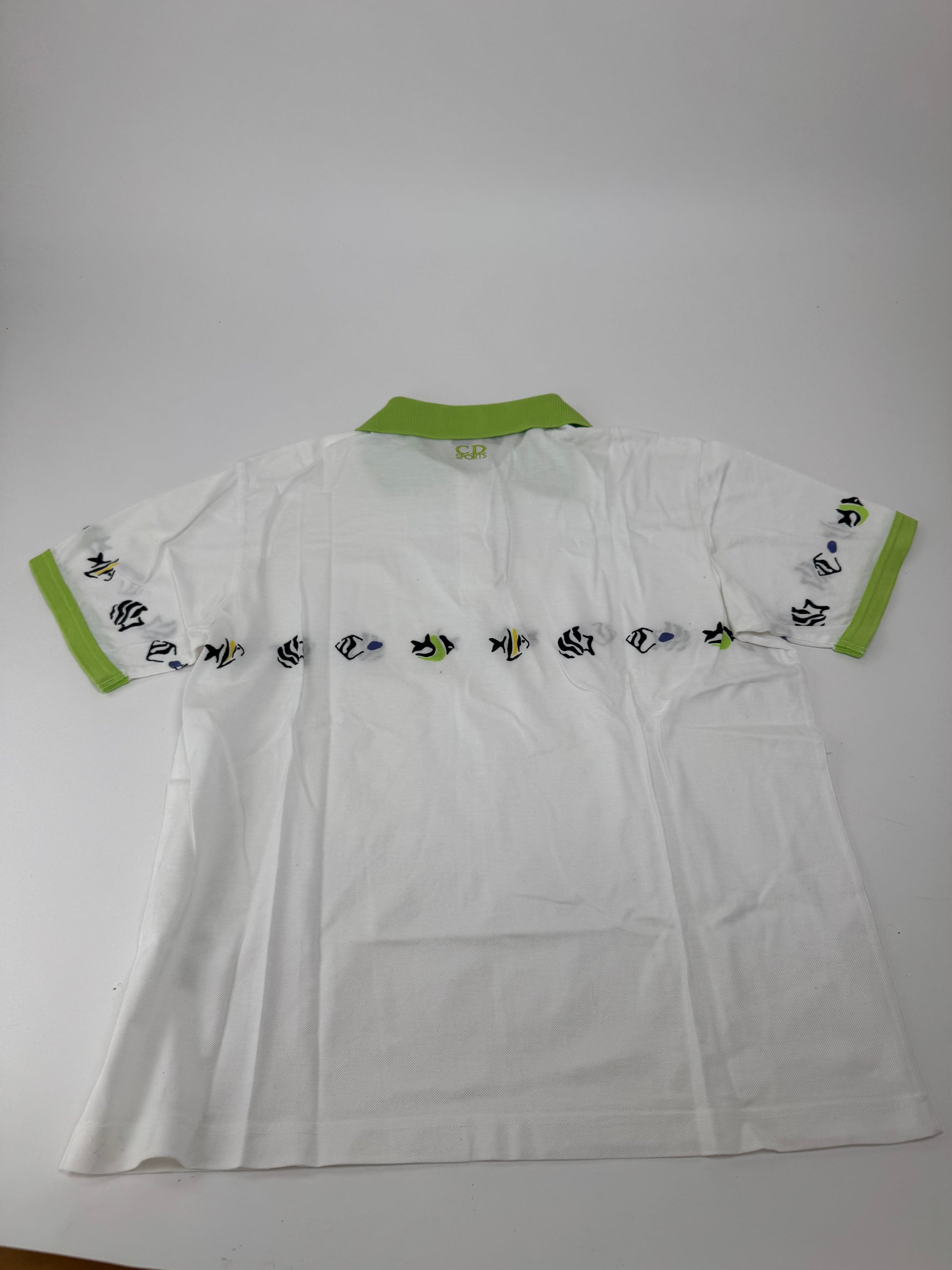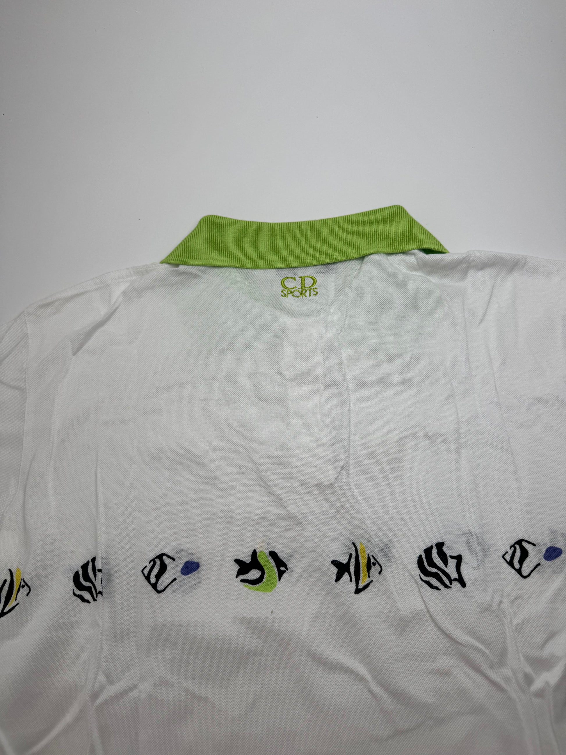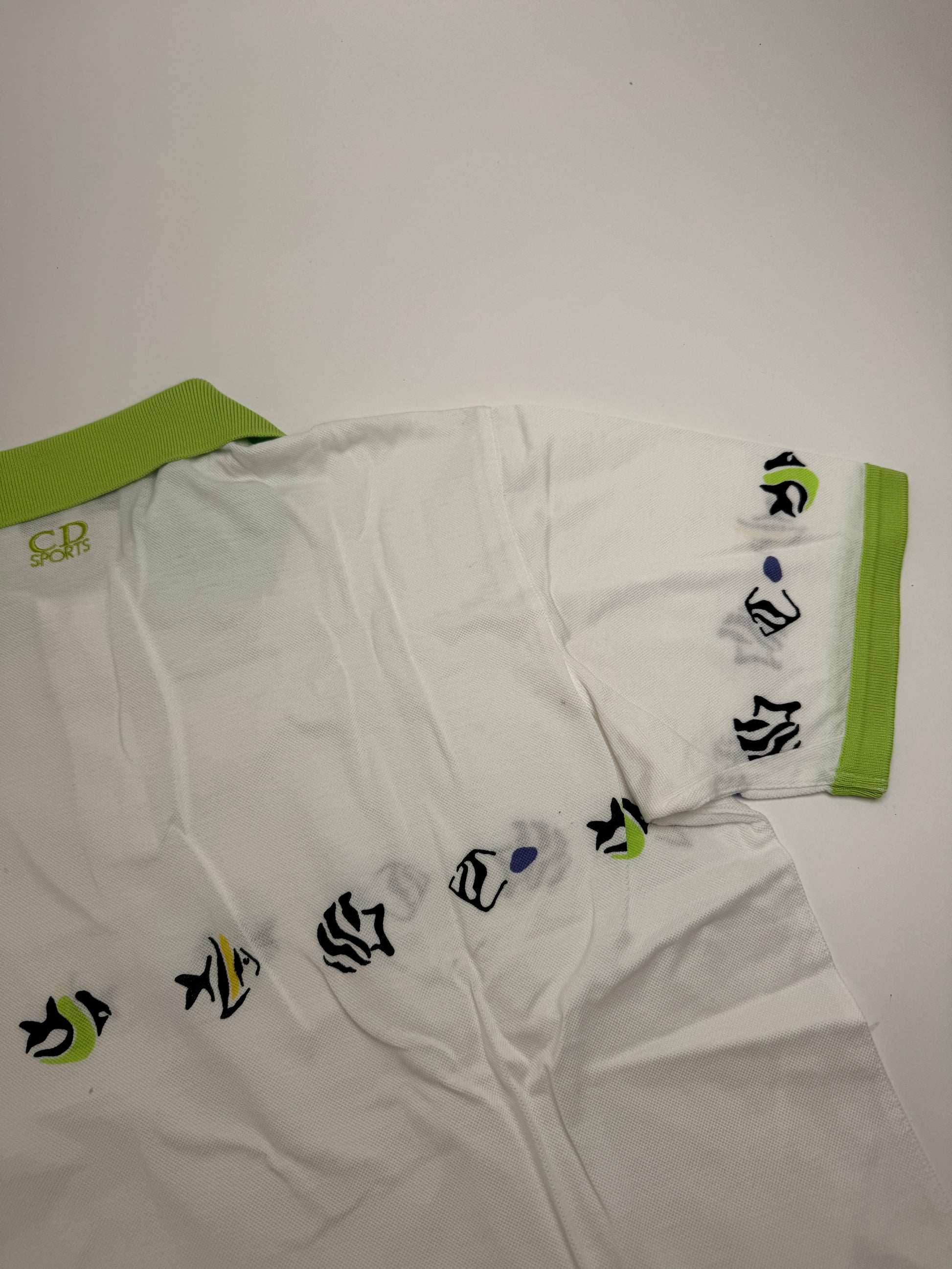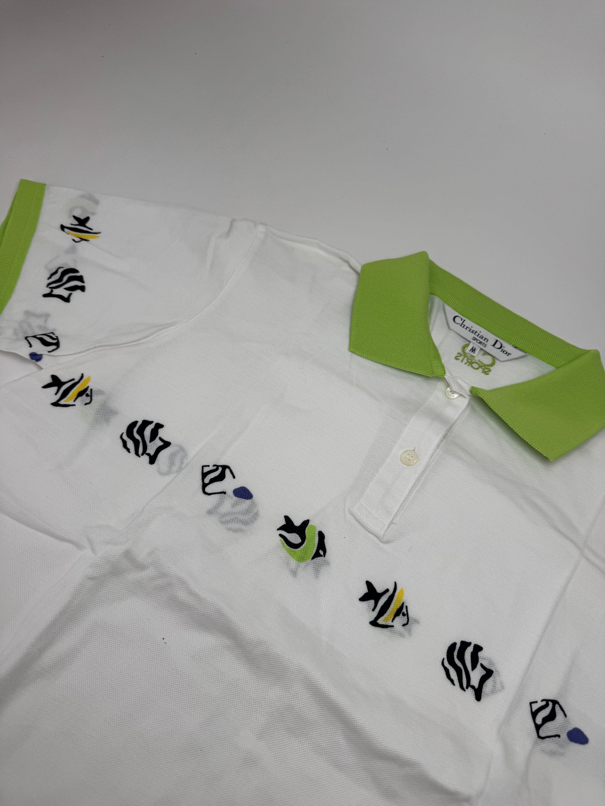 DIOR Vintage White Cotton Polo Shirt with Green Trim and Coral Fish Print.