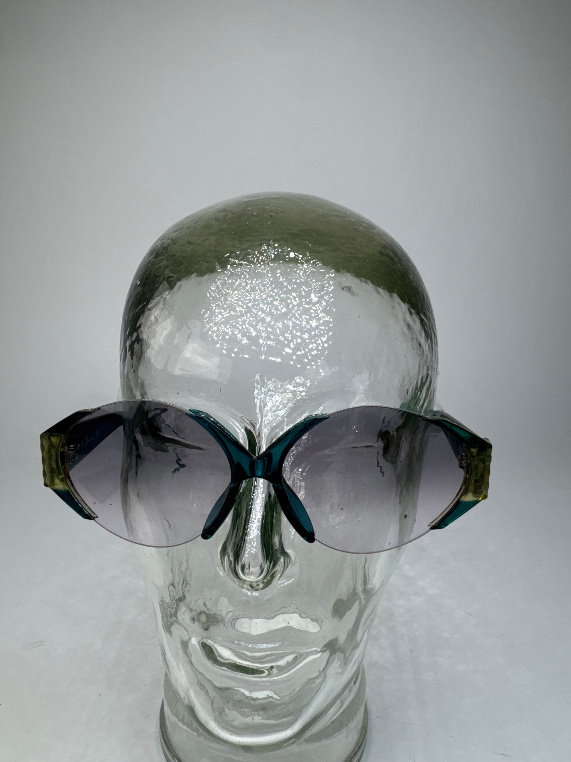 DIOR Vintage Oversized Sunglasses. These bold vintage sunglasses are crafted from transparent blue plastic with a contrasting transparent yellow lower frame and feature violet-tinted lenses. Silver-tone CD appliqués on each side add a signature Dior finish, creating a striking and fashion-forward oversized silhouette.