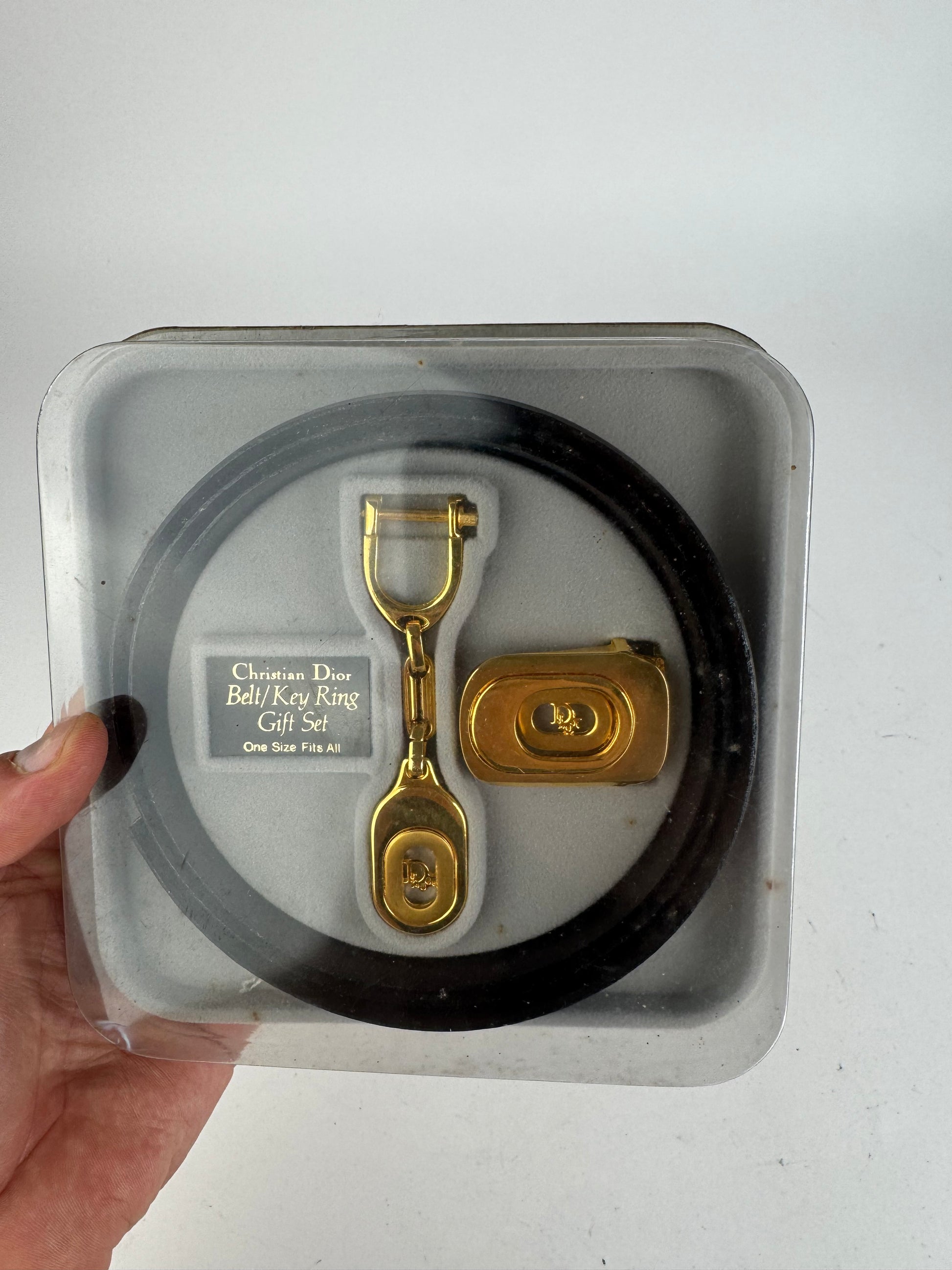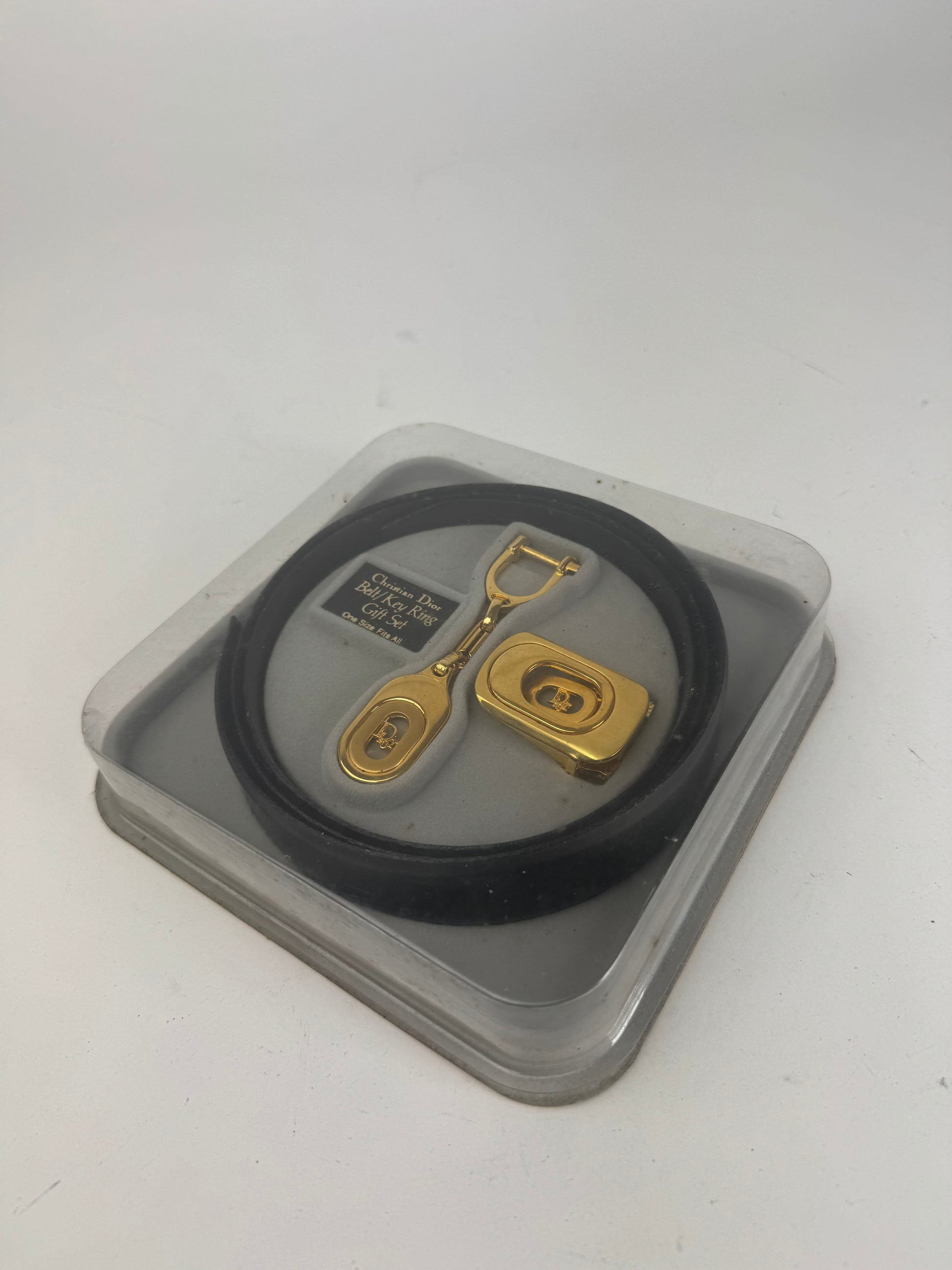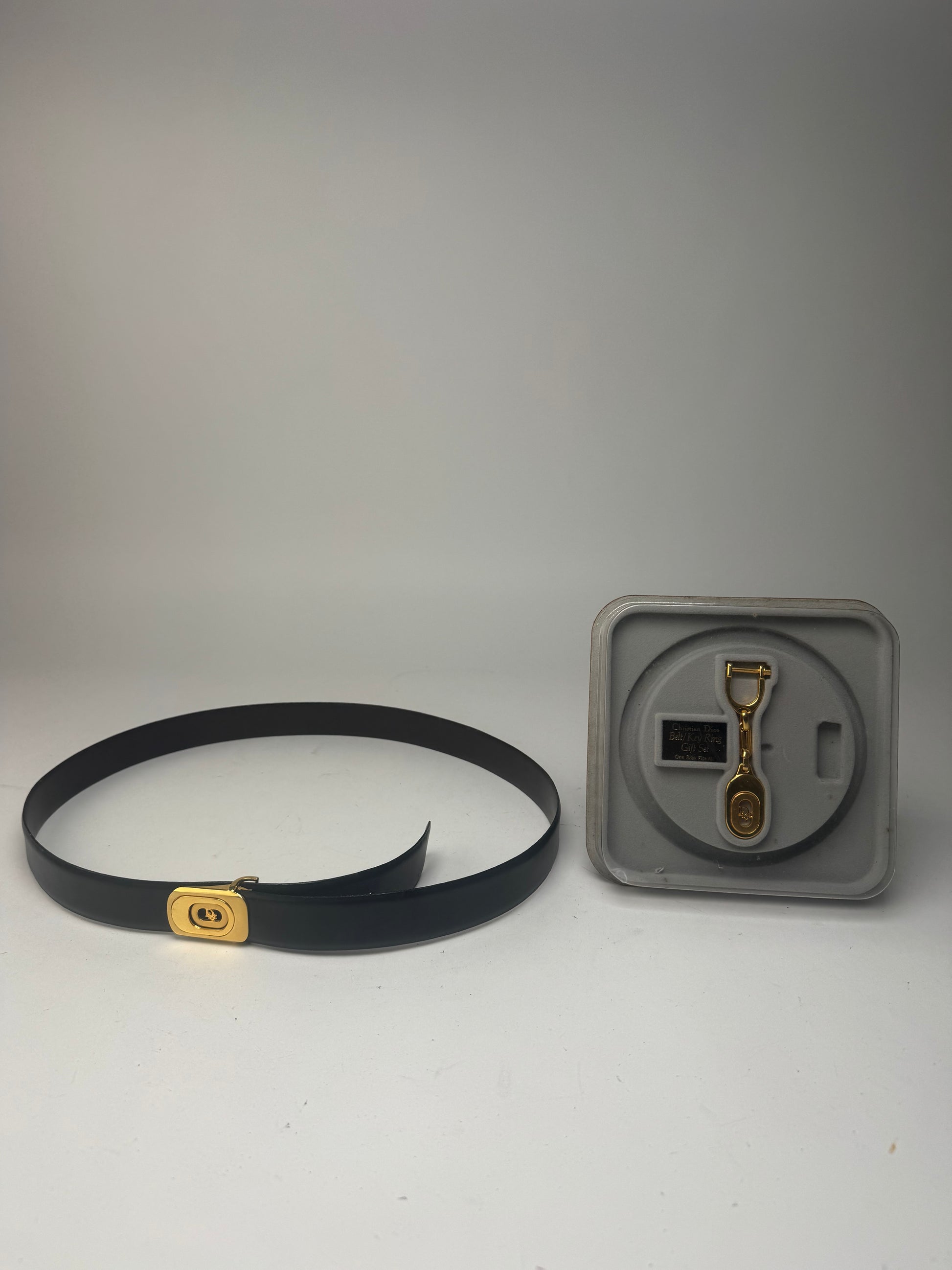 DIOR Vintage Belt & Accessory Set. This rare vintage set includes a reversible belt crafted of brown and black leather with a gold-tone steel buckle featuring the Dior logo, as well as a Christian Dior key-weight ring and a matching shoehorn. Likely from the 1980s, this set is a true classic and comes in its original packaging. The belt is marked “One Size Fits All” and measures 115 cm in total length with a width of 3 cm. The reverse of the packaging includes instructions for use.