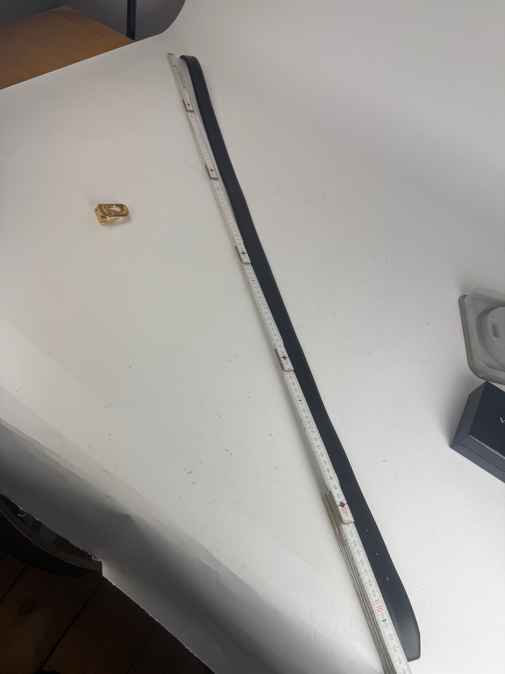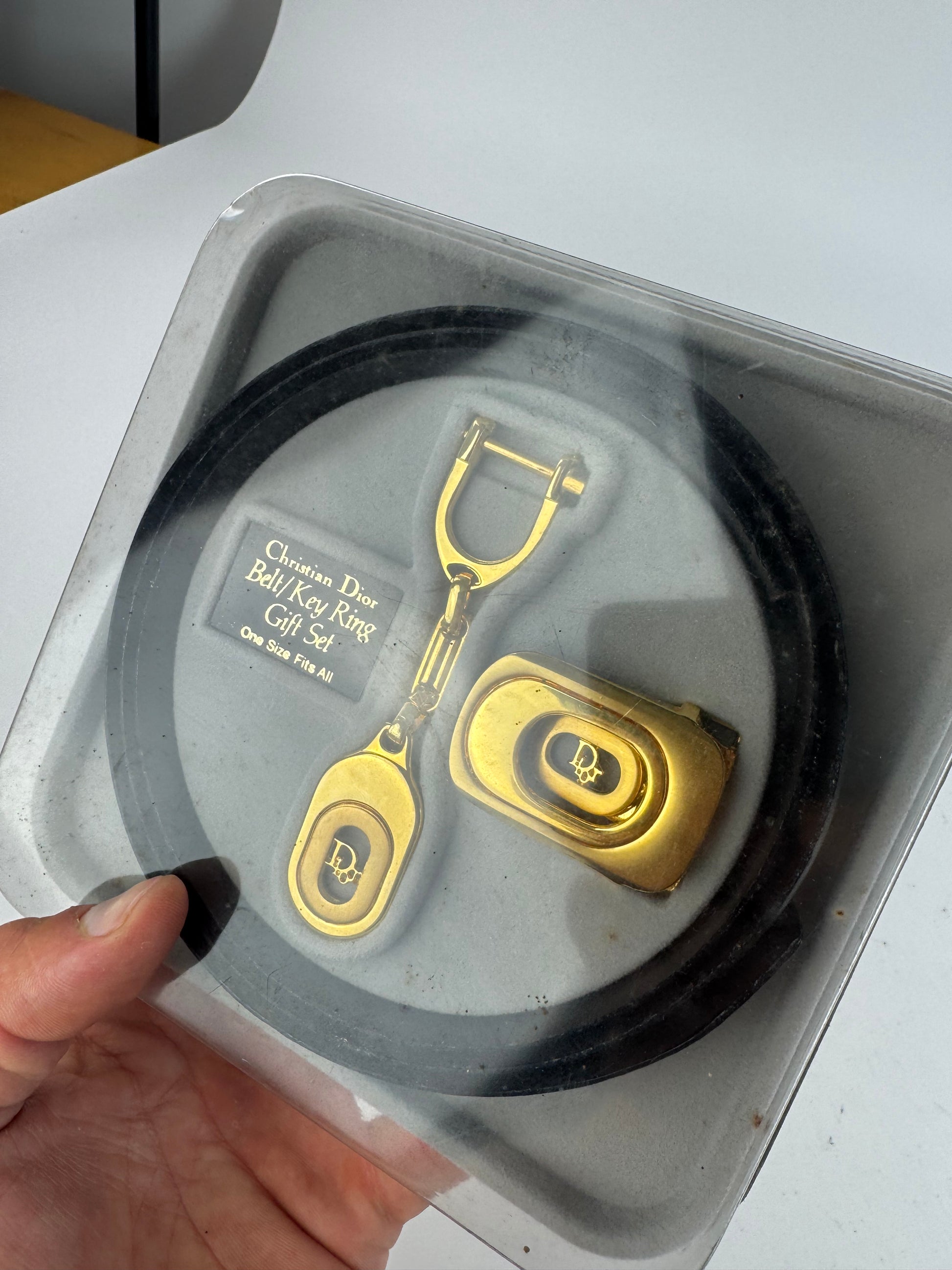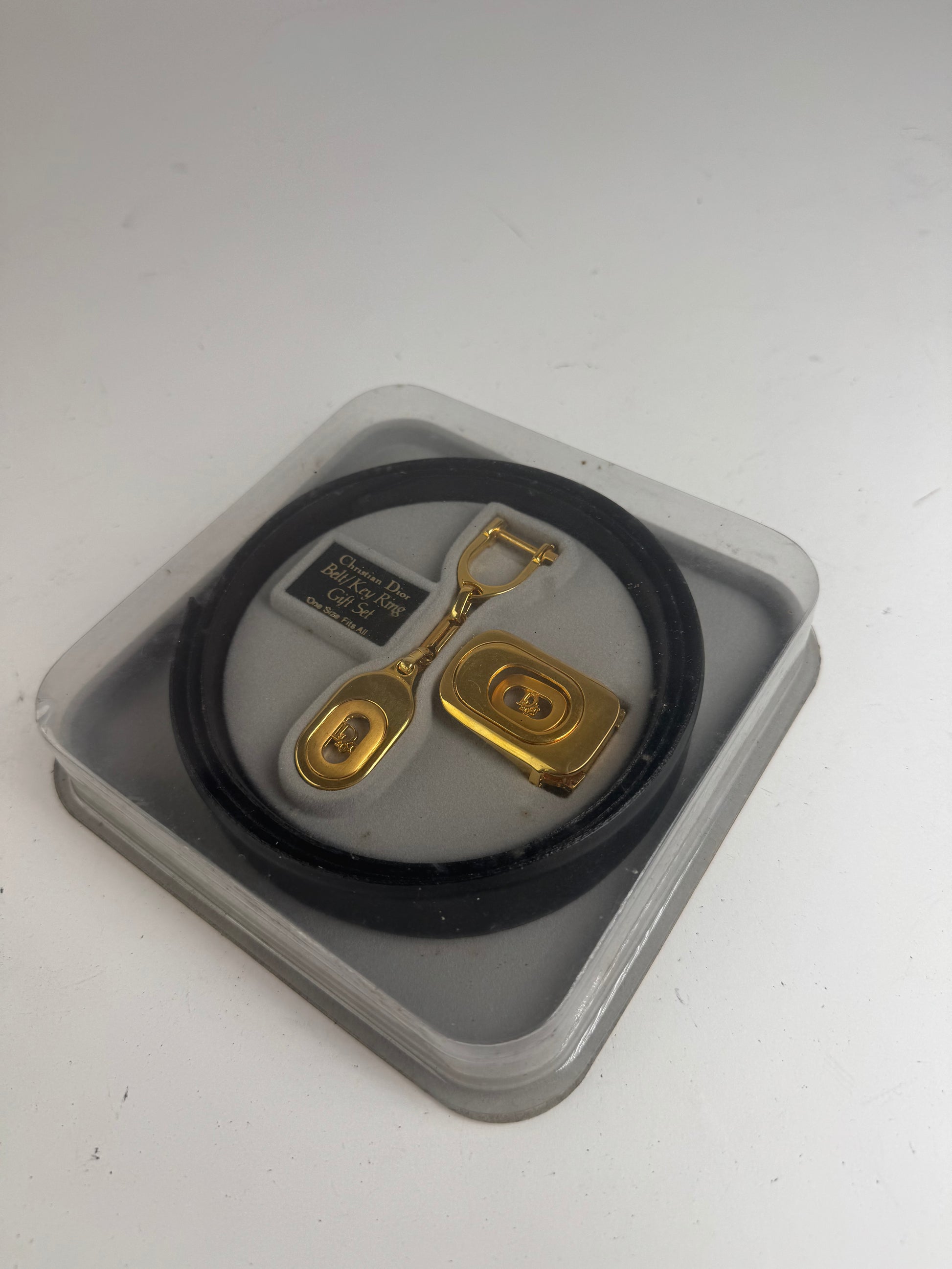 DIOR Vintage Belt & Accessory Set. This rare vintage set includes a reversible belt crafted of brown and black leather with a gold-tone steel buckle featuring the Dior logo, as well as a Christian Dior key-weight ring and a matching shoehorn. Likely from the 1980s, this set is a true classic and comes in its original packaging. The belt is marked “One Size Fits All” and measures 115 cm in total length with a width of 3 cm. The reverse of the packaging includes instructions for use.