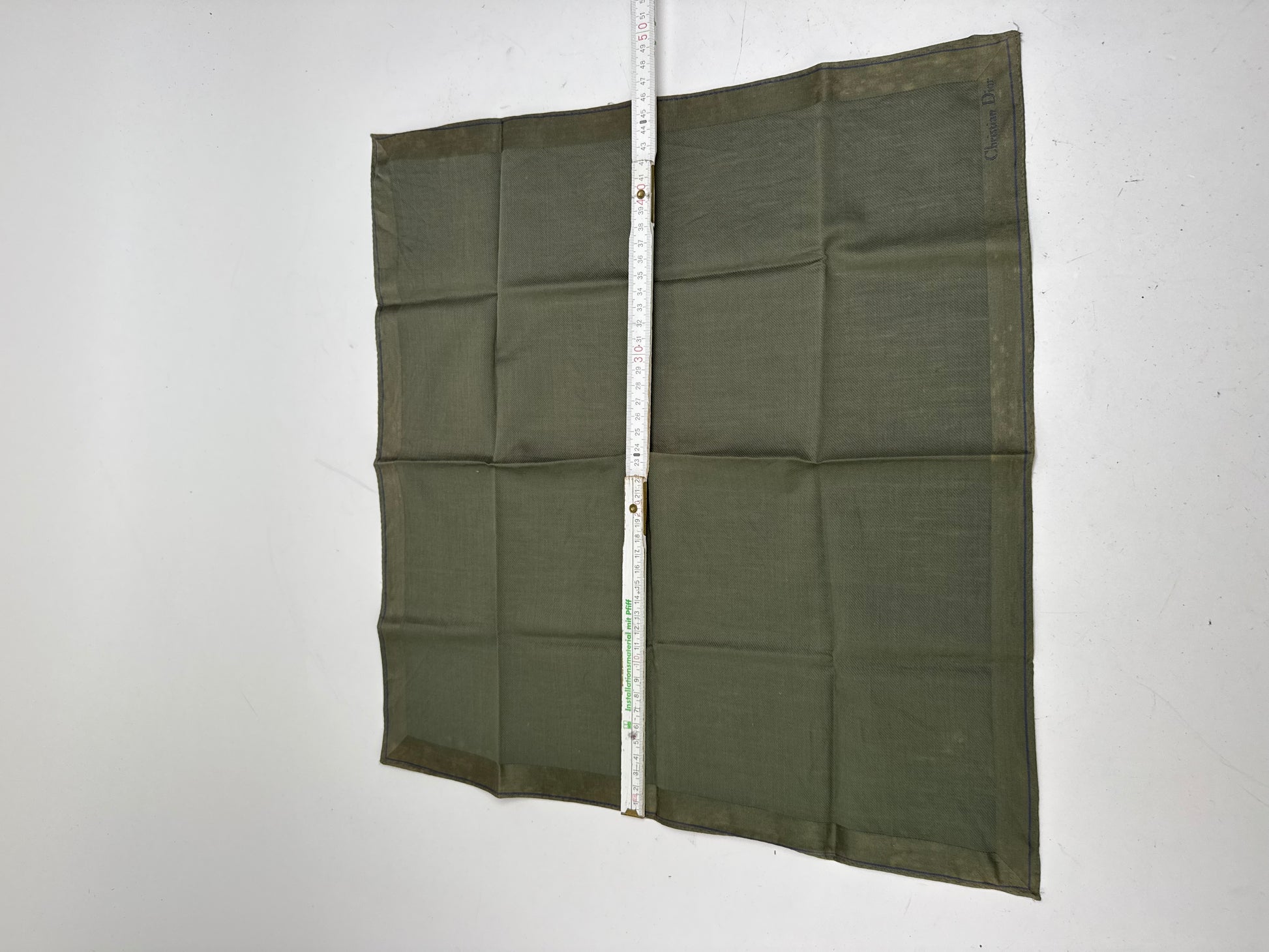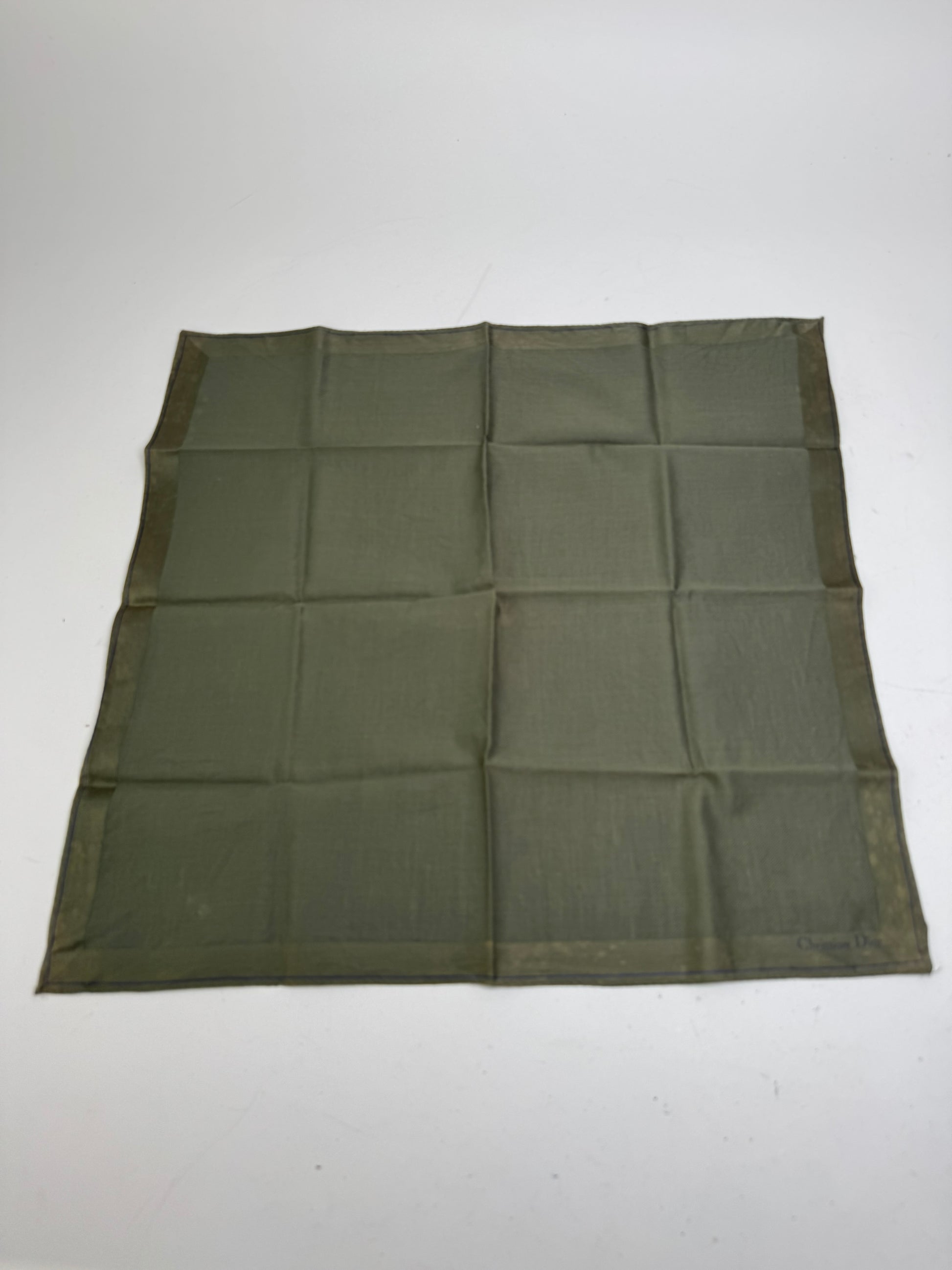 This elegant vintage scarf is finely crafted from a luxurious blend of cotton and silk. It features a deep dark green base with a subtle navy border and khaki-toned edge, showcasing Dior’s refined sense of color and timeless sophistication.