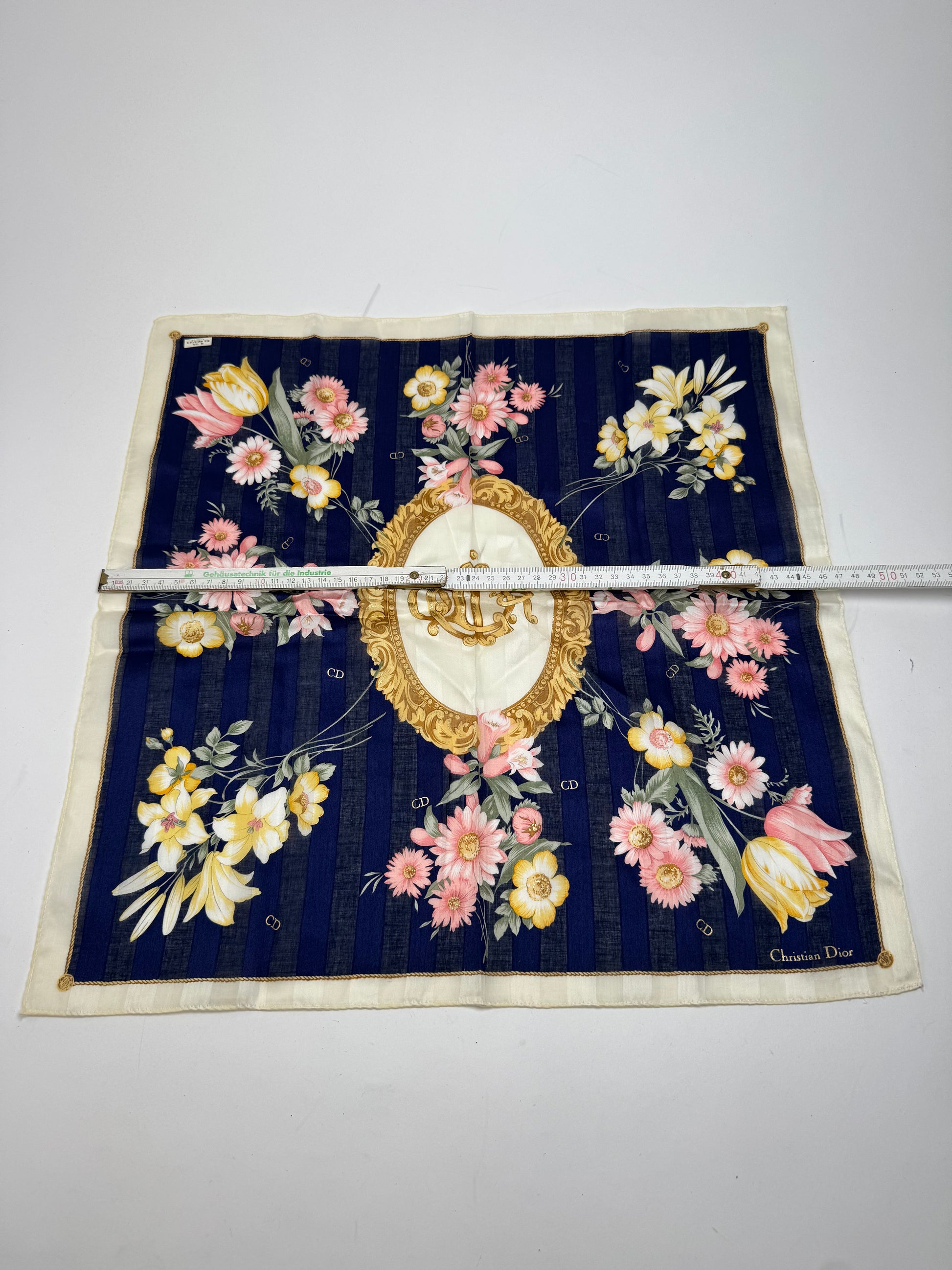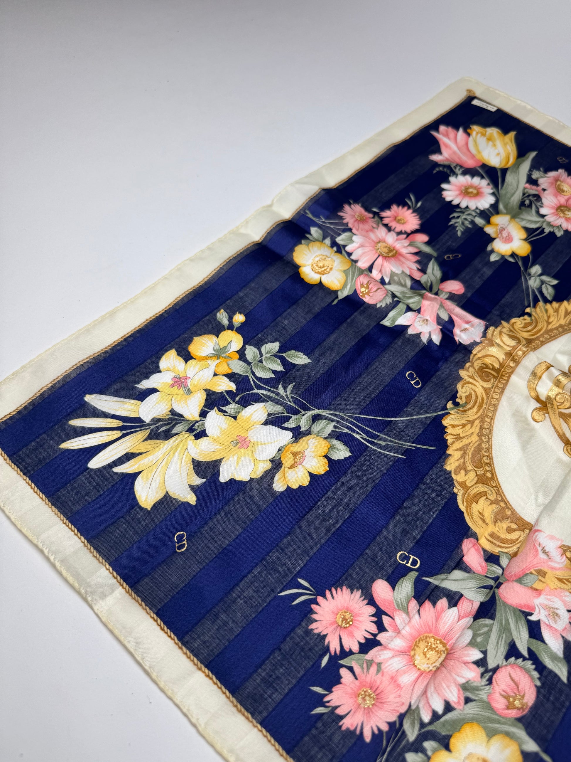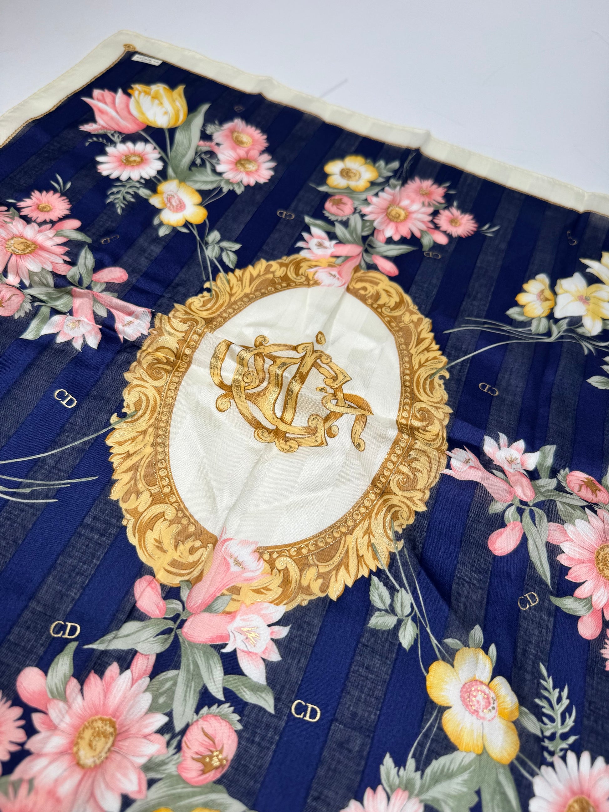 DIOR Vintage Scarf. This chic accessory is finely crafted of navy cotton and silk with a beige border. The design features pink, yellow, and white flowers along with a golden Dior mirror displaying the Dior logo. A nod to Dior’s heritage of elegance and femininity, such motifs reflect the brand’s timeless dedication to beauty and detail.