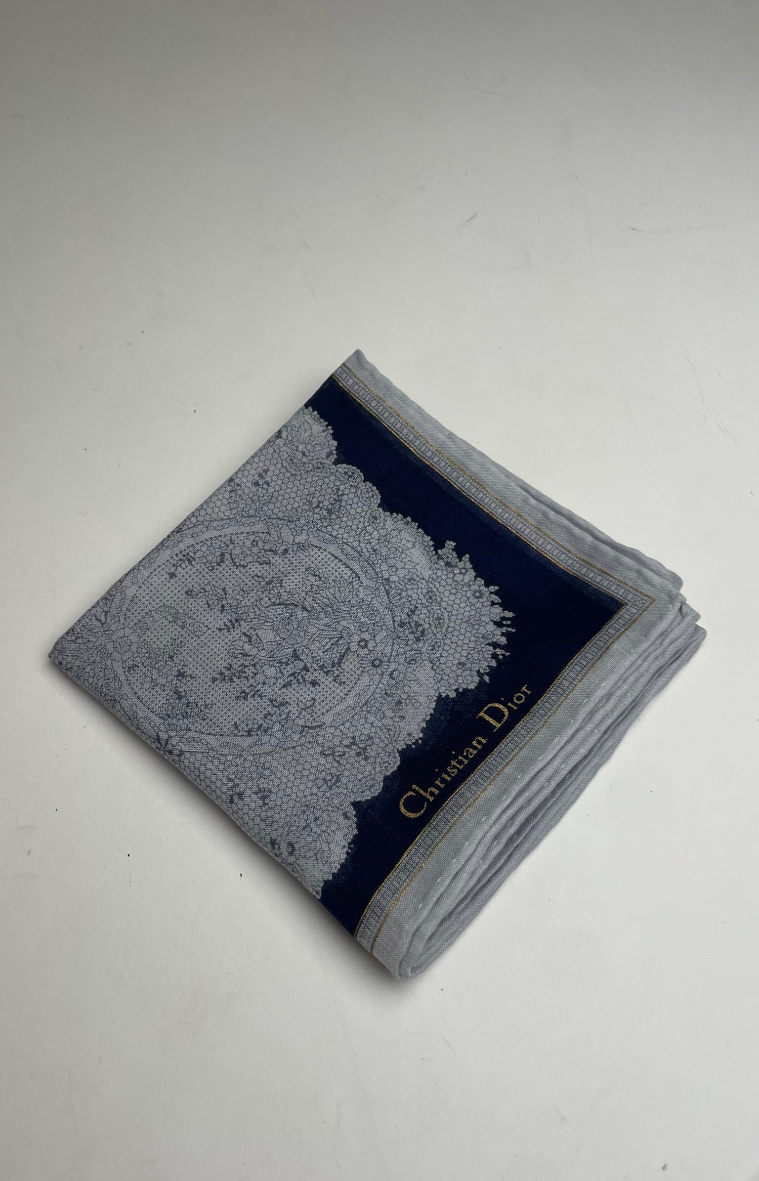 DIOR Vintage Logo Monogram Scarf. This elegant scarf is designed with a sophisticated three-part layout, featuring a subtle grey border, followed by a black section, a grey-silver patterned area, and a white center detailed with a Dior logo monogram. Crafted from a silk and cotton blend, it is finished with a gold-tone Dior signature at the corner.