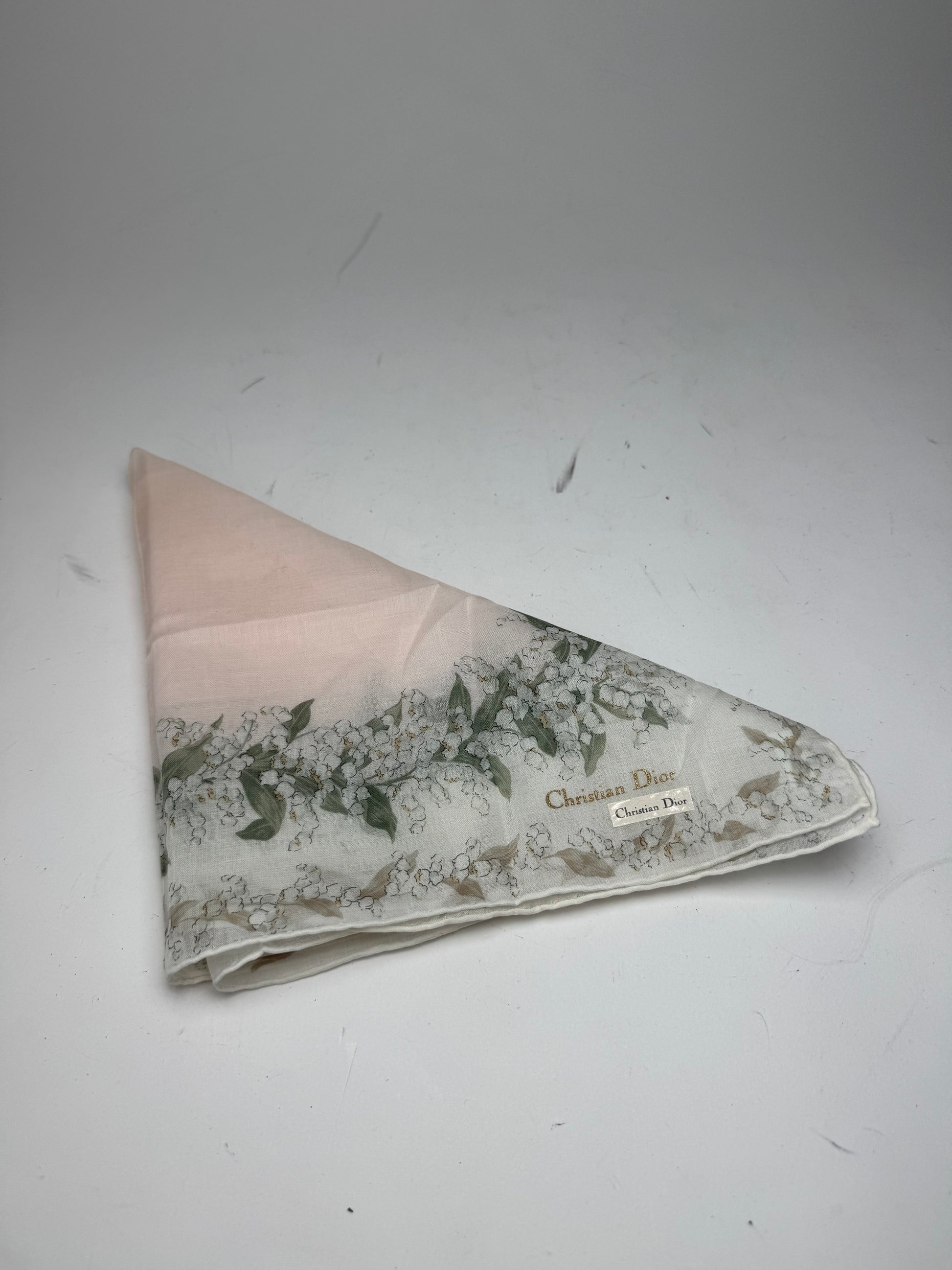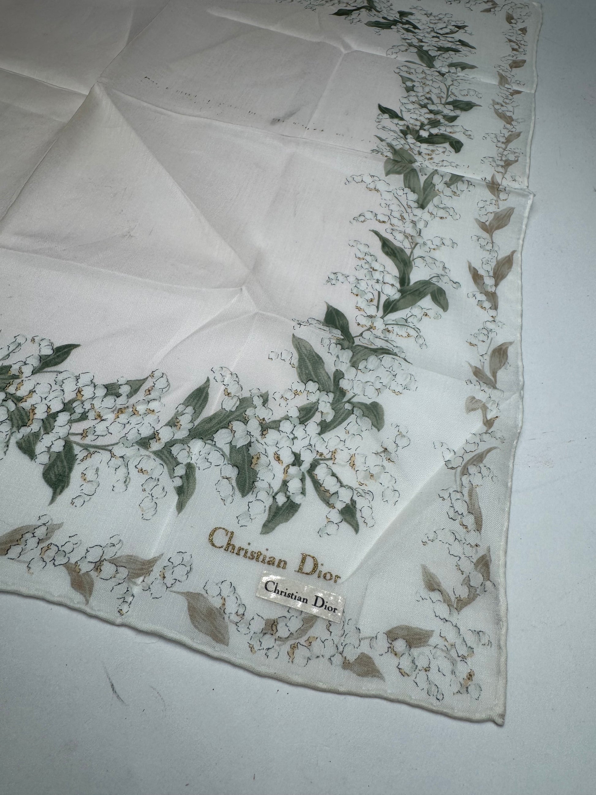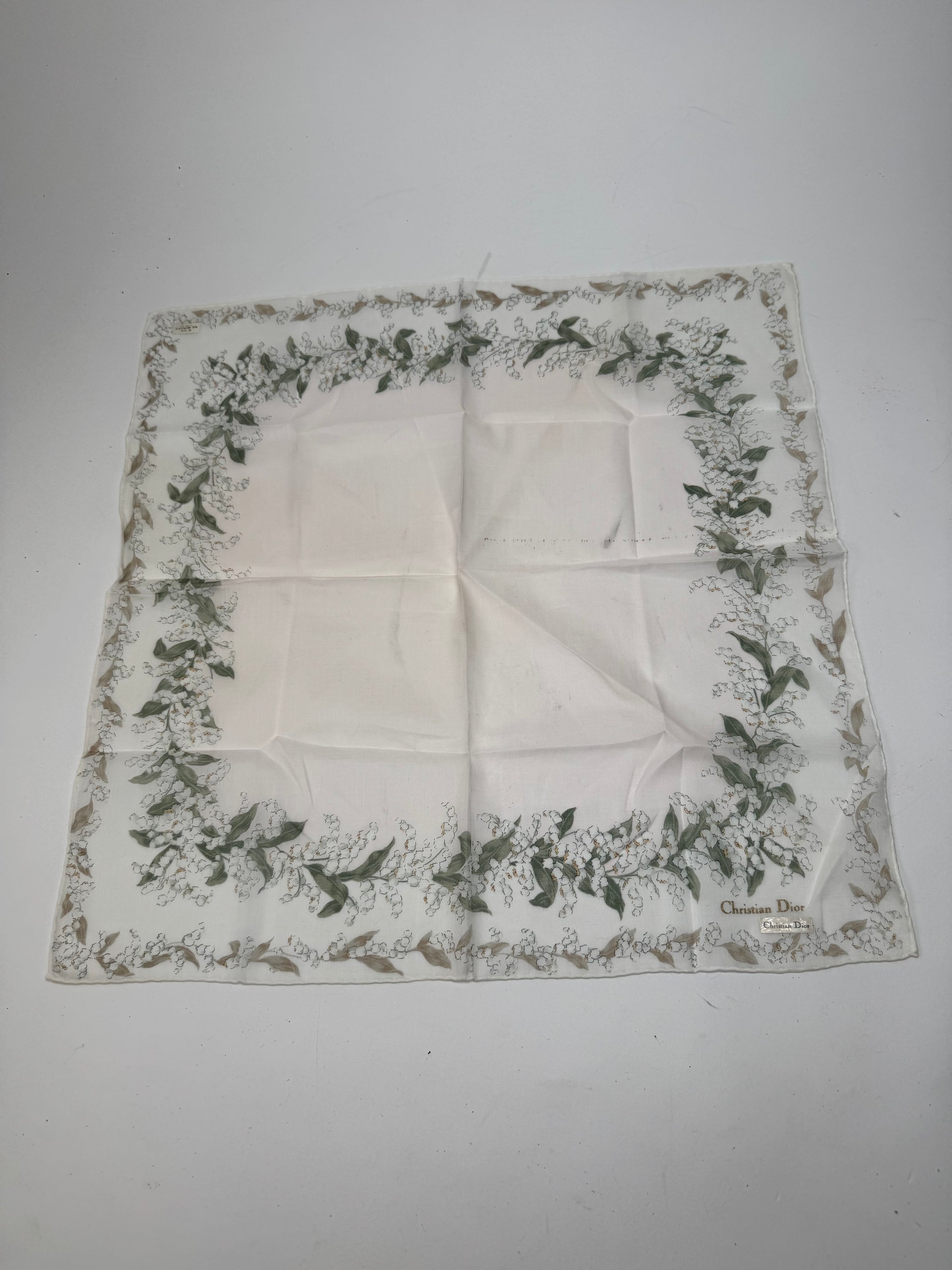 This vintage scarf is finely crafted of a white base fabric decorated with green and white floral motifs. Made of a cotton and silk blend, it reflects the house of Dior’s timeless elegance and refined Parisian style.