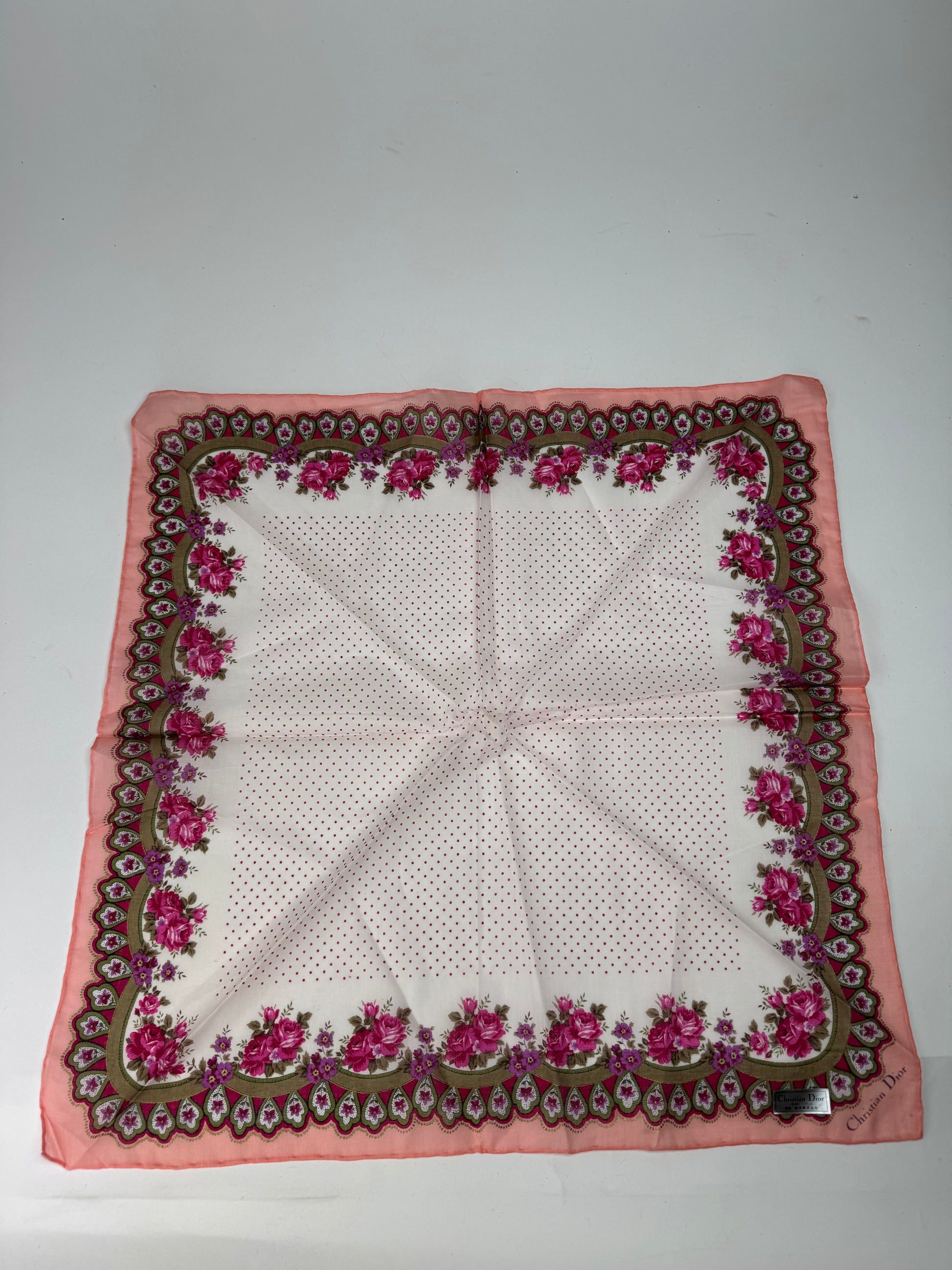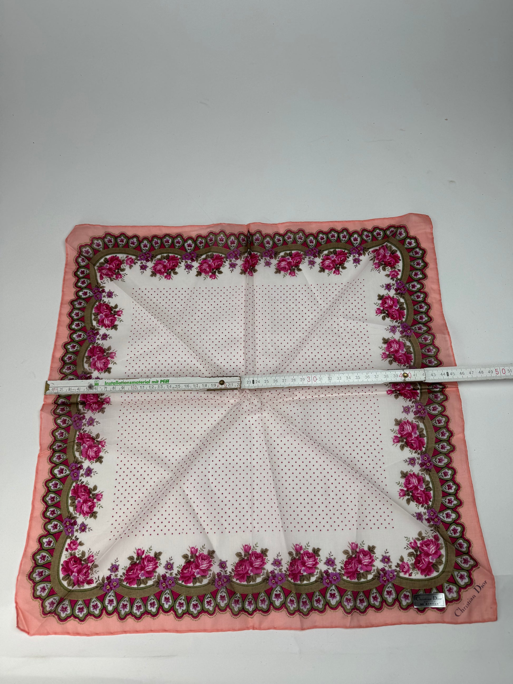 This vintage unisex scarf features a pink base adorned with purple polka dots and a floral-patterned border. Crafted from a luxurious blend of silk and canvas, it measures 45.5 cm in both width and height. The scarf is in very good condition, showing only normal signs of wear.