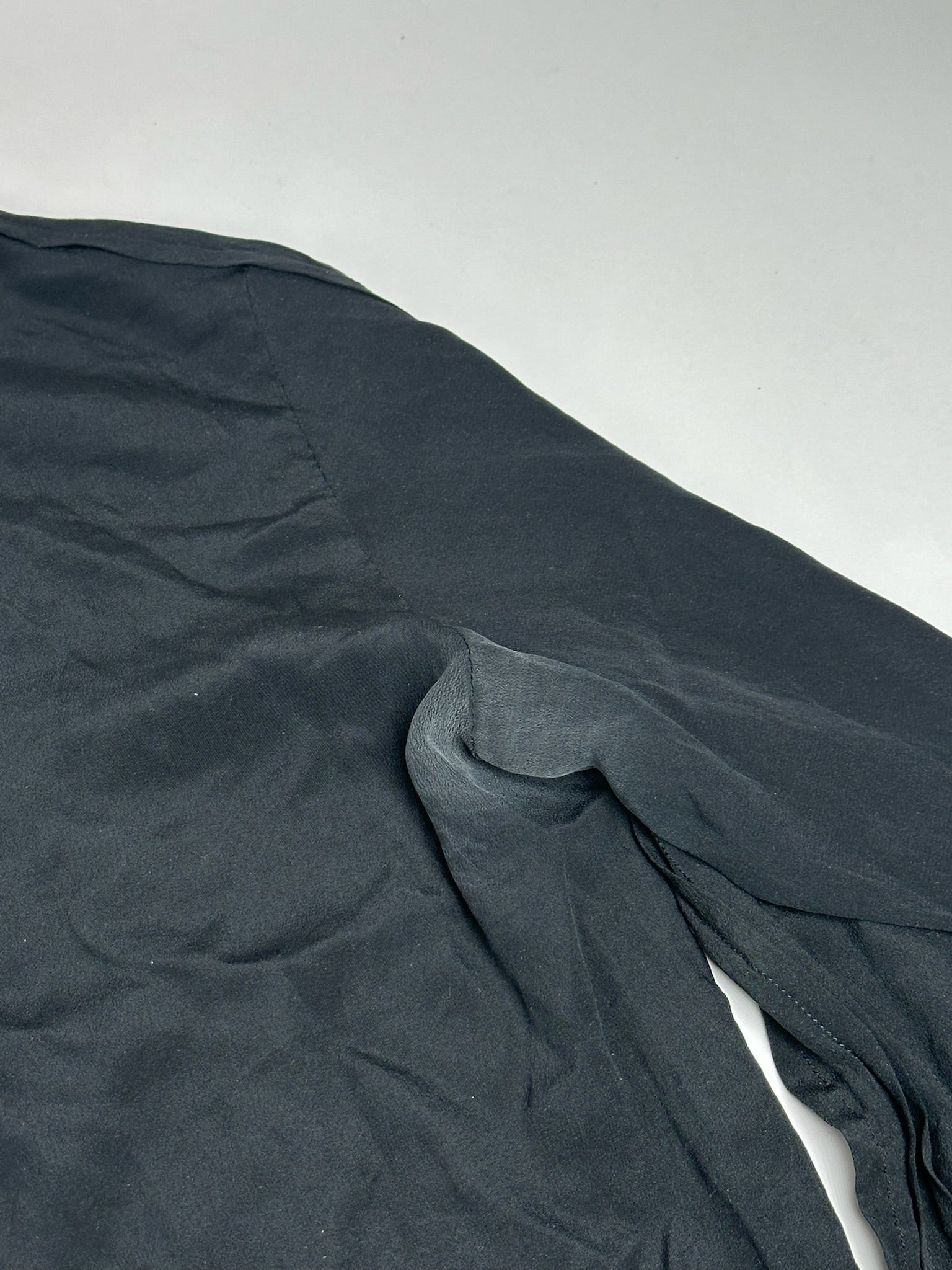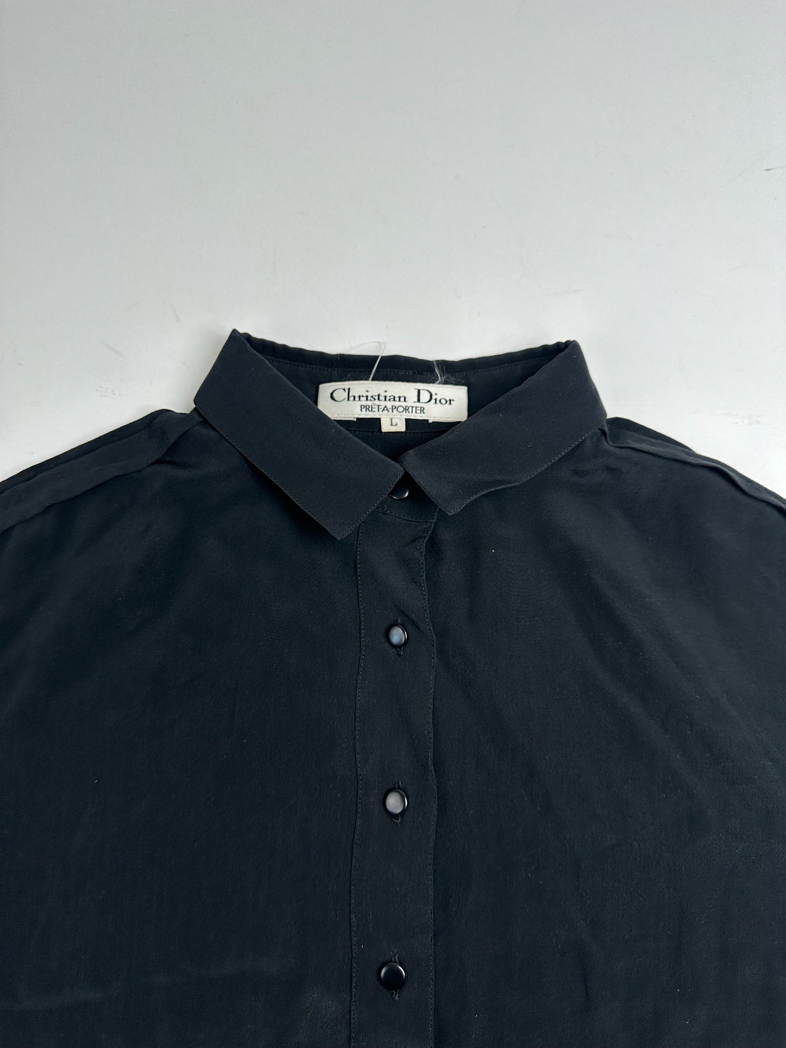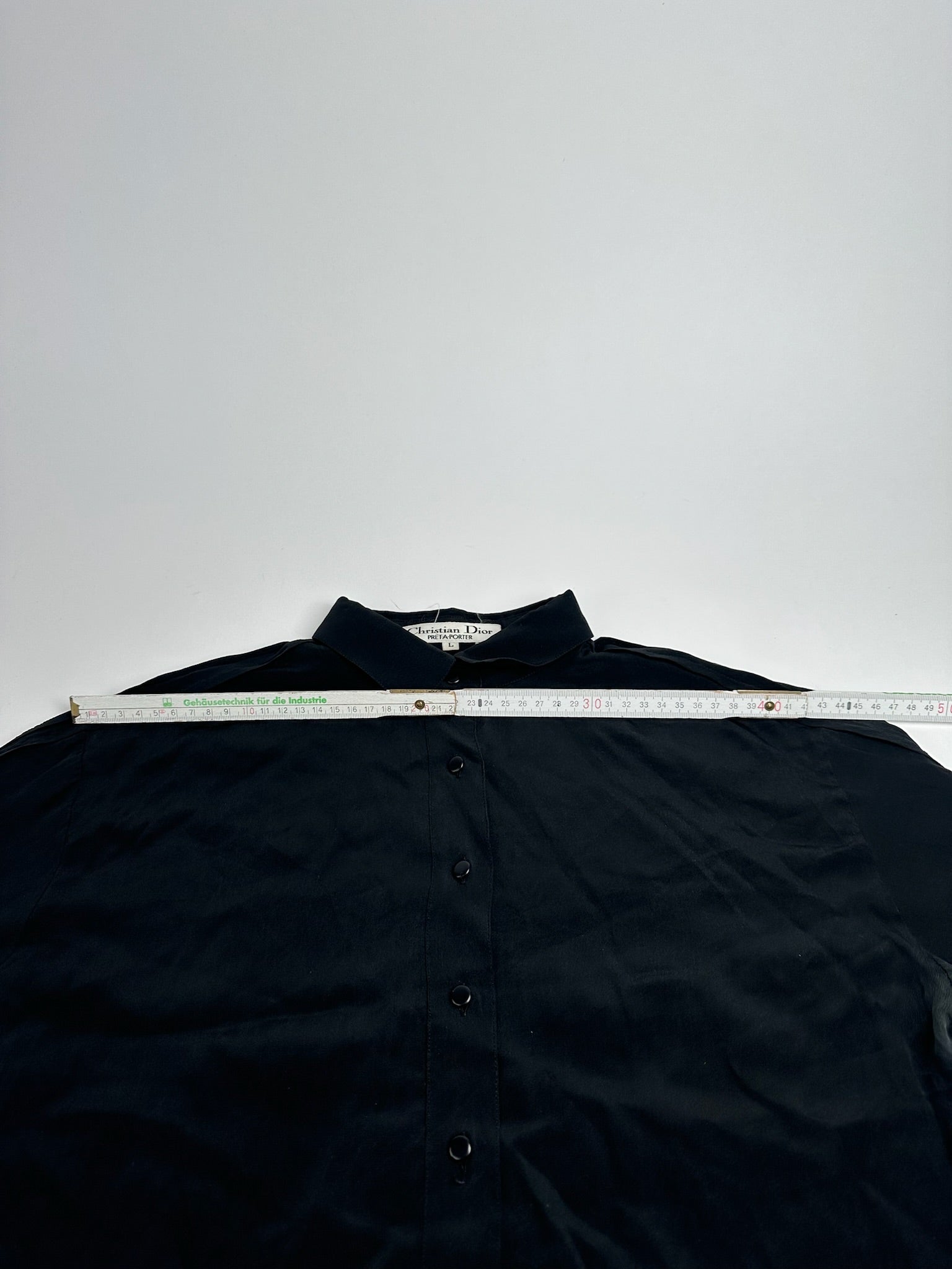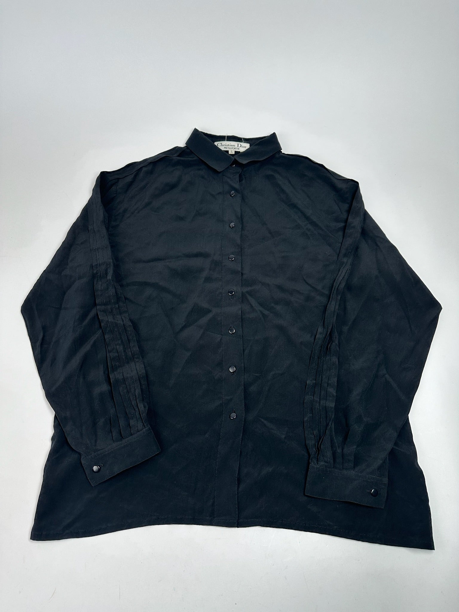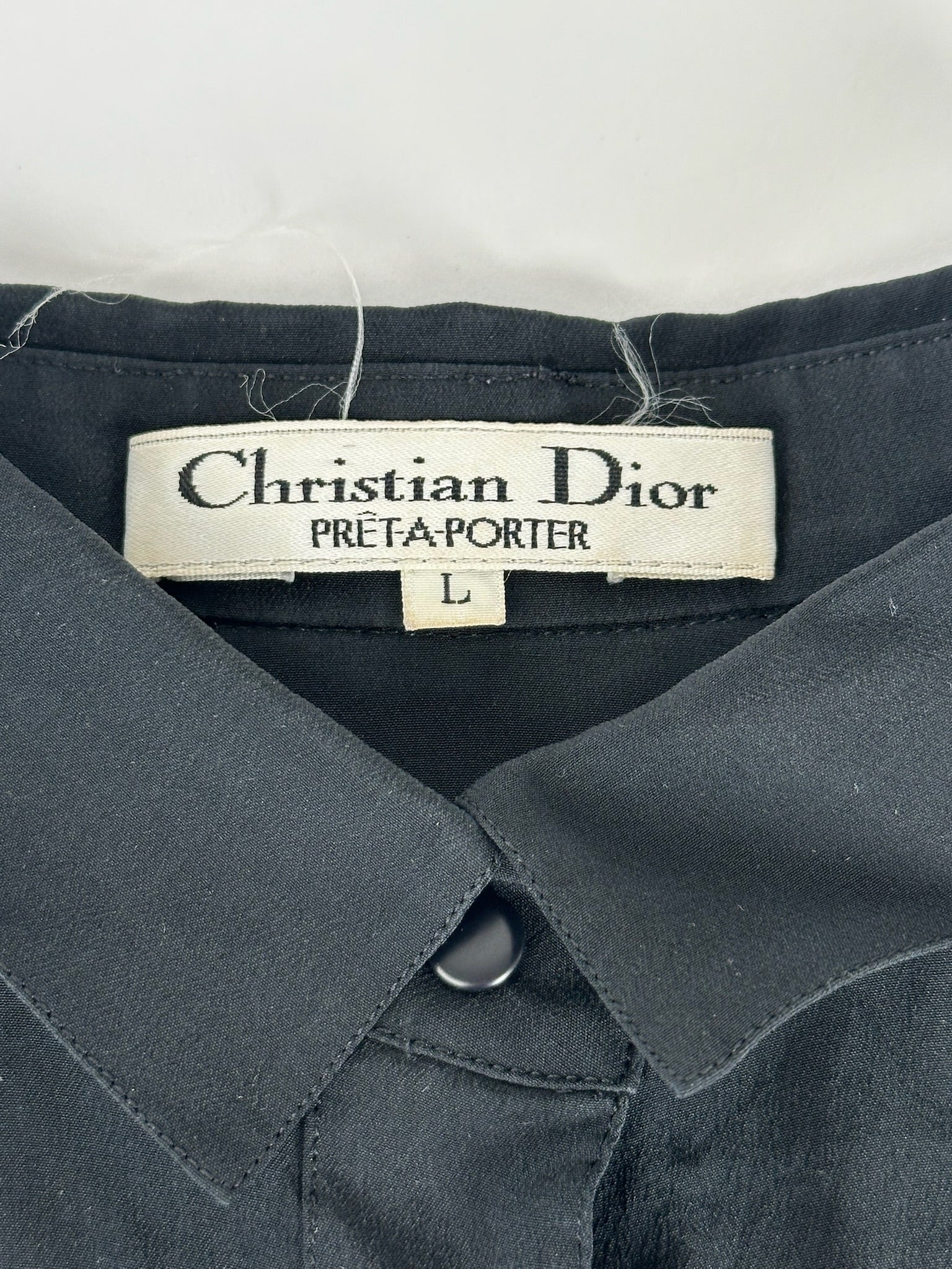 DIOR Vintage Silk Blouse. This chic blouse is finely crafted of black silk with fringe-like appliqués along the sleeves. It features black plastic buttons and a slightly elastic structure.