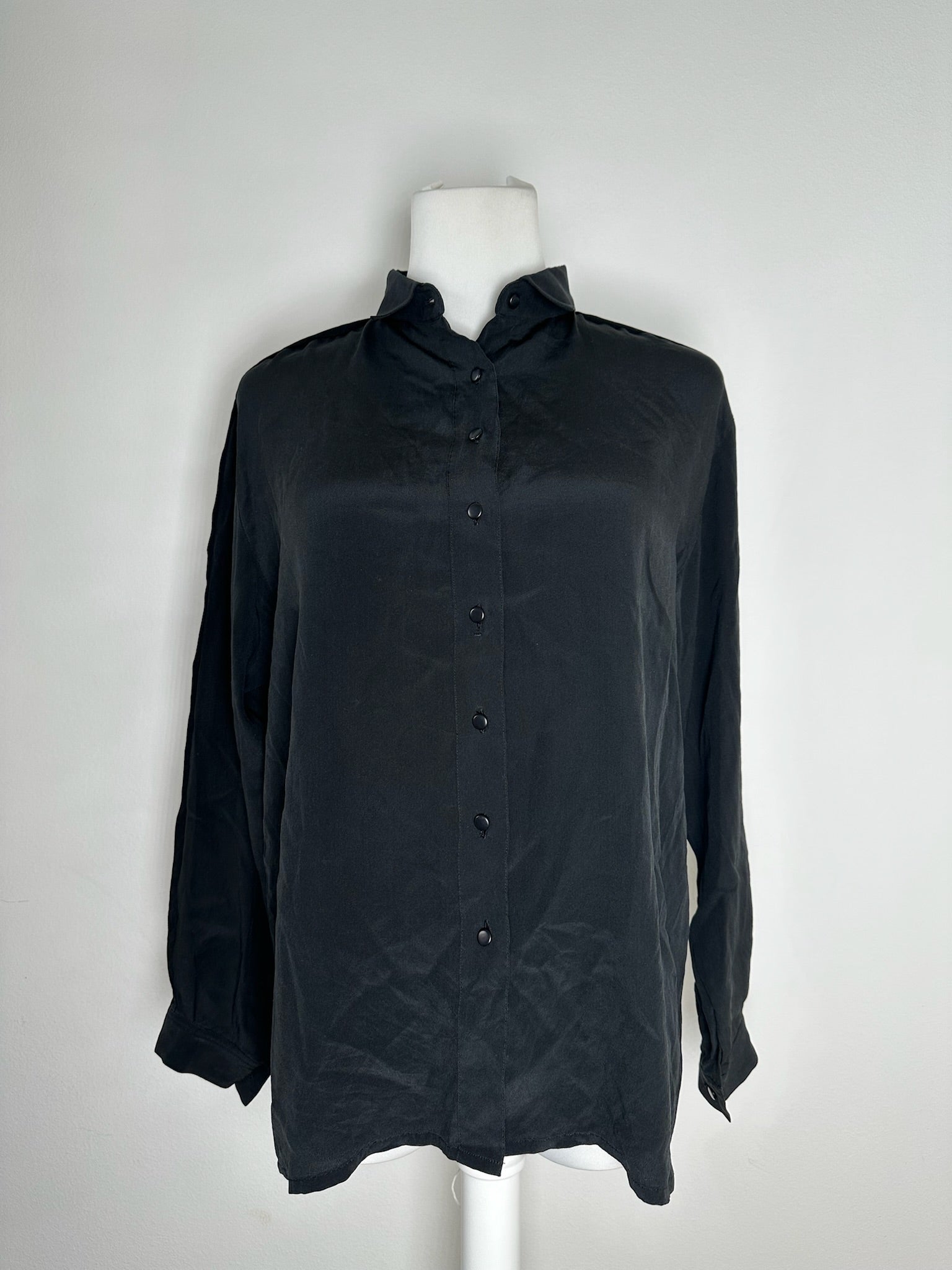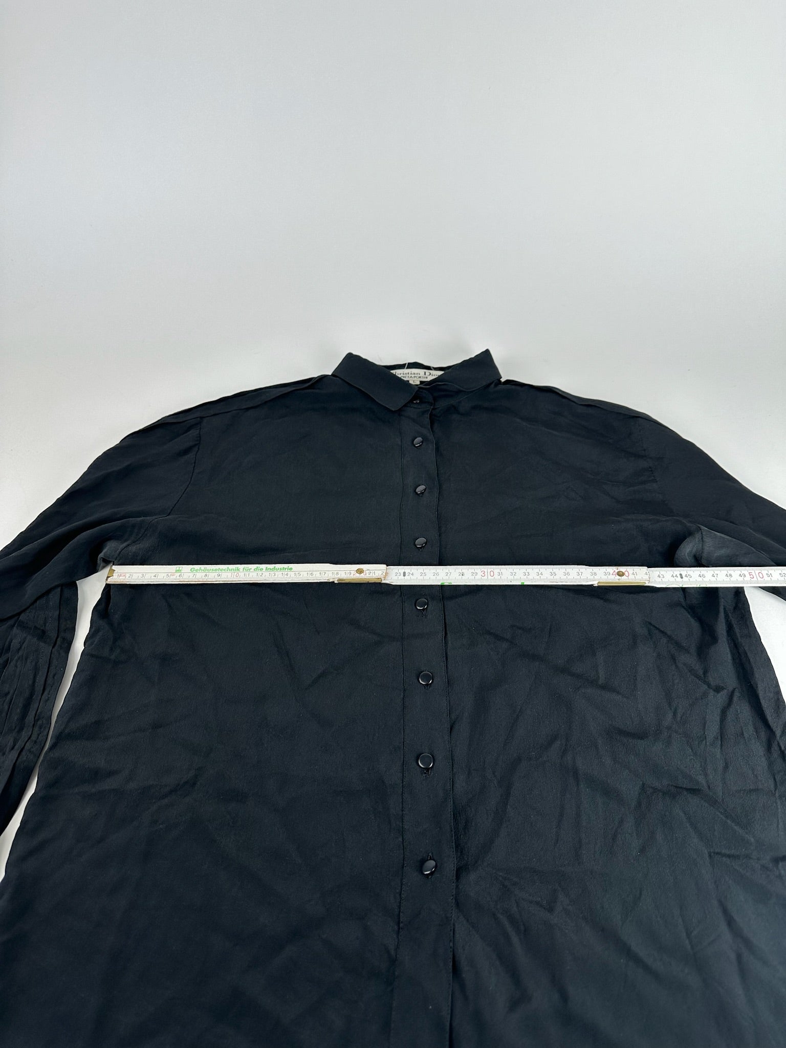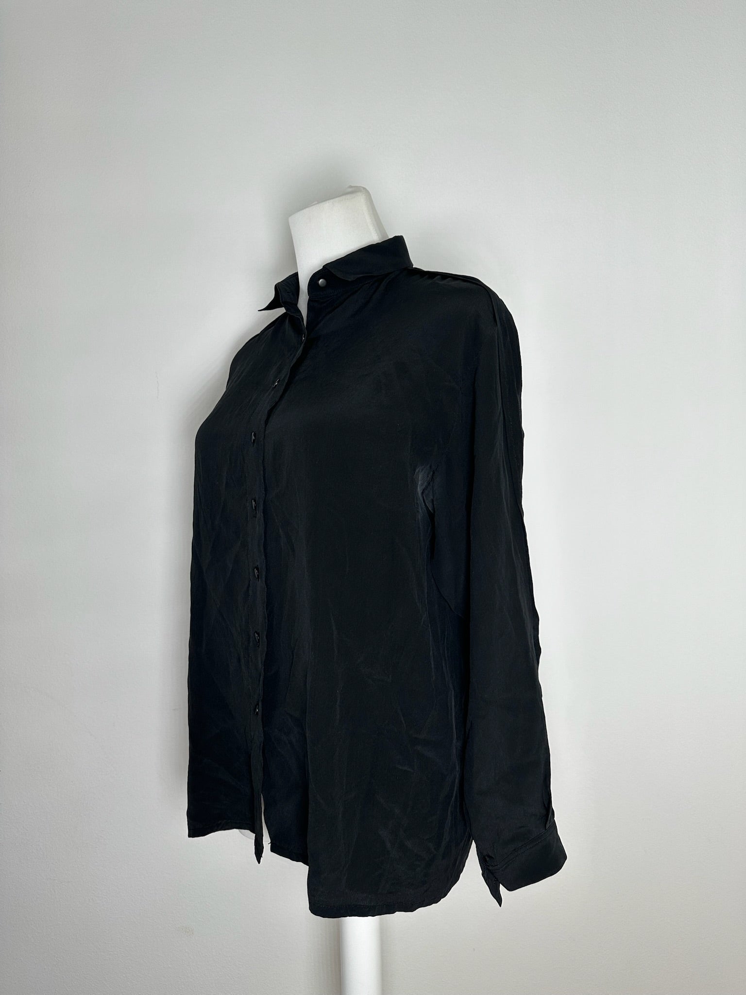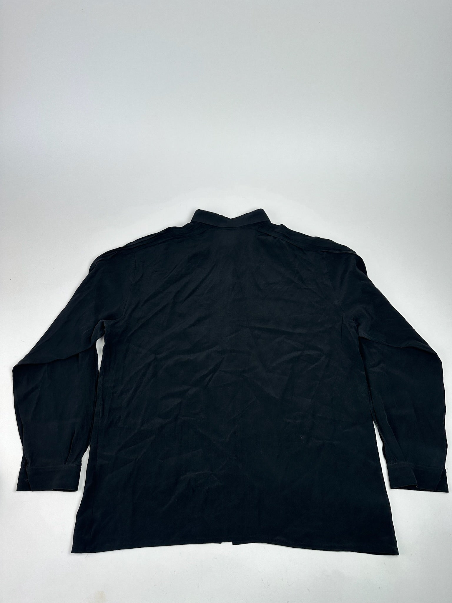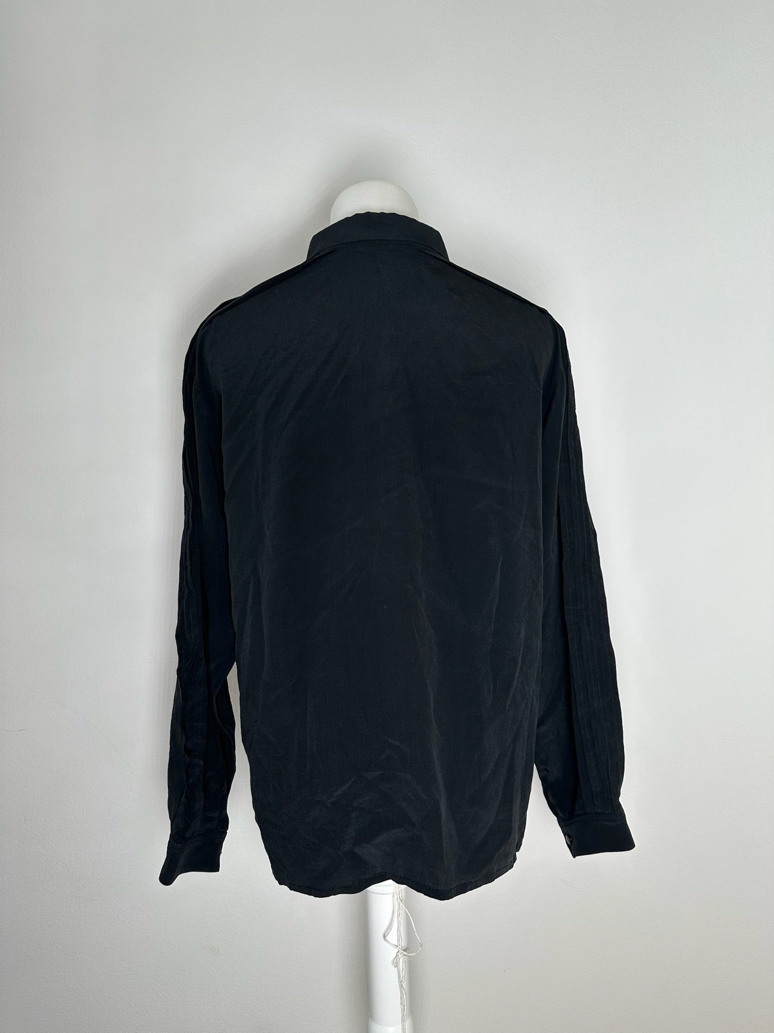 DIOR Vintage Silk Blouse. This chic blouse is finely crafted of black silk with fringe-like appliqués along the sleeves. It features black plastic buttons and a slightly elastic structure.