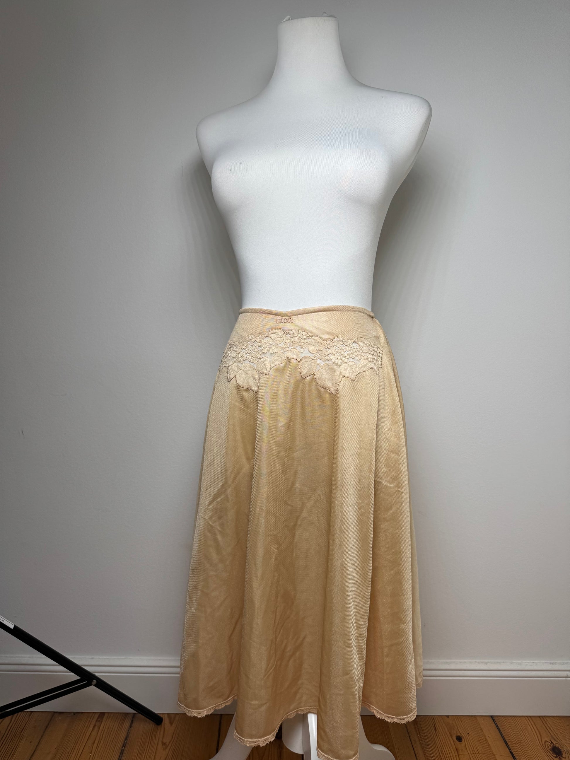 This chic skirt is finely crafted of golden polyester-silk blend fabric and features a floral logo design with the Dior signature on the front.