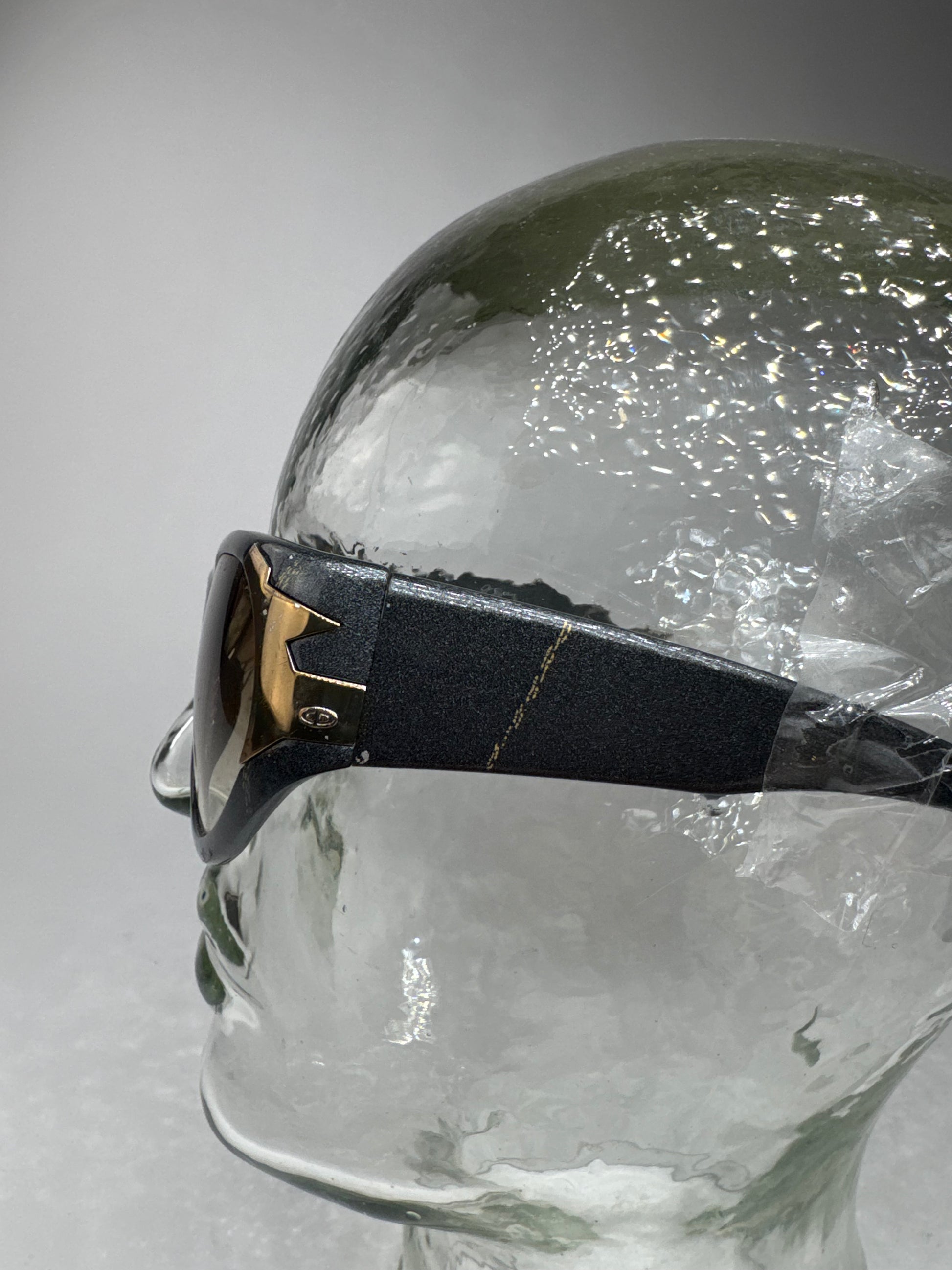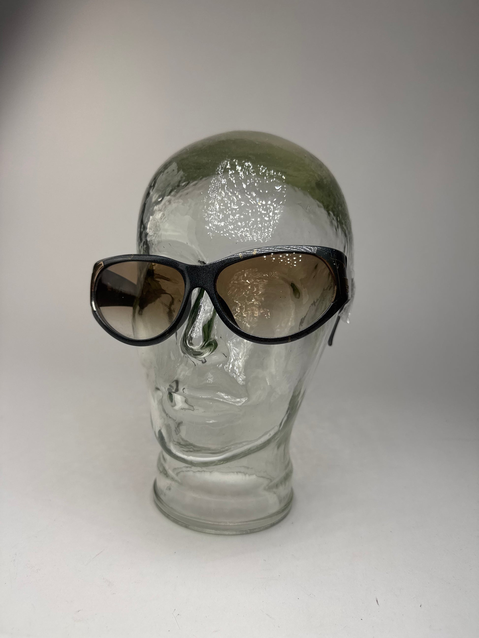 CHRISTIAN DIOR Vintage Black & Gold Sunglasses. These stylish vintage sunglasses are crafted from black marbled acetate and gold-tone steel. The temples are adorned with iconic Christian Dior logo appliqués in gold-tone metal. The curved arms measure 11 cm, and the total width is 14 cm. The lenses are lightly tinted in orange. A true vintage piece, this model was made in Germany.