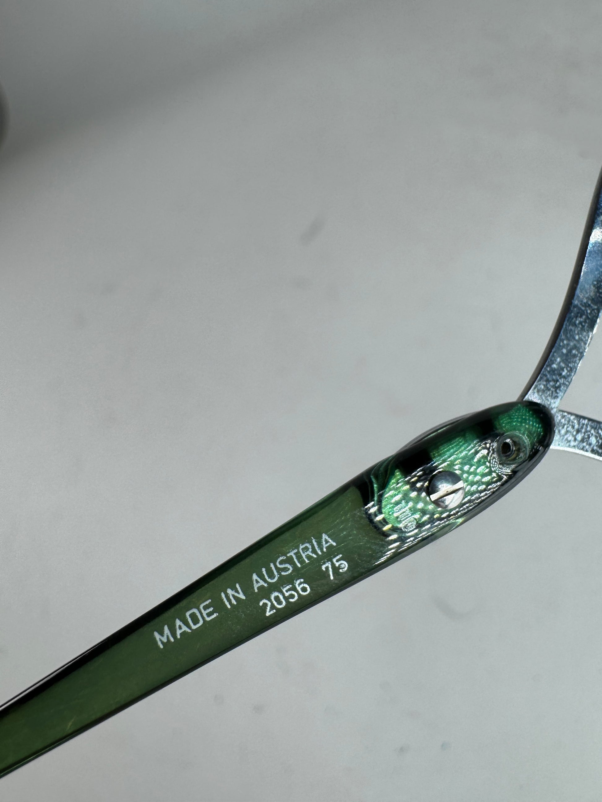 These vintage Dior sunglasses feature a silver-tone steel frame paired with deep green acetate temples and blue-tinted lenses, creating a sleek and understated futuristic look. Crafted in Austria, they offer a lightweight fit with a refined unisex silhouette. Comes with a grey leather case.