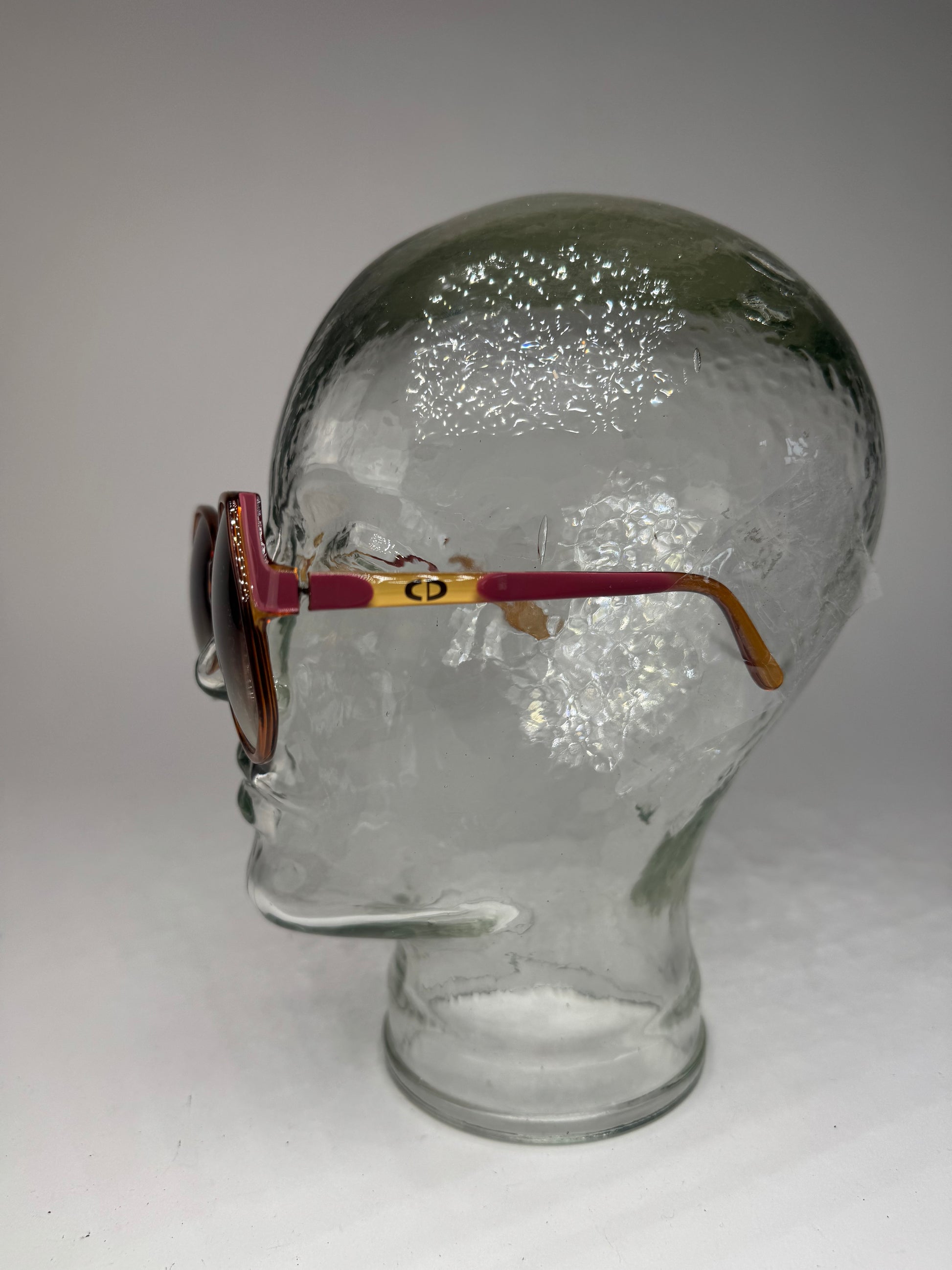 DIOR Multicolor Vintage Sunglasses. These striking unisex sunglasses are crafted from a bold mix of purple, yellow, and orange acetate. They feature dark brown tinted lenses and signature "CD" appliqués on the temples.