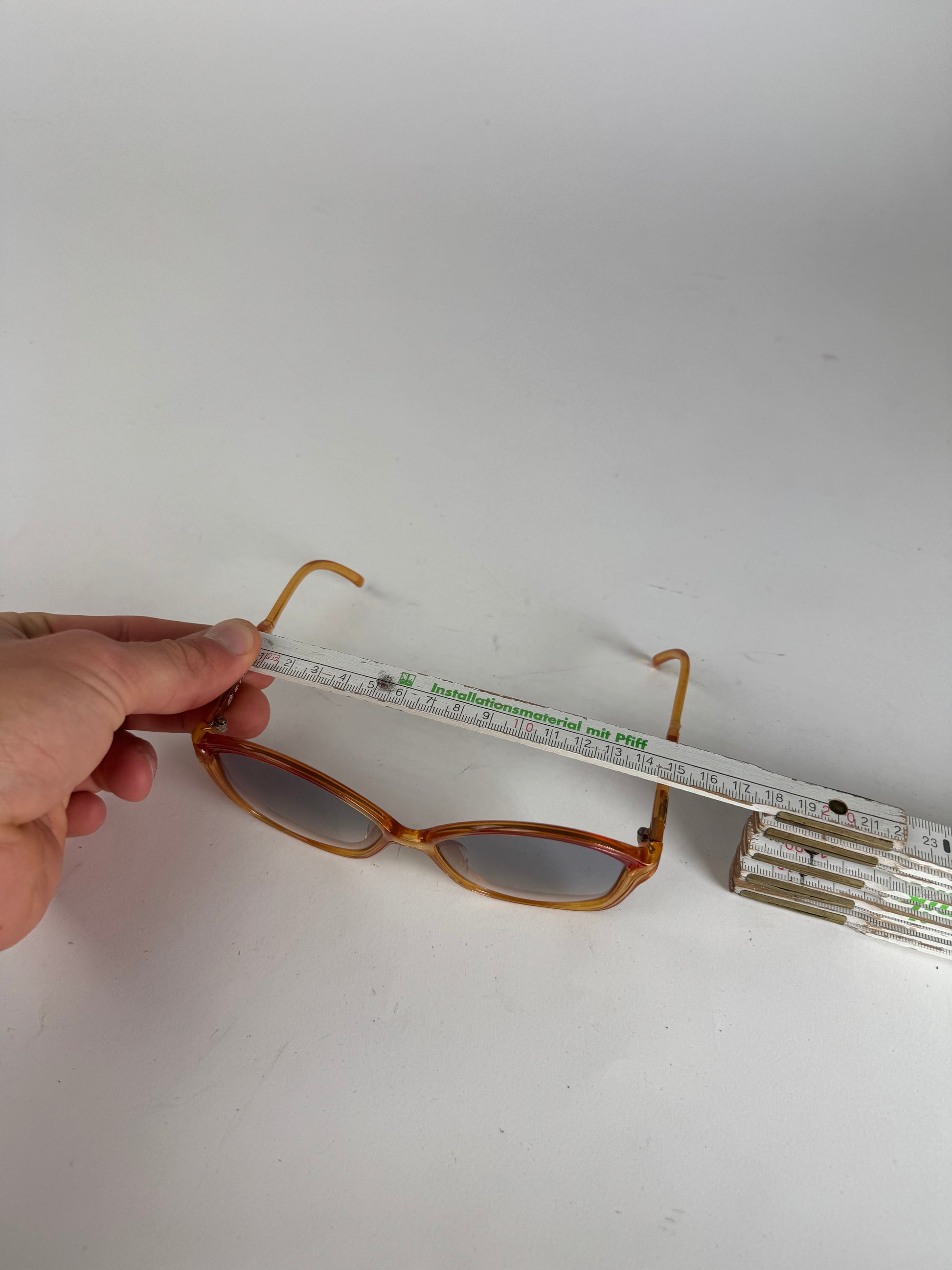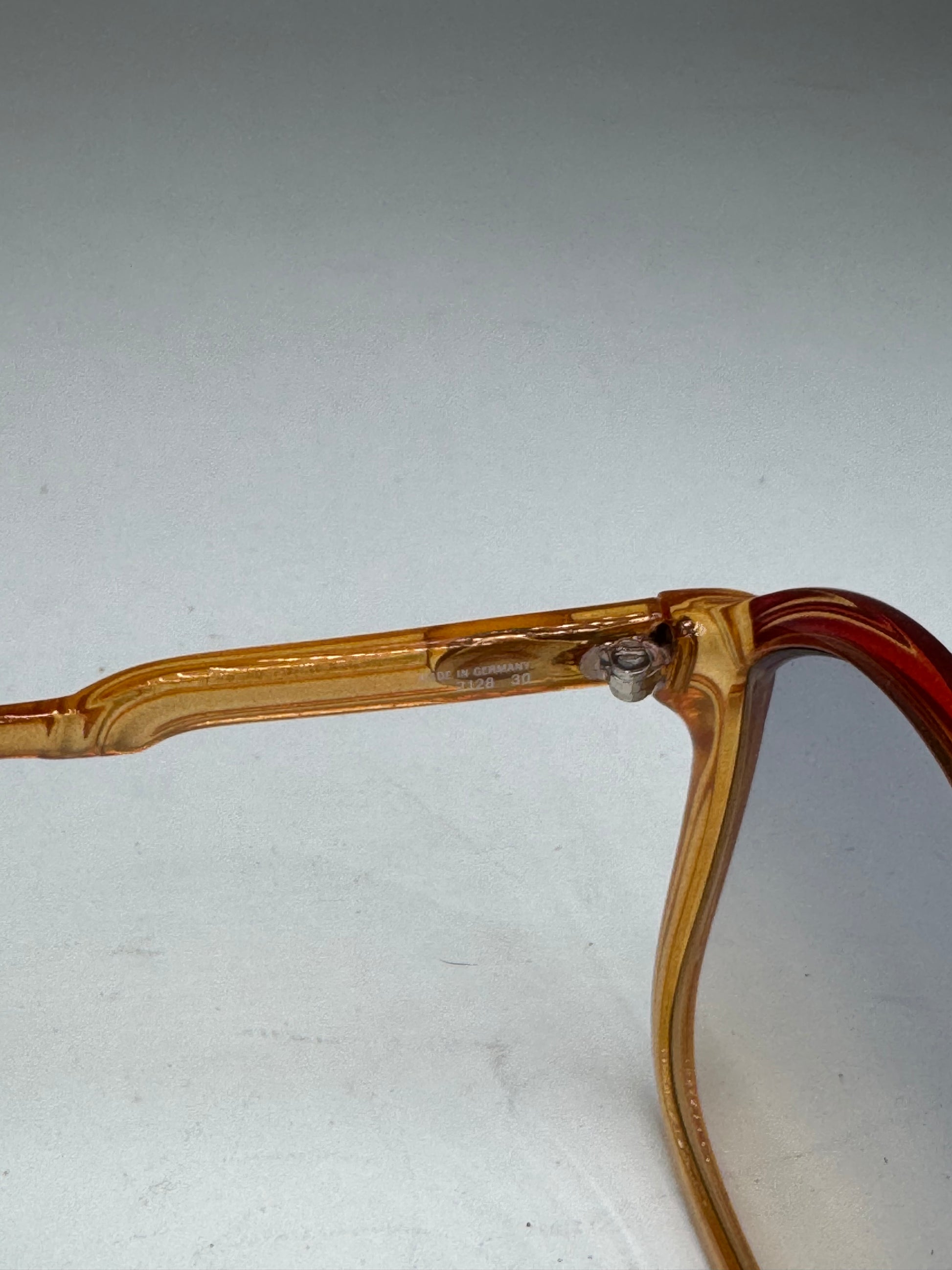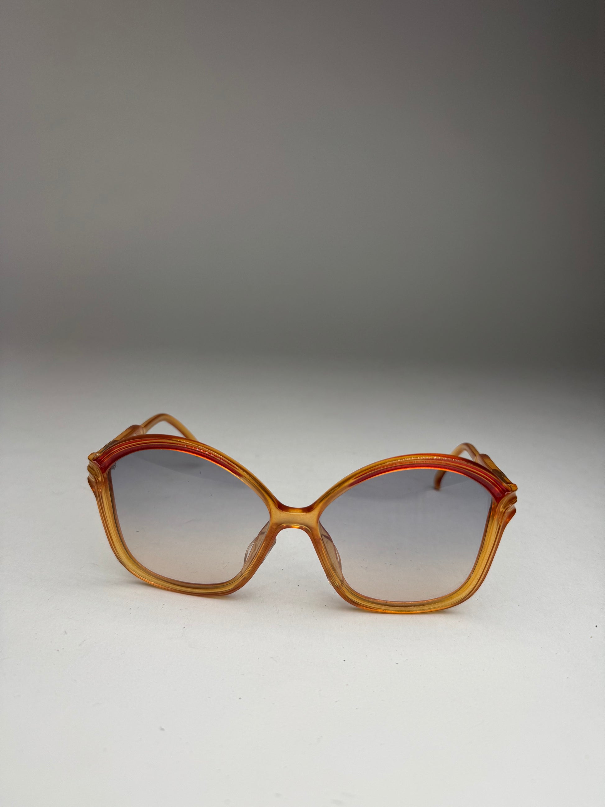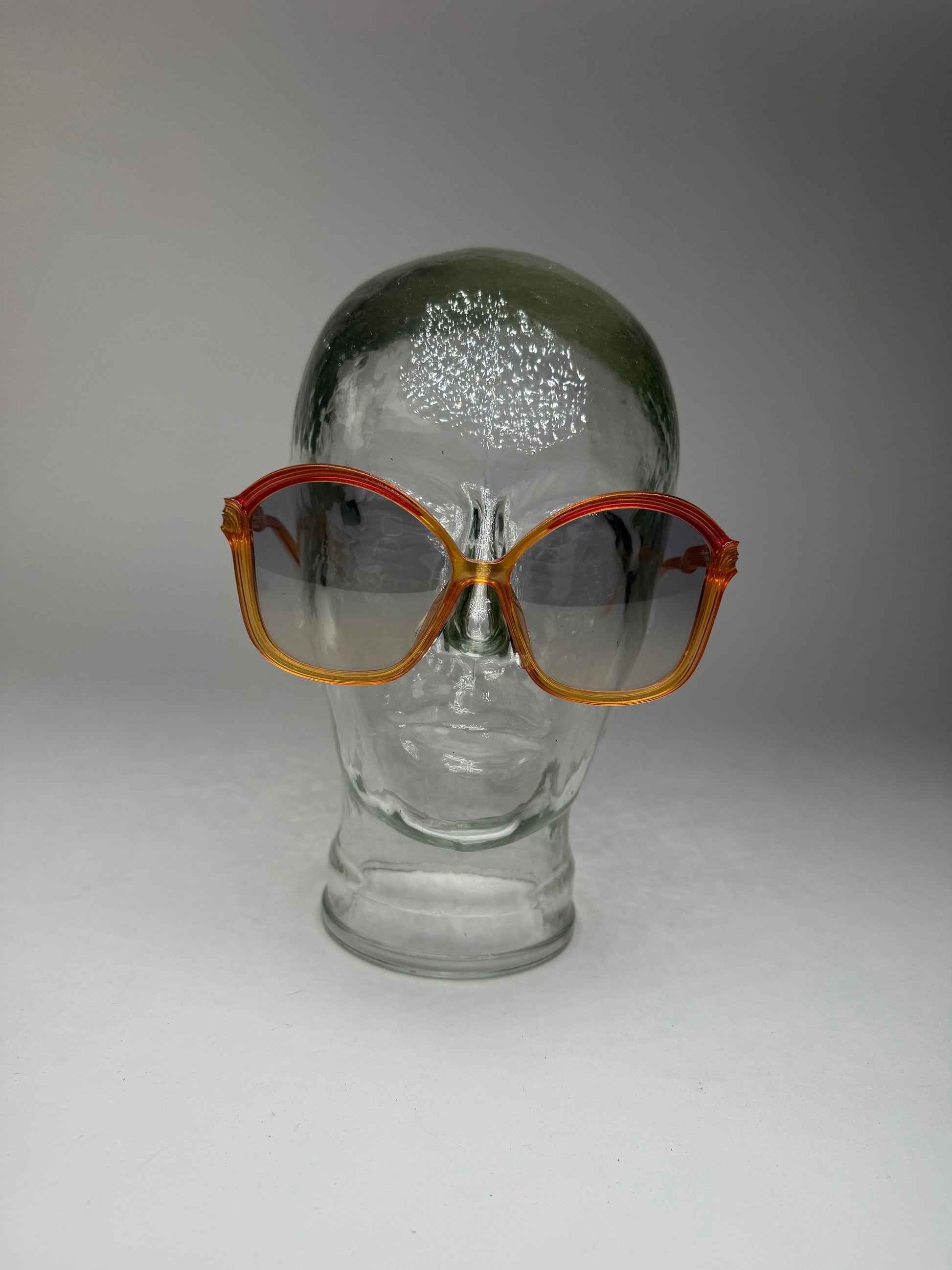 These vintage oversized sunglasses from Dior feature an orange acetate frame with 'CD' appliqué on the temples. The lenses are blue-tinted, offering a stylish contrast. Despite minor scratches, the sunglasses are in very good condition. Made in Germany. The sale includes a protective case.