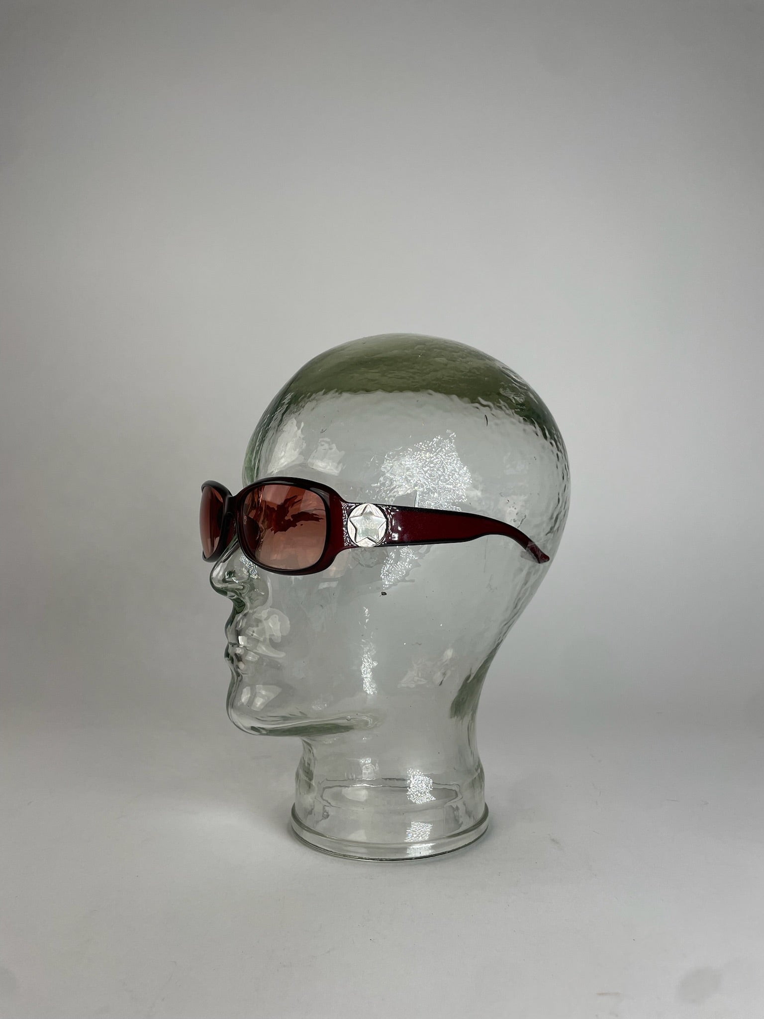 DIOR Vintage Sunglasses. These chic sunglasses are crafted of purple plastic and feature a unique pearlescent star application on the side for an eye-catching statement detail. They are finished with purple-tinted lenses and a sleek silhouette.
