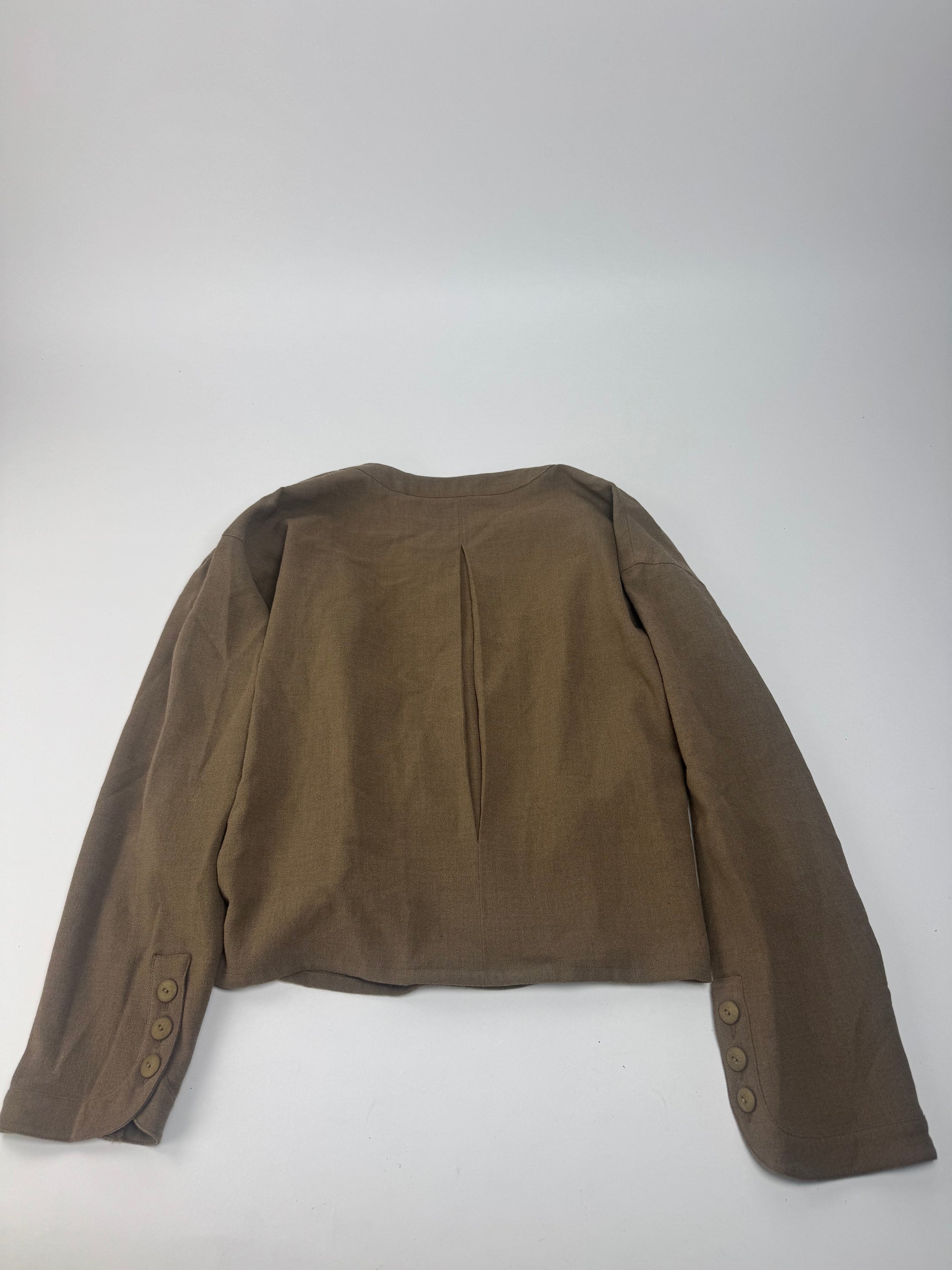 This chic vintage pullover is finely crafted of dark brown silk-like fabric. The design features an asymmetrical deep collar and brown plastic buttons, offering a refined yet feminine silhouette. The mannequin on the photos is wearing size 38/M.