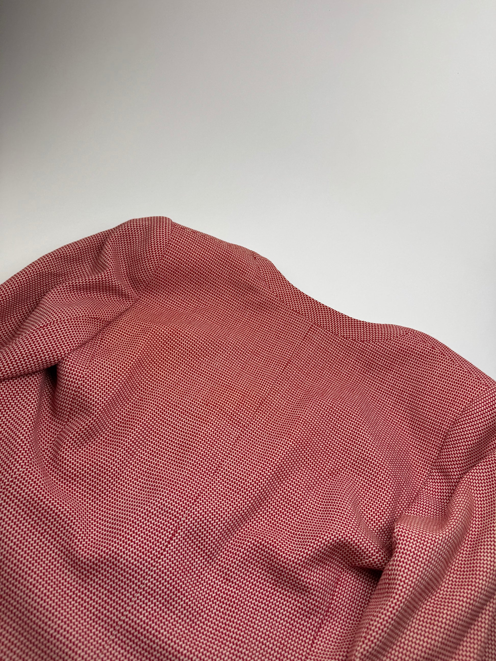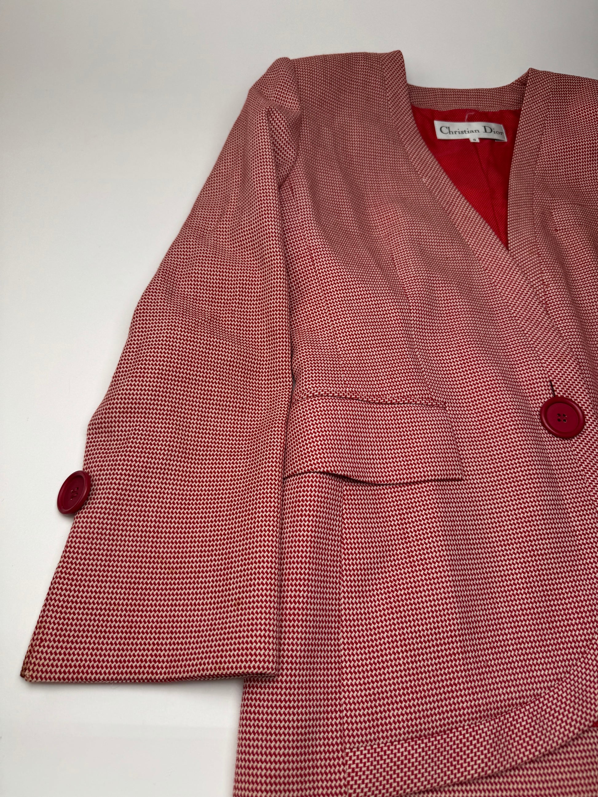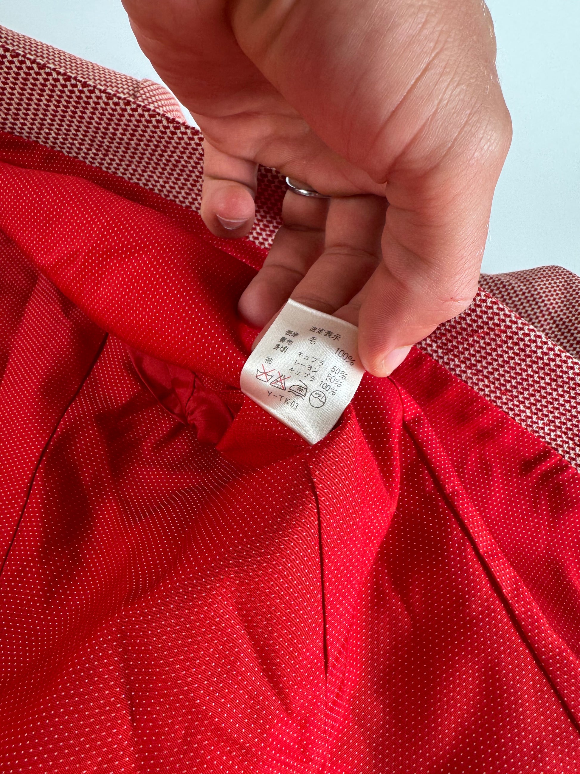 This chic coat is finely crafted of white wool with an all-over red dot pattern. It features red plastic buttons and a red canvas lining.