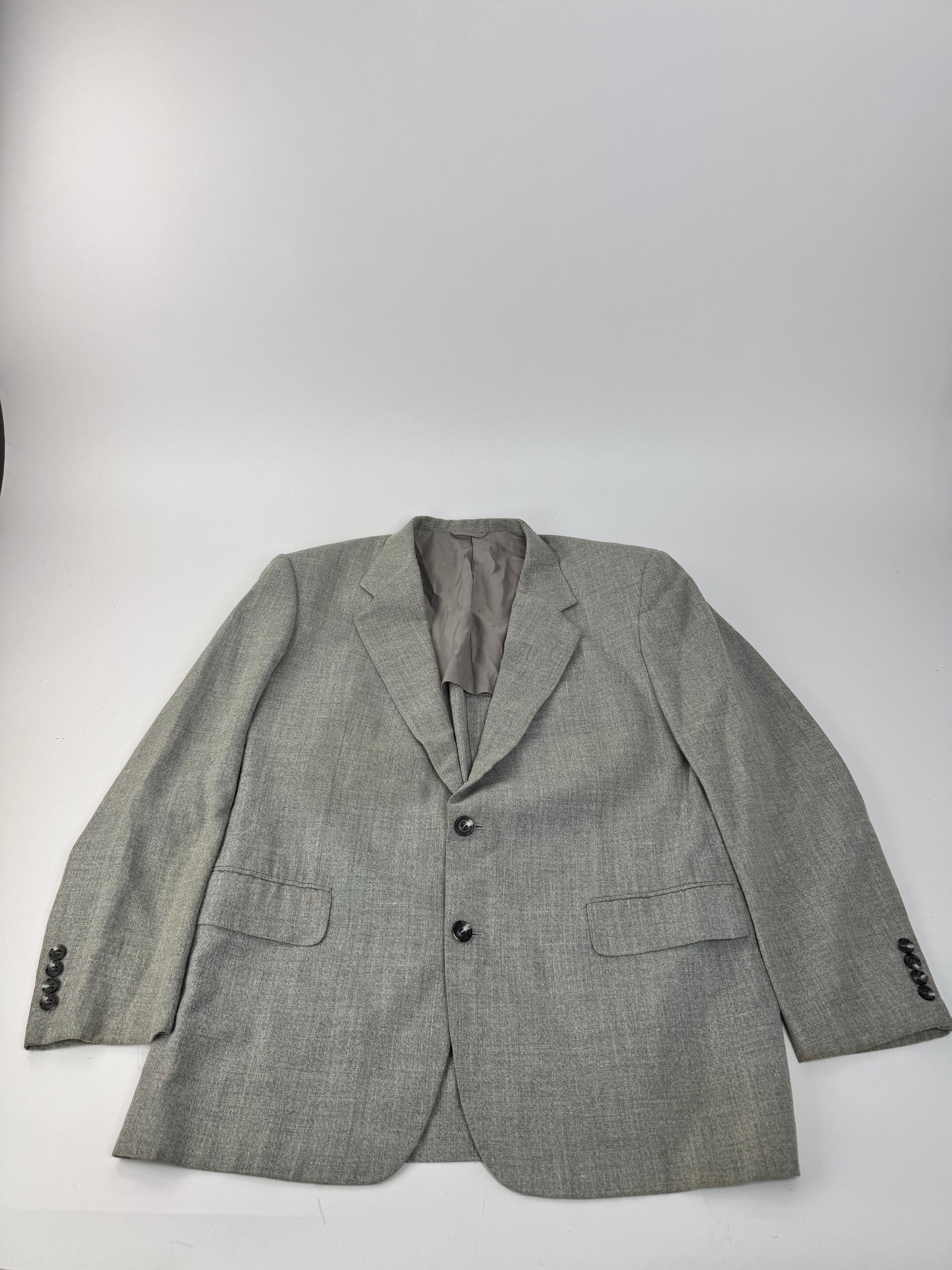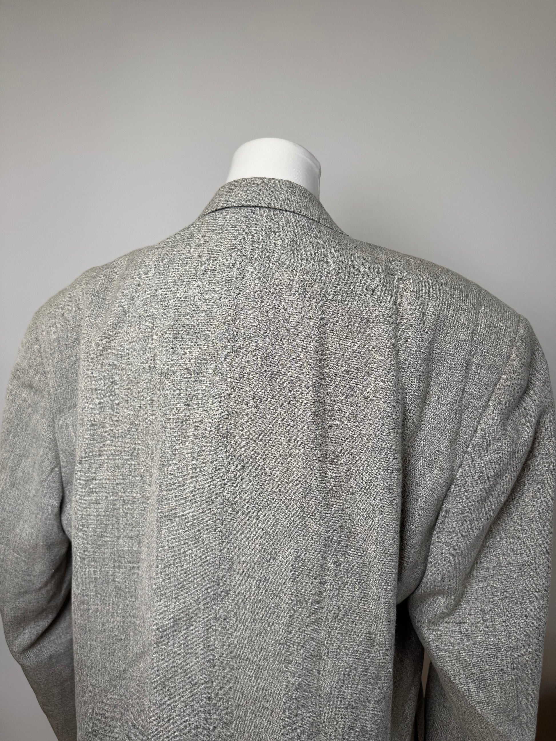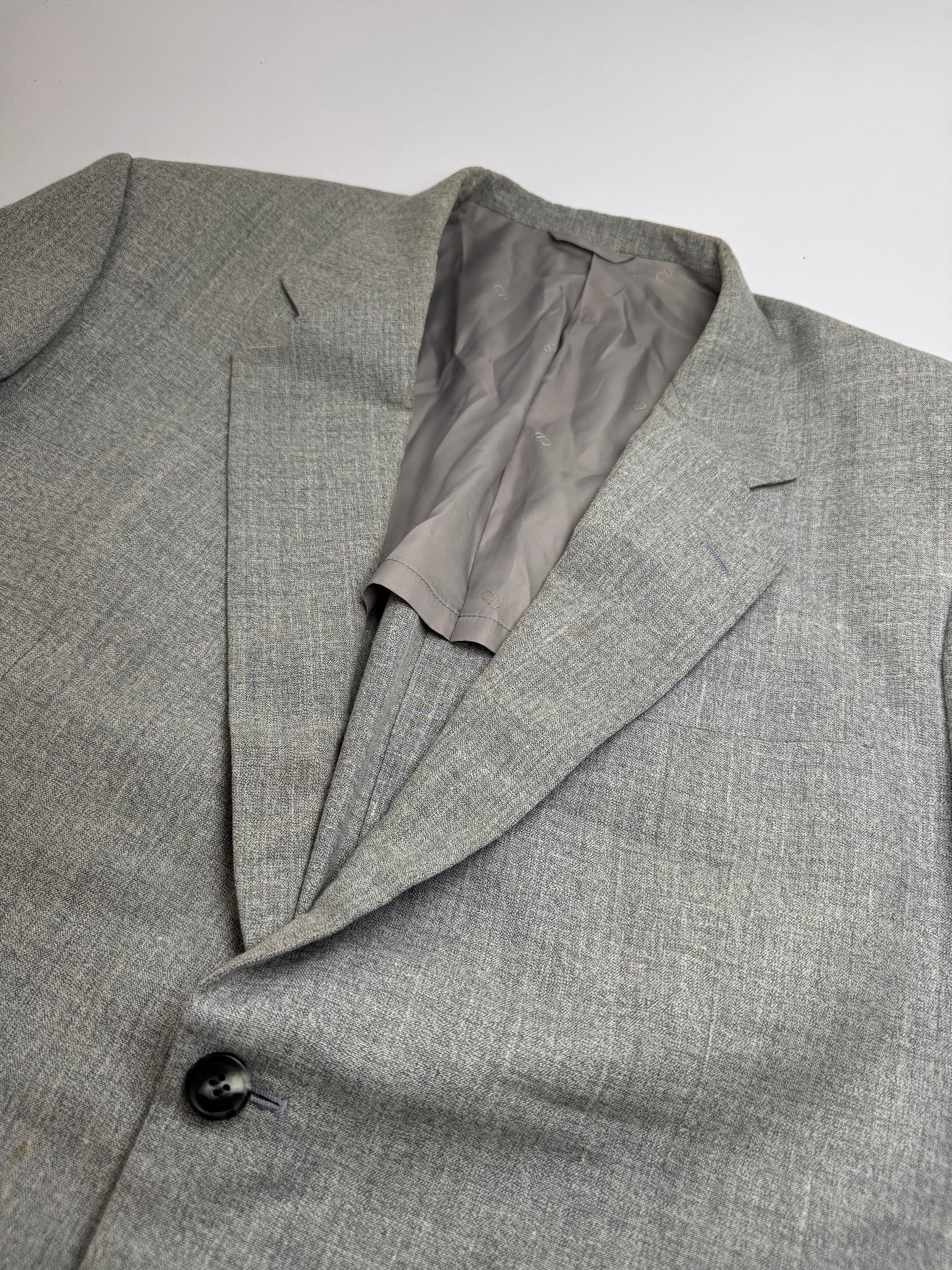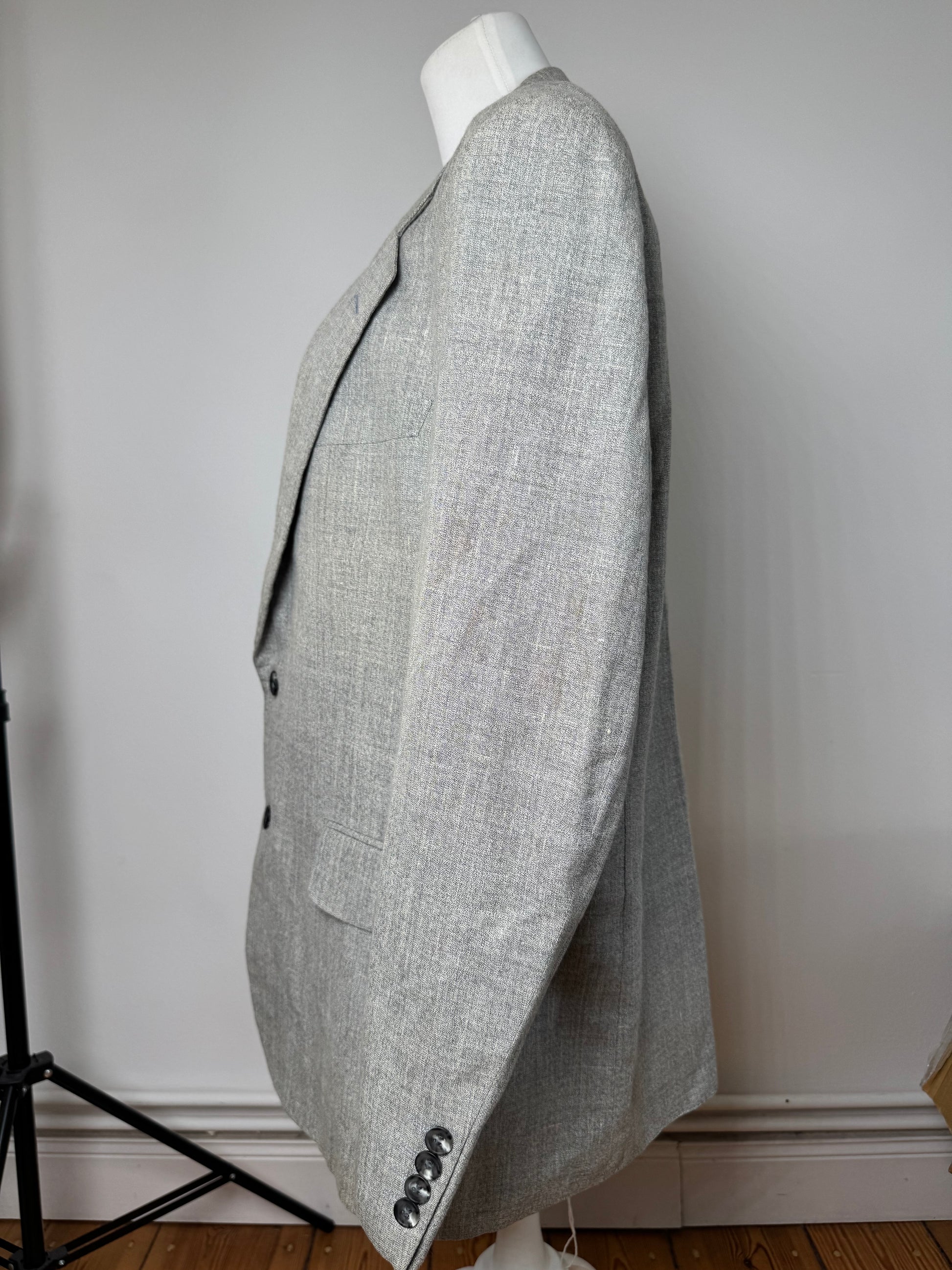 DIOR Vintage Linen Blazer. This refined vintage blazer is crafted from a grey-black linen fabric and features two black plastic front buttons, along with four matching buttons on each sleeve. The interior is lined with viscose for a smooth finish. Despite minor staining, the blazer remains in very good overall condition.