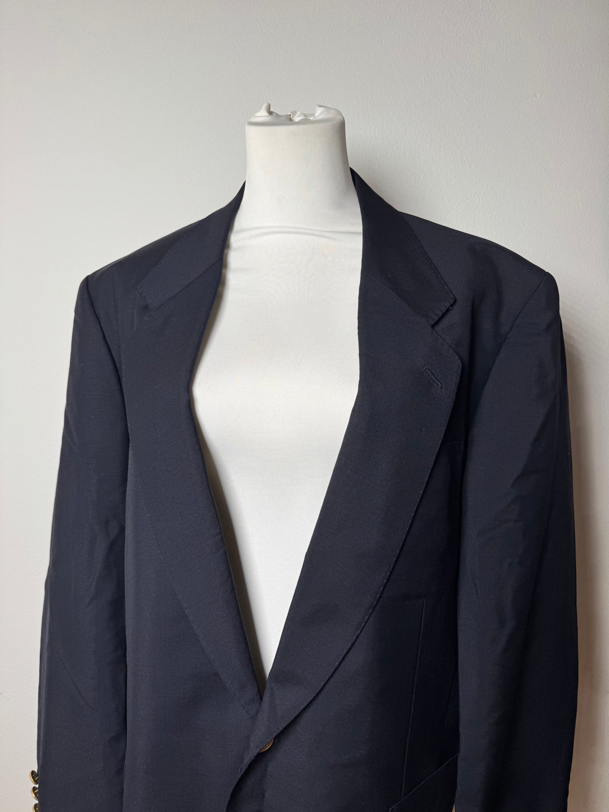 DIOR Vintage Navy Wool Blazer. This timeless blazer is finely crafted of navy wool. The piece features four gold-tone steel buttons on each sleeve and two matching buttons on the front.