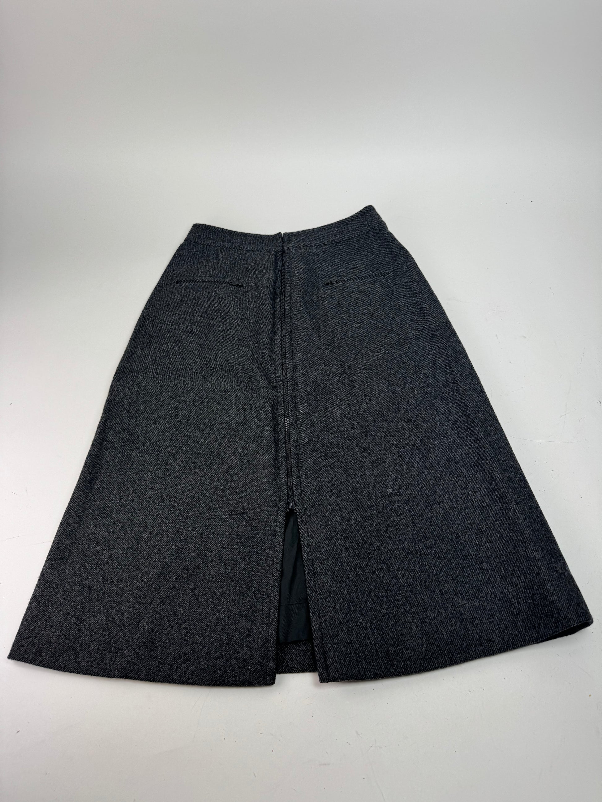 This elegant vintage skirt is finely crafted from soft anthracite wool and features two front zip pockets and a large central zipper closure that opens the skirt fully in front. The interior is lined with black viscose, ensuring a smooth and comfortable fit. The mannequin on the photo wears size 38/M.