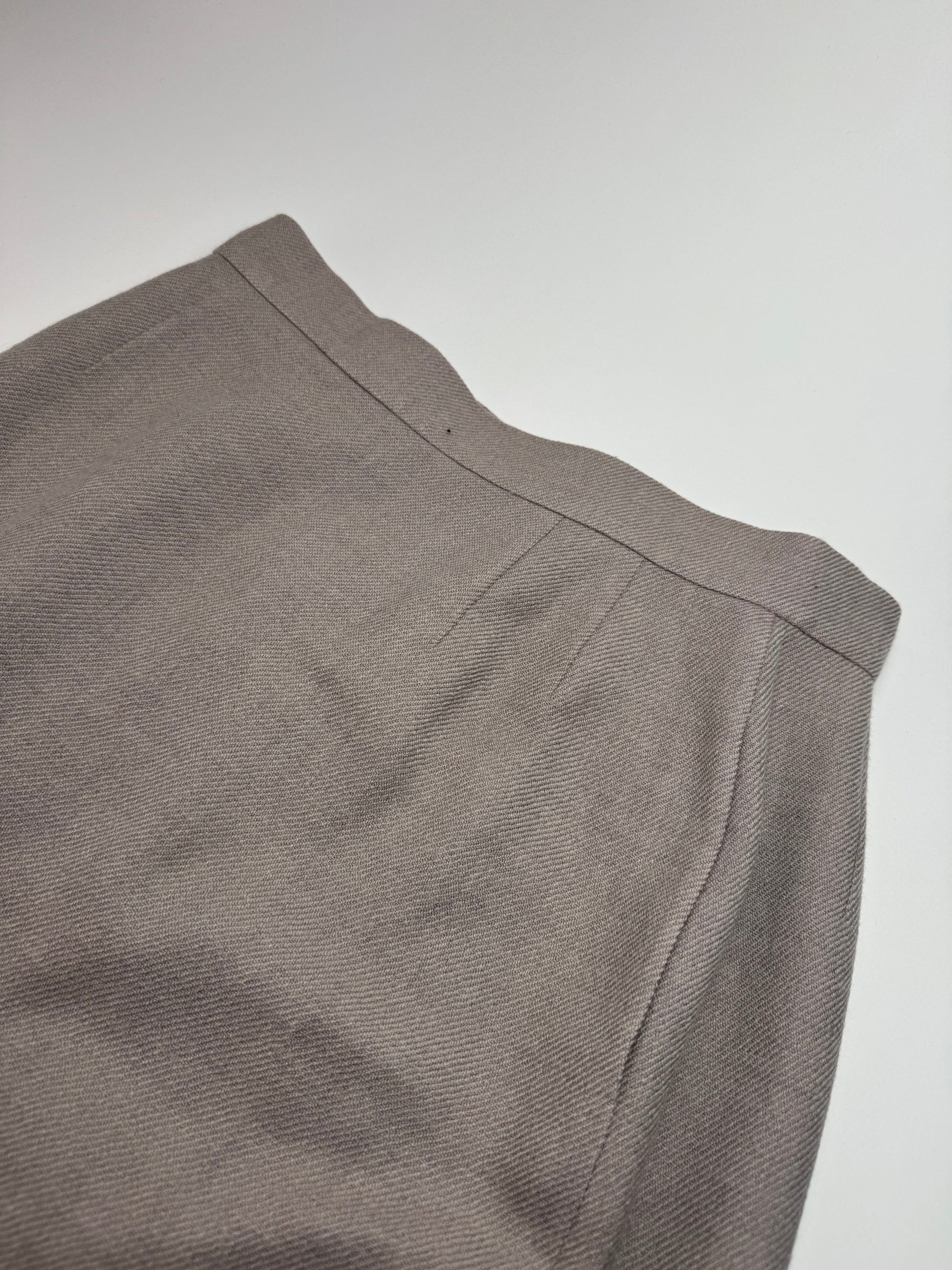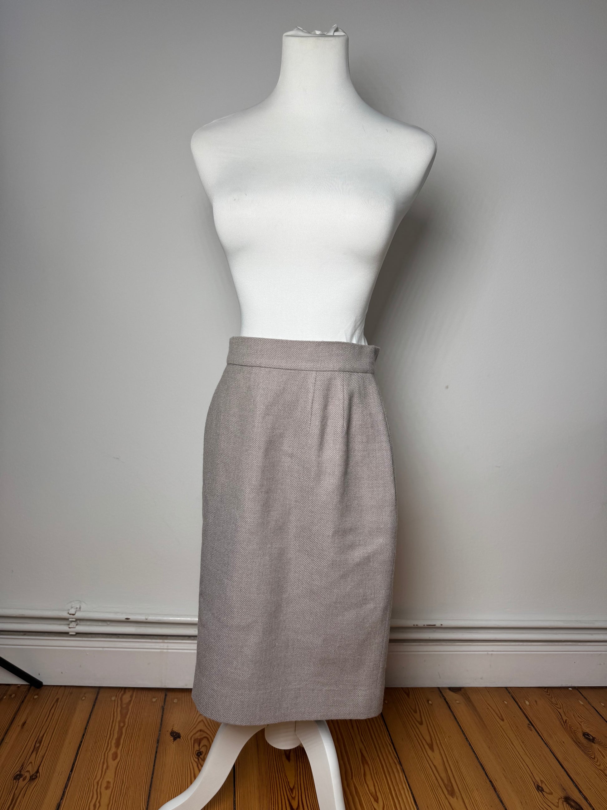DIOR Ecru Wool Skirt. This vintage high-waisted skirt is crafted from ecru-colored wool and lined with a viscose-blend fabric in a light beige tone. Originally labeled as size LL, the skirt appears to have been altered and now fits approximately like a size L.