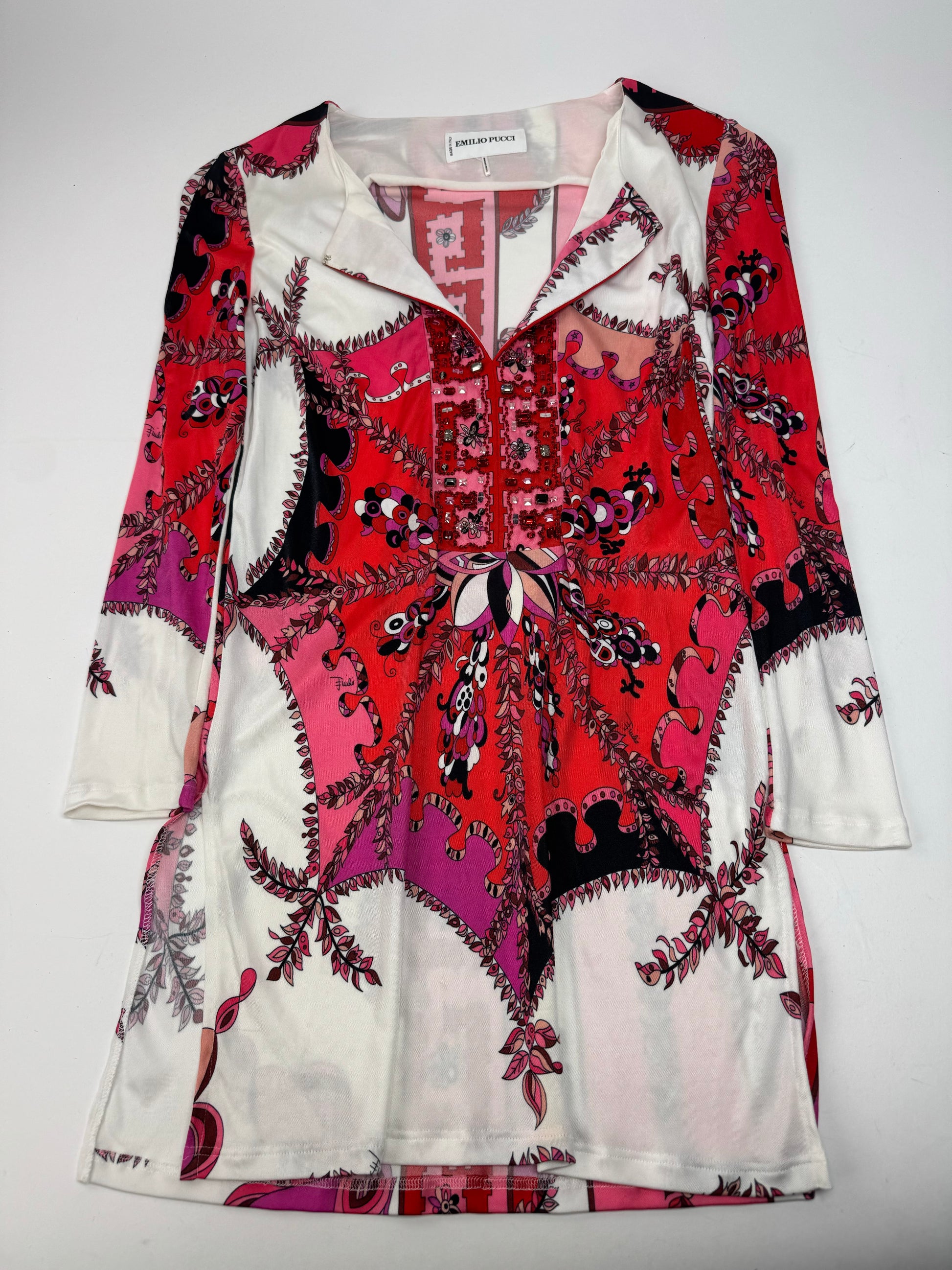 EMILIO PUCCI Vintage Printed Dress / Sweater. This stunning vintage piece is crafted of 100% viscose in an abstract white, black, purple, and red print. The design features a deep V-neckline and is embellished with decorative plastic stones in red, silver, and black around the collar. Made in Italy.