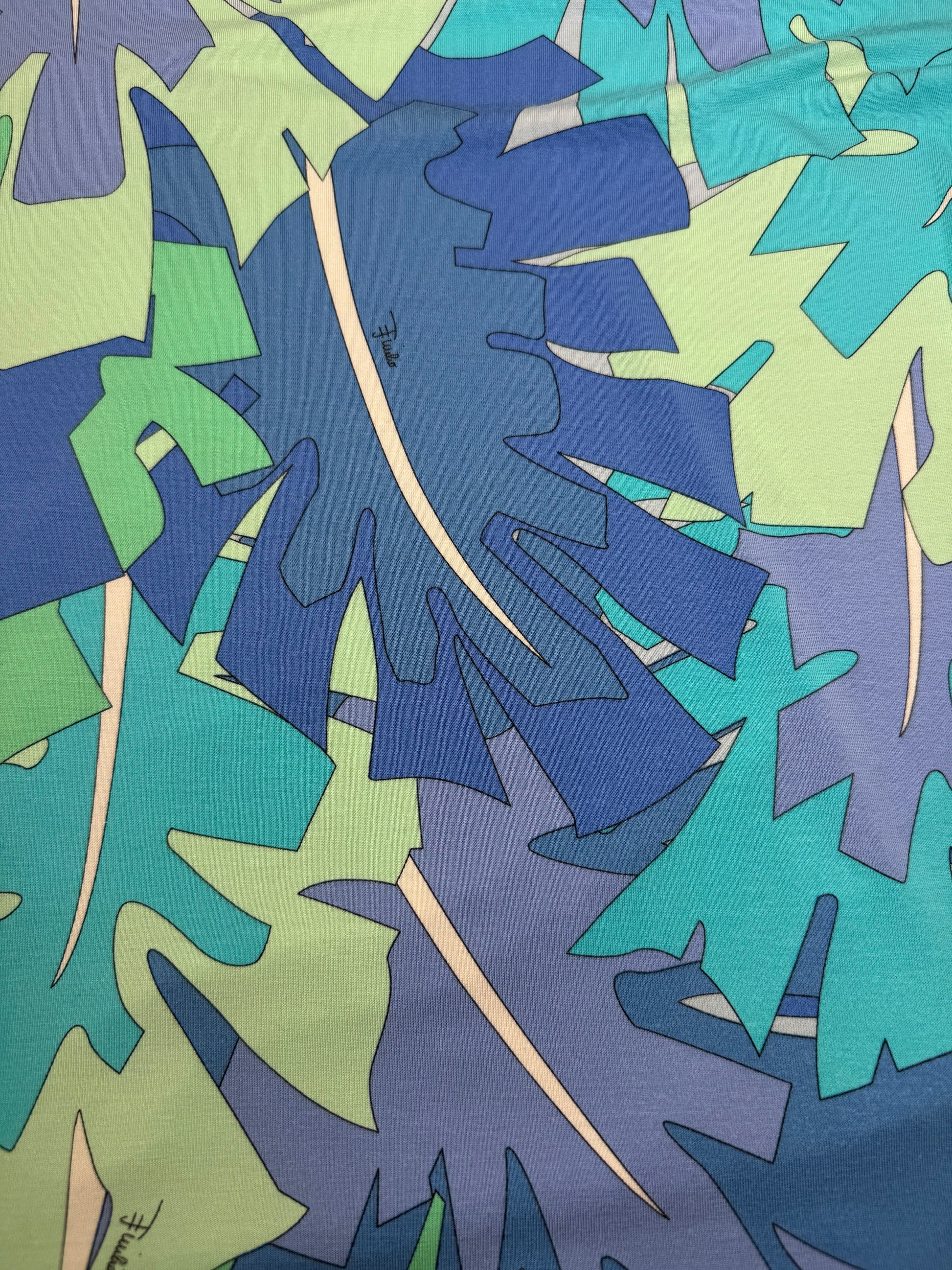 EMILIO PUCCI Vintage Printed Top. This chic vintage top is crafted of a soft viscose blend in a light blue, navy, purple, and turquoise patterned design. The top features a classic round neckline and a flattering silhouette.