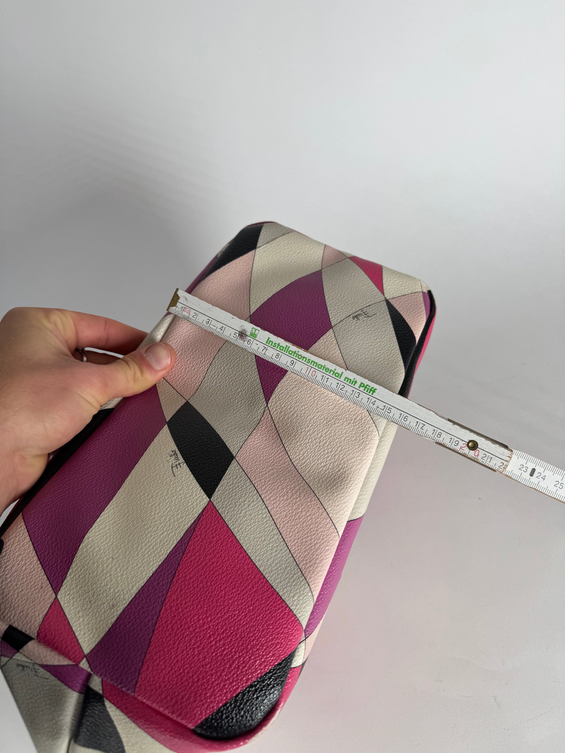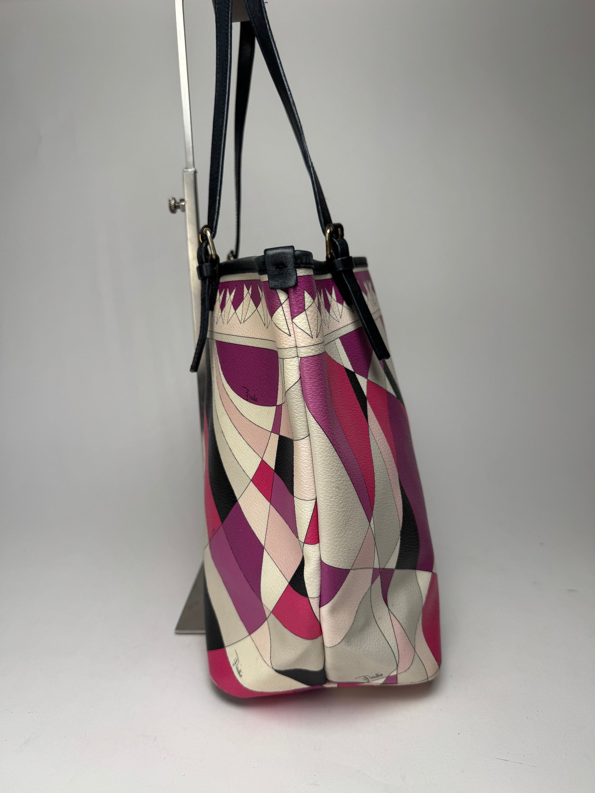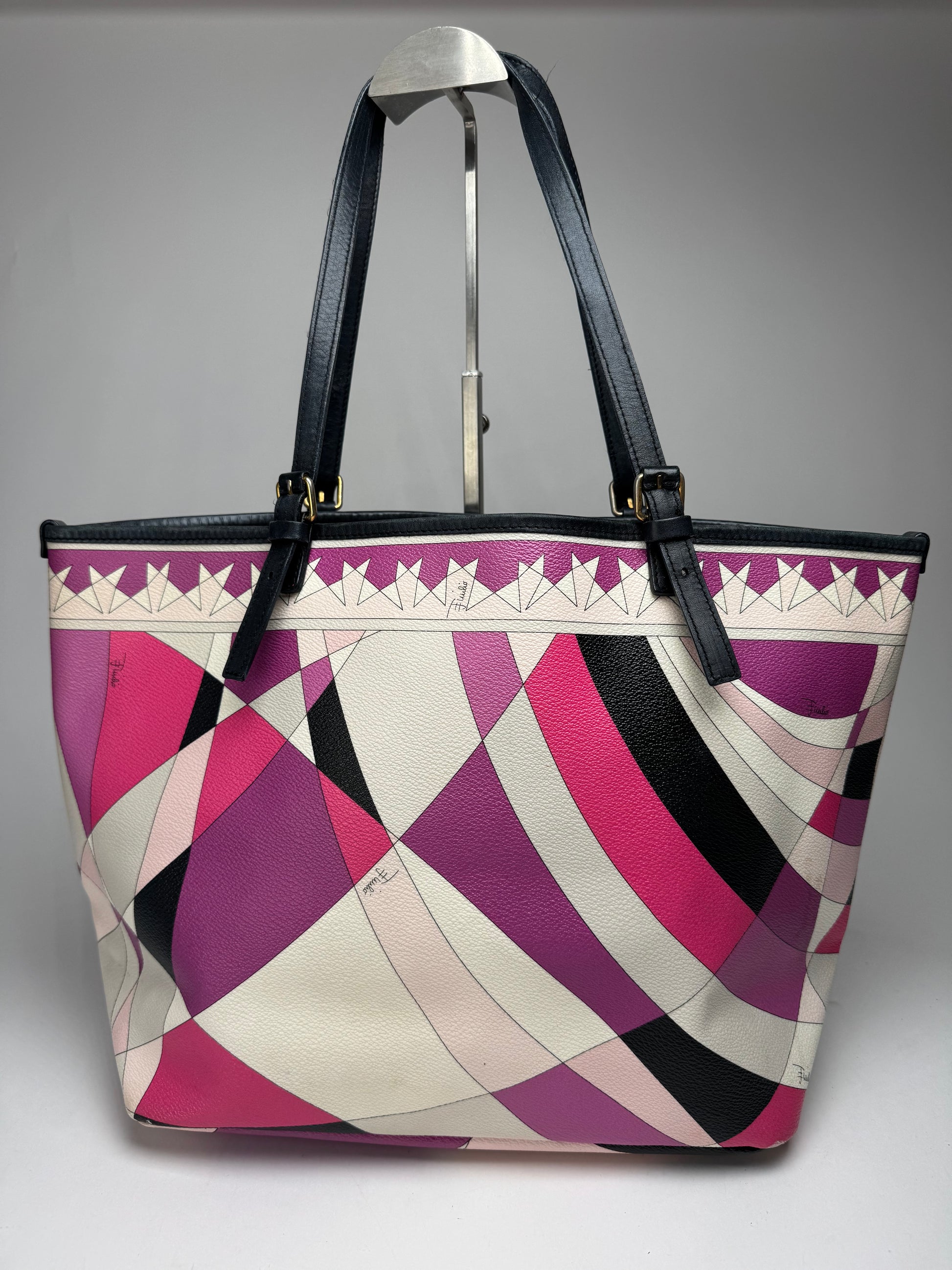 This vintage shopper bag is crafted from leather featuring a vibrant pattern in white, purple, pink, and black. The design includes long black handles and gold-tone hardware. The interior is lined with pink fabric, adding a lively contrast. Made in Italy.