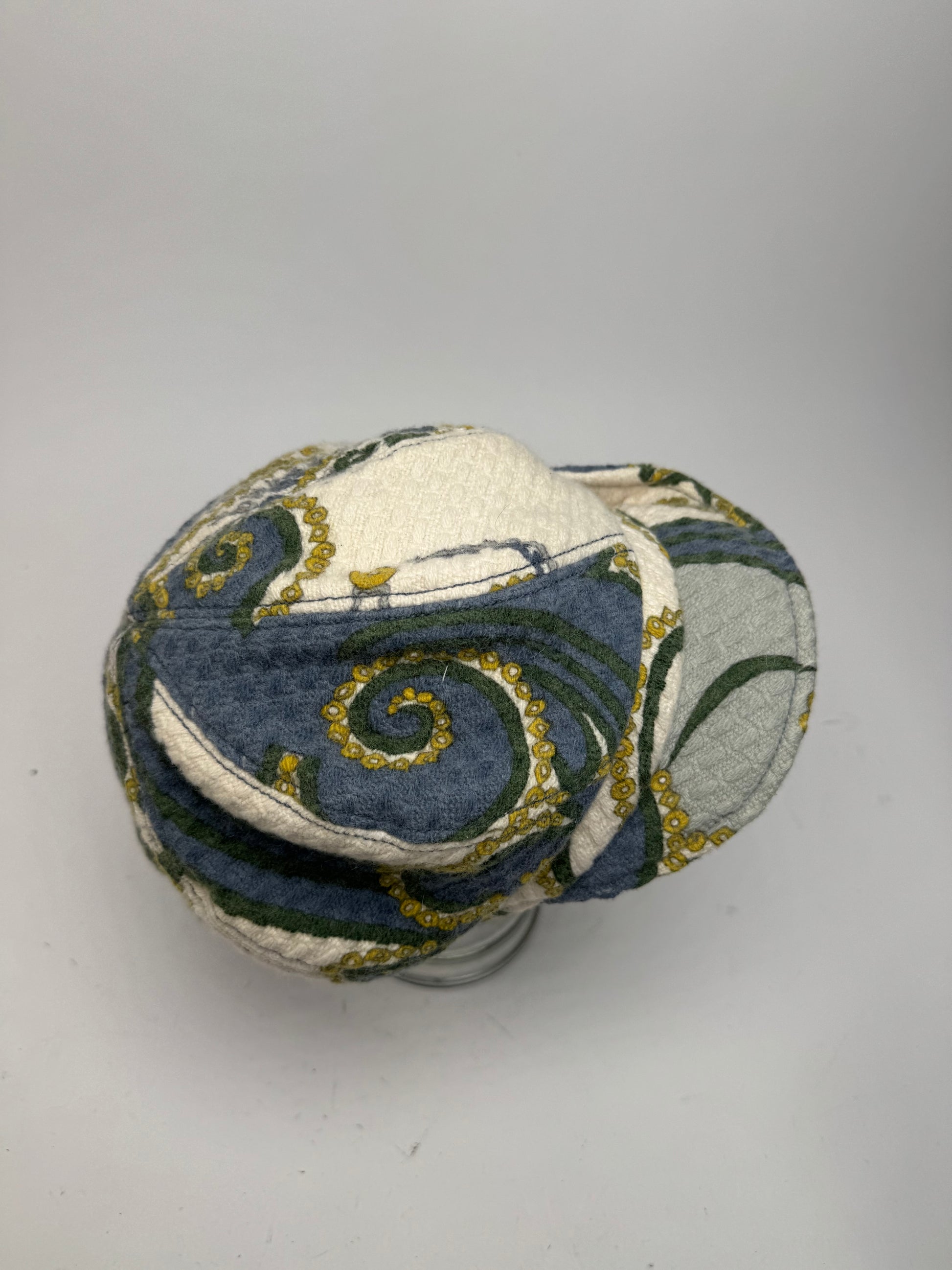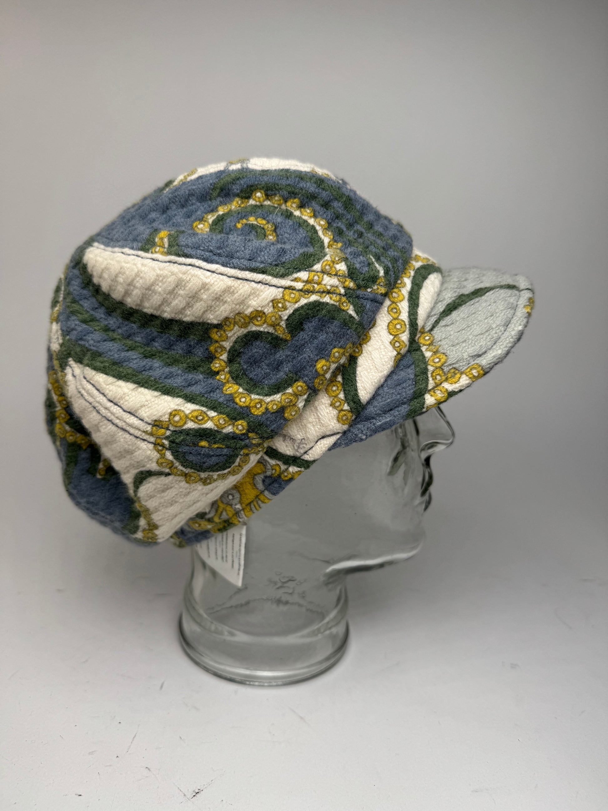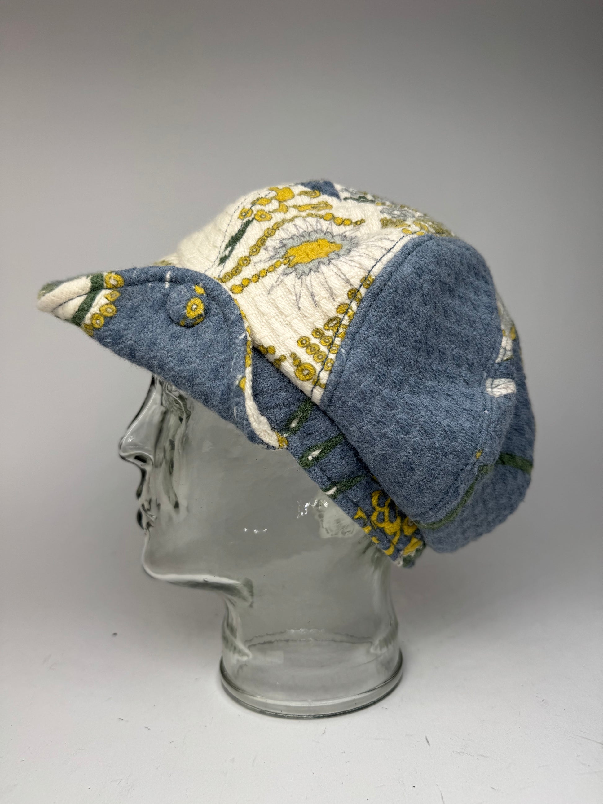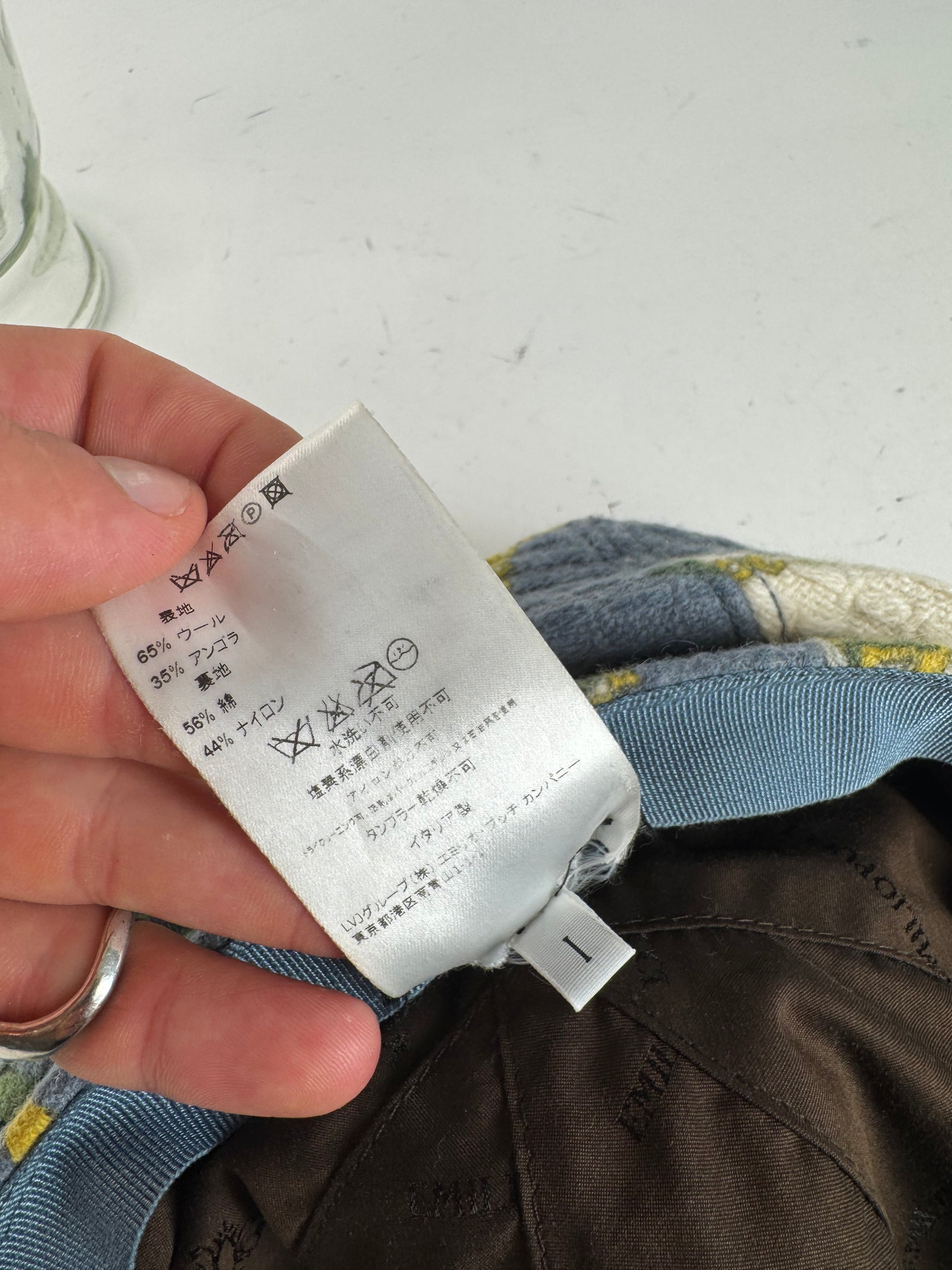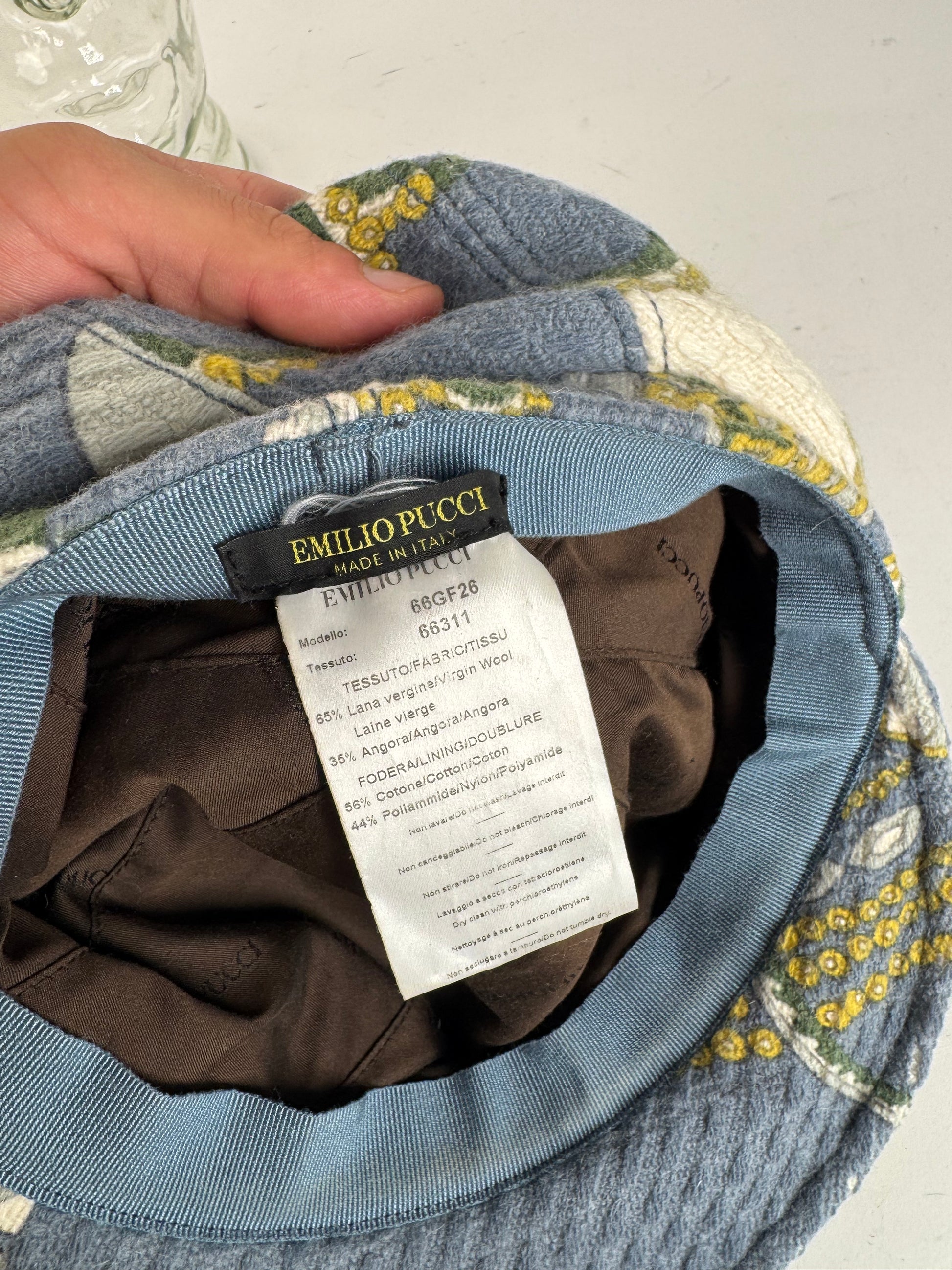 EMILIO PUCCI Wool Blend Beret. This vintage beret is crafted from a soft blend of 65% virgin wool and 35% angora, featuring an iconic Pucci print in bold tones of blue, white, and gold. The interior is lined with a brown cotton-polyester fabric printed with Pucci logos and signature lettering. This piece is made in Italy and comes in size M.