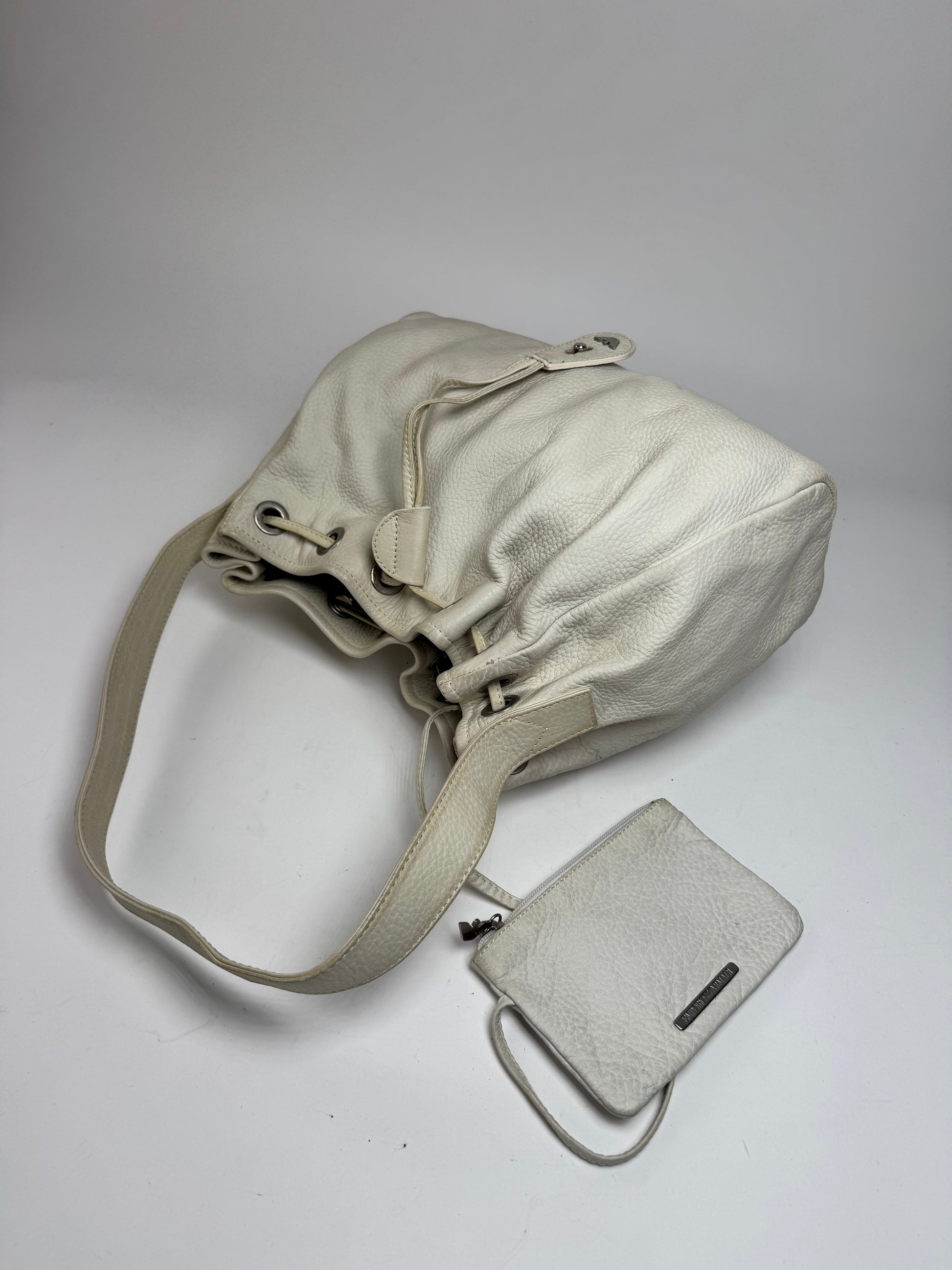 This chic handbag is finely crafted of white leather. The bag features silver-tone steel hardware, a shoulder strap, a drawstring closure, and the iconic eagle logo on the front. A leather strap on the side holds a matching white leather clutch. The interior opens to white suede.