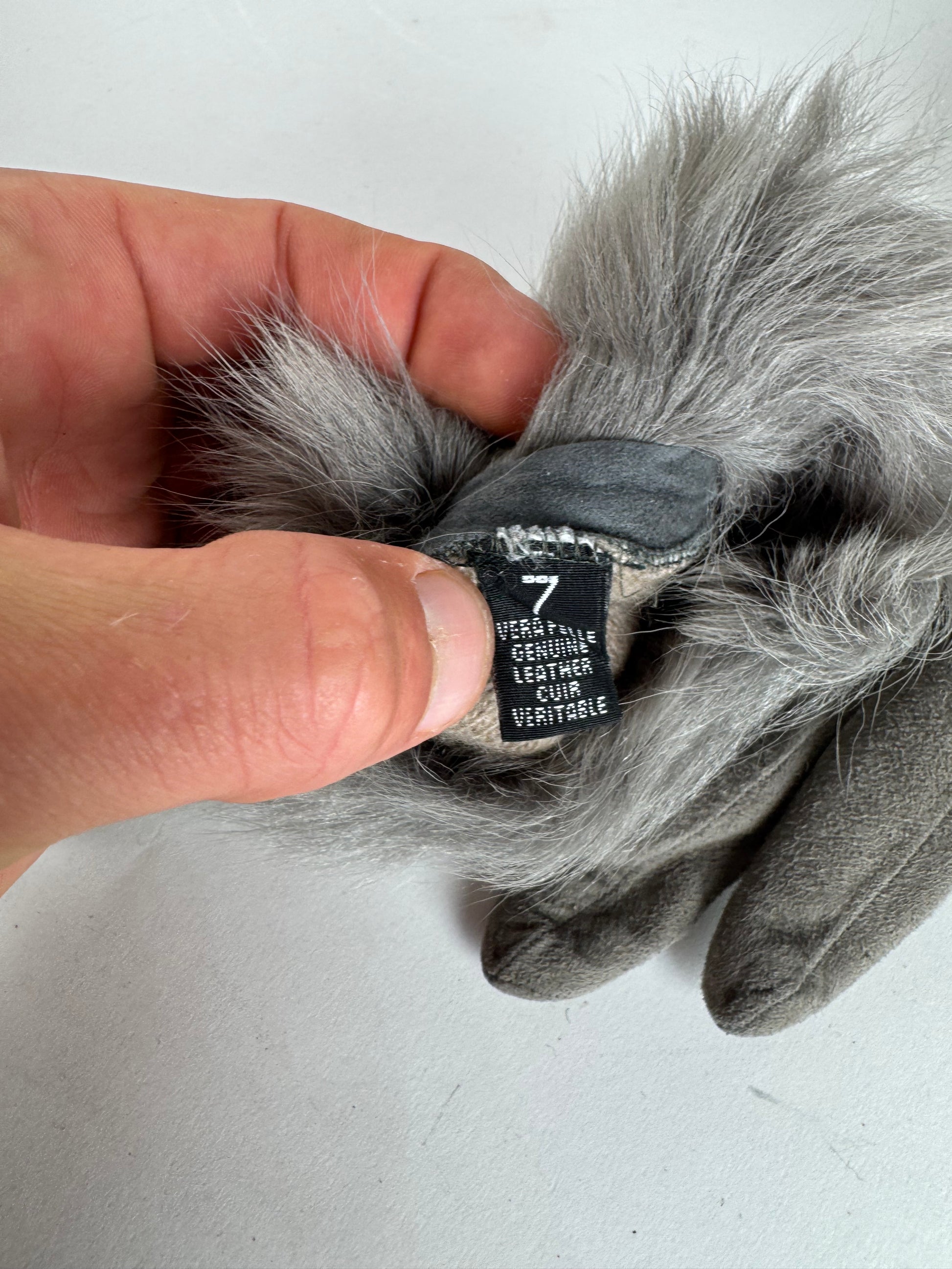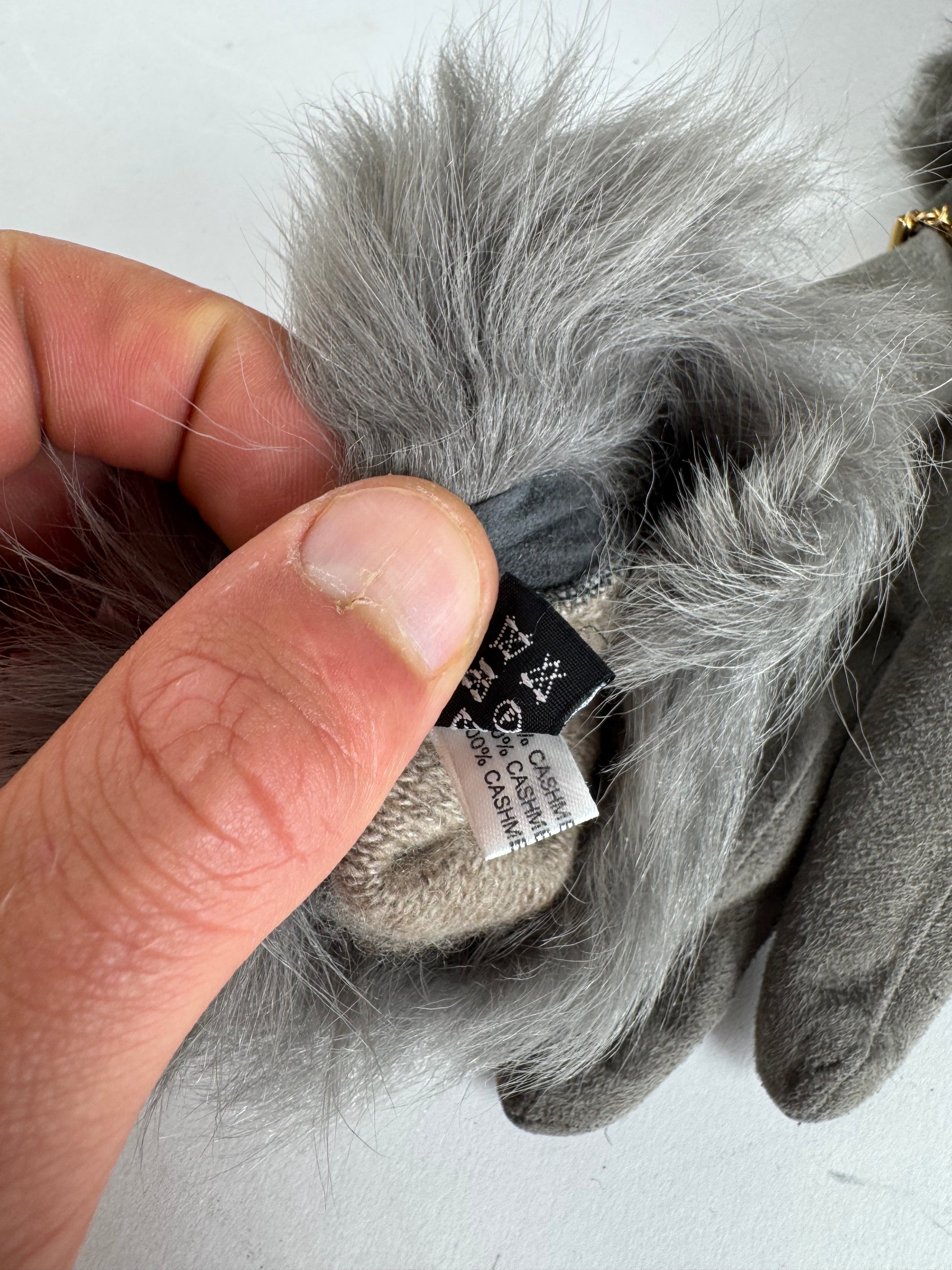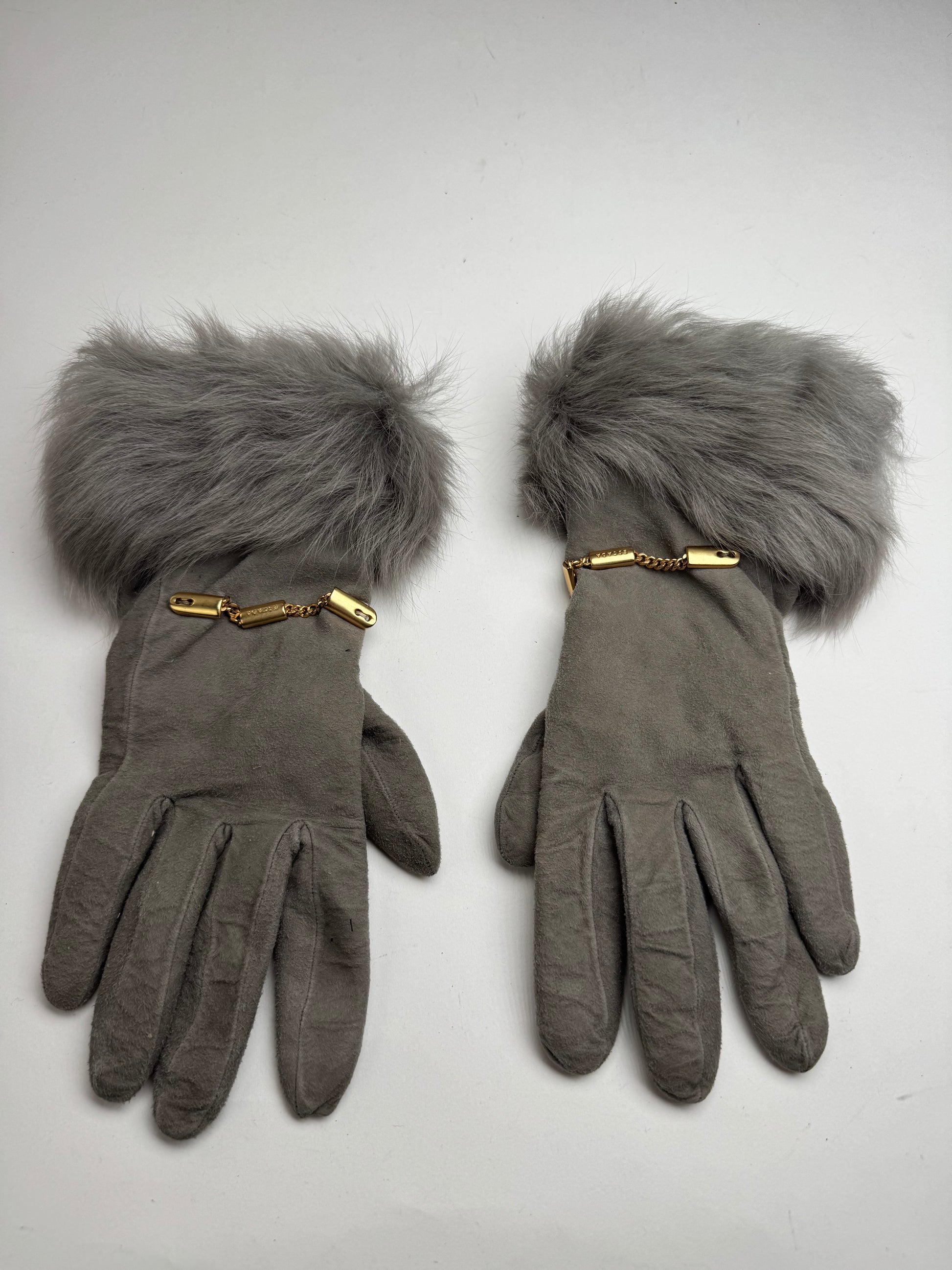 ESCADA Vintage Suede Gloves. These chic gloves are finely crafted of grey suede leather with a fur trim at the wrist. The interior is fully lined in 100% cashmere. The gloves feature gold-tone steel hardware.