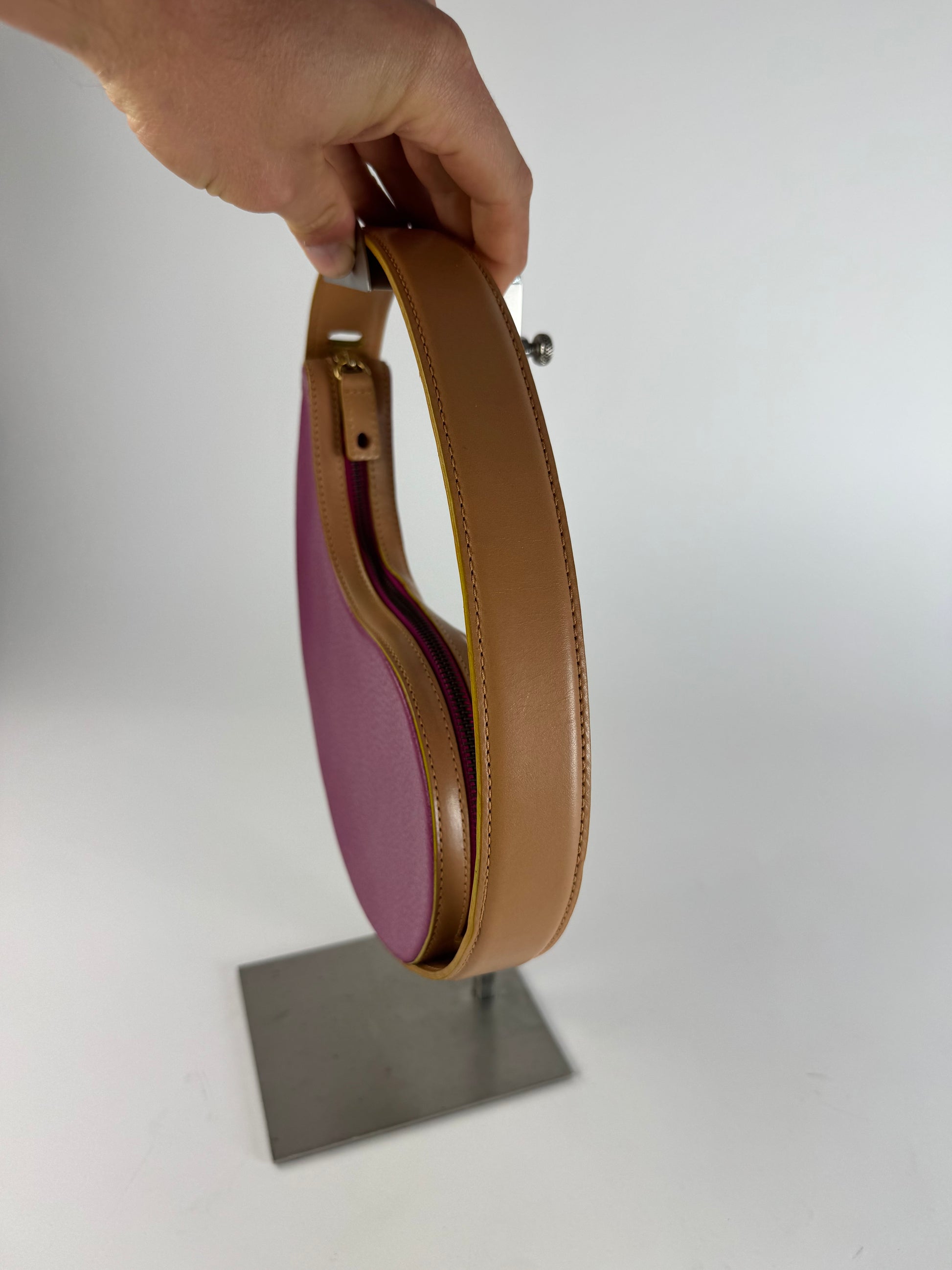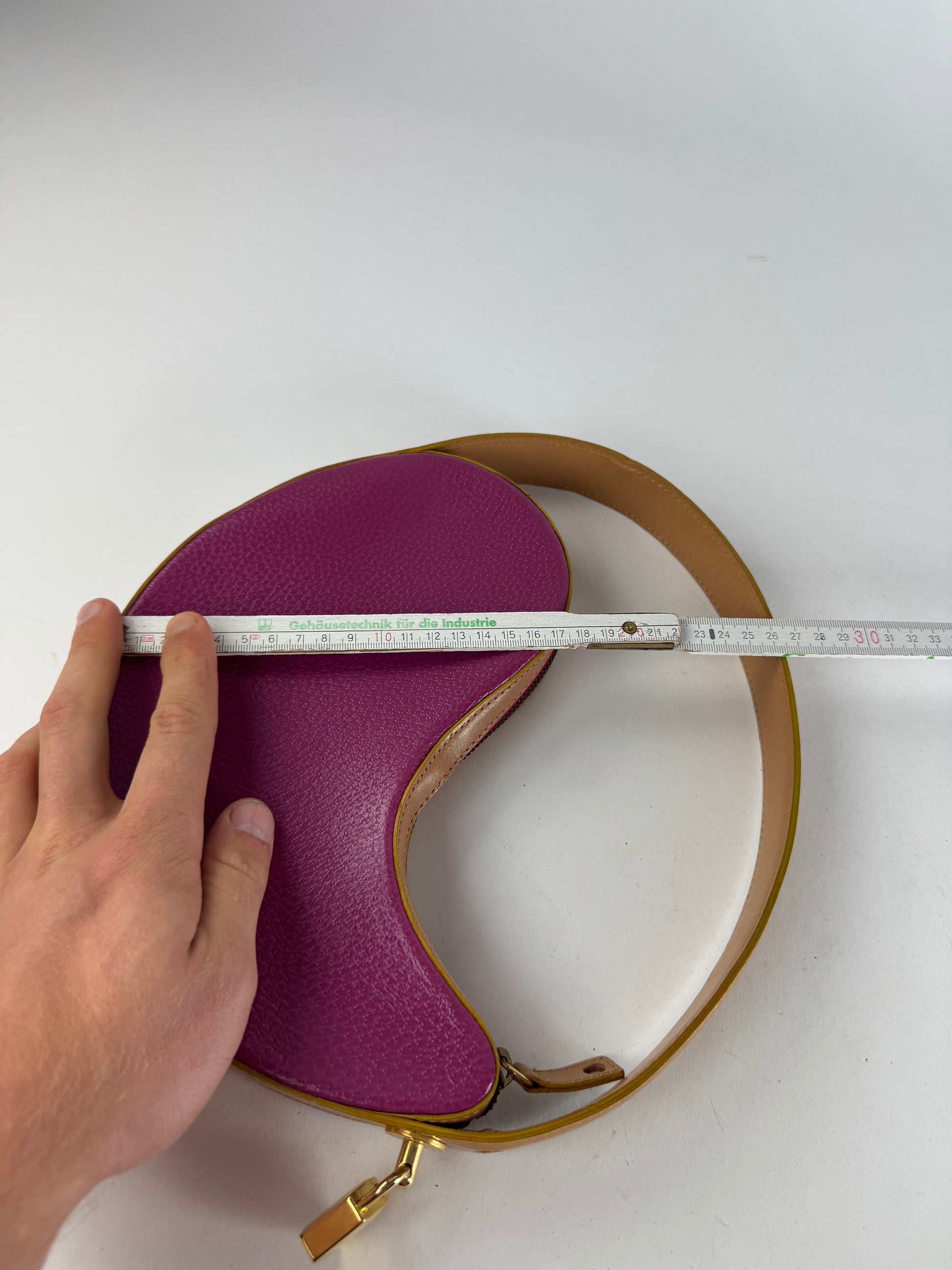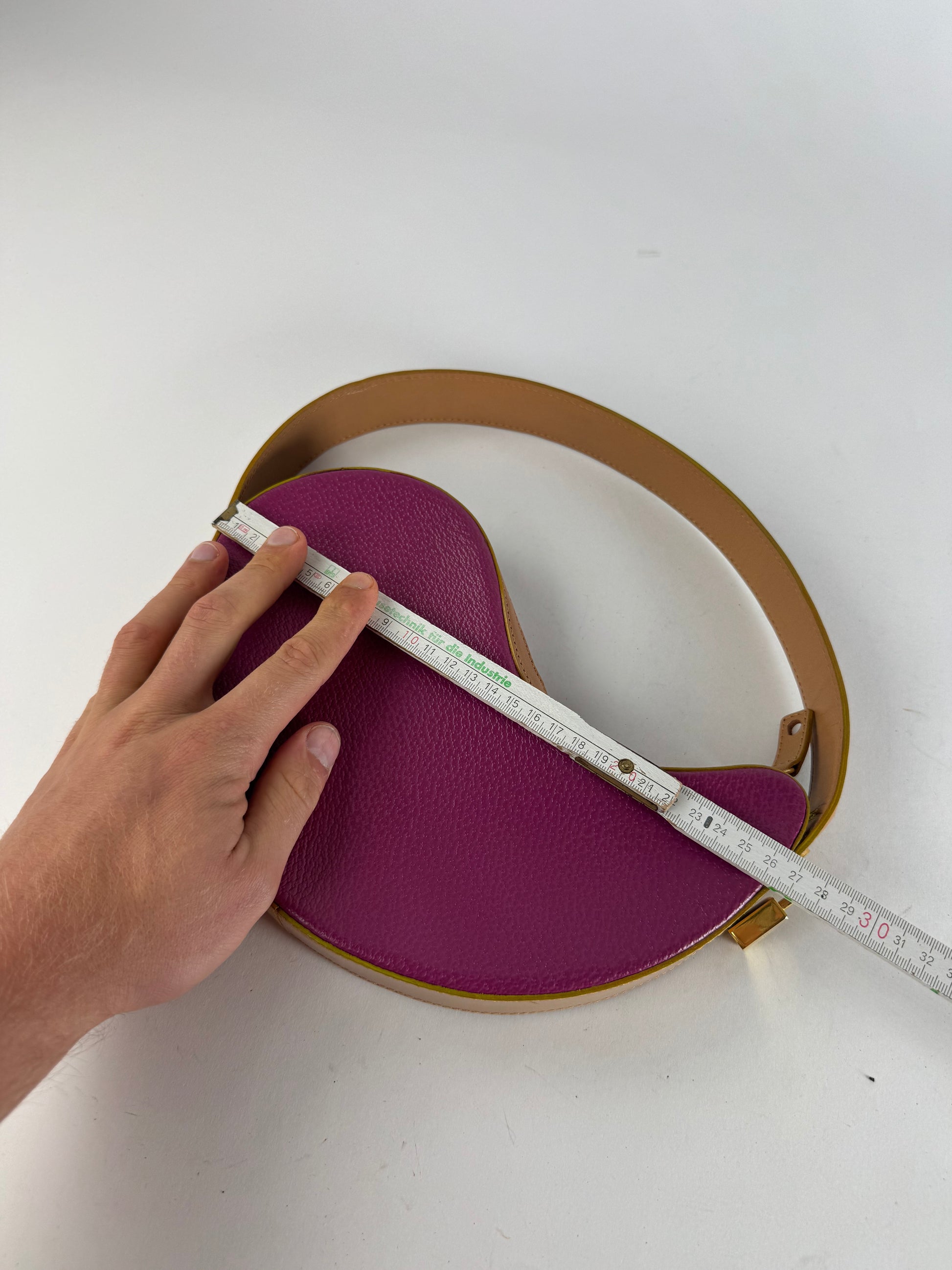 ETRO Vintage Handbag. This chic handbag is finely crafted of purple leather in a unique rounded cut-out silhouette with an asymmetrical design. The bag features a camel leather top handle, a top zipper closure, and an Etro padlock charm in gold-tone steel on the side. The zipper opens to a green canvas interior lining.