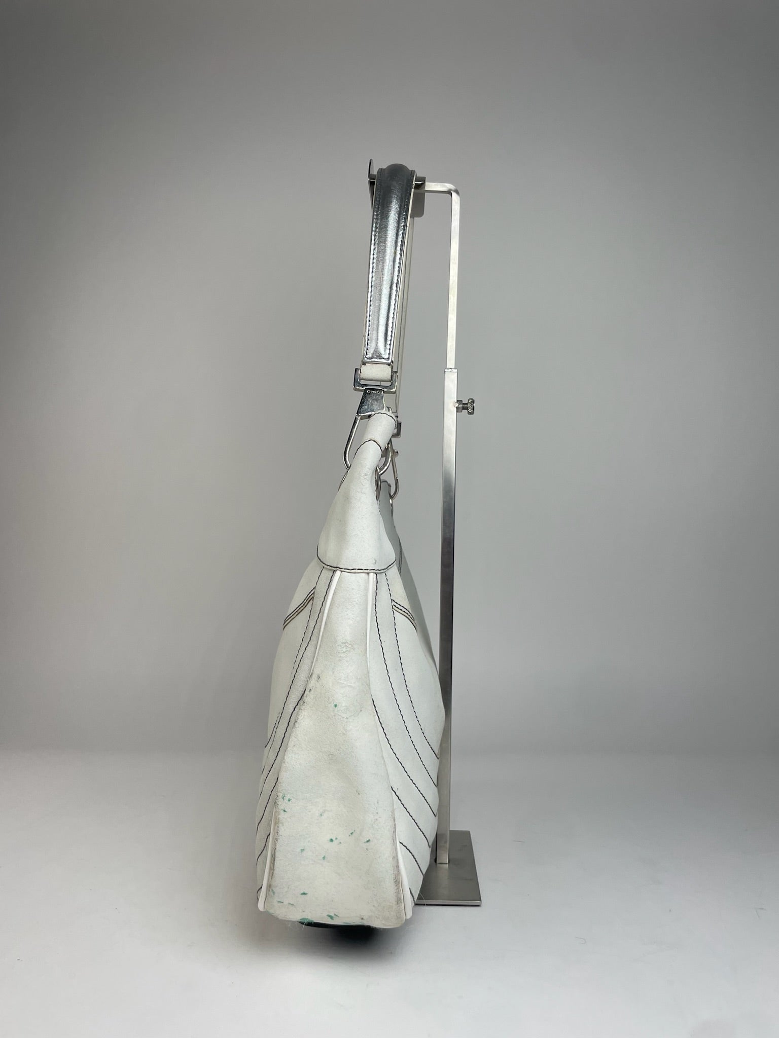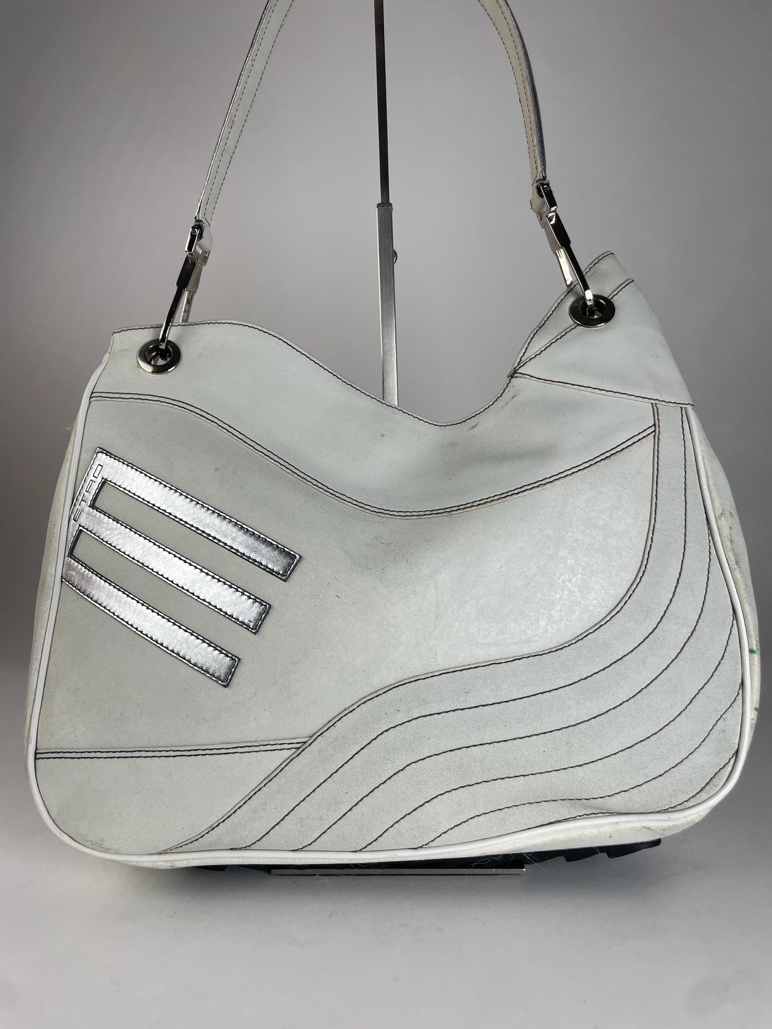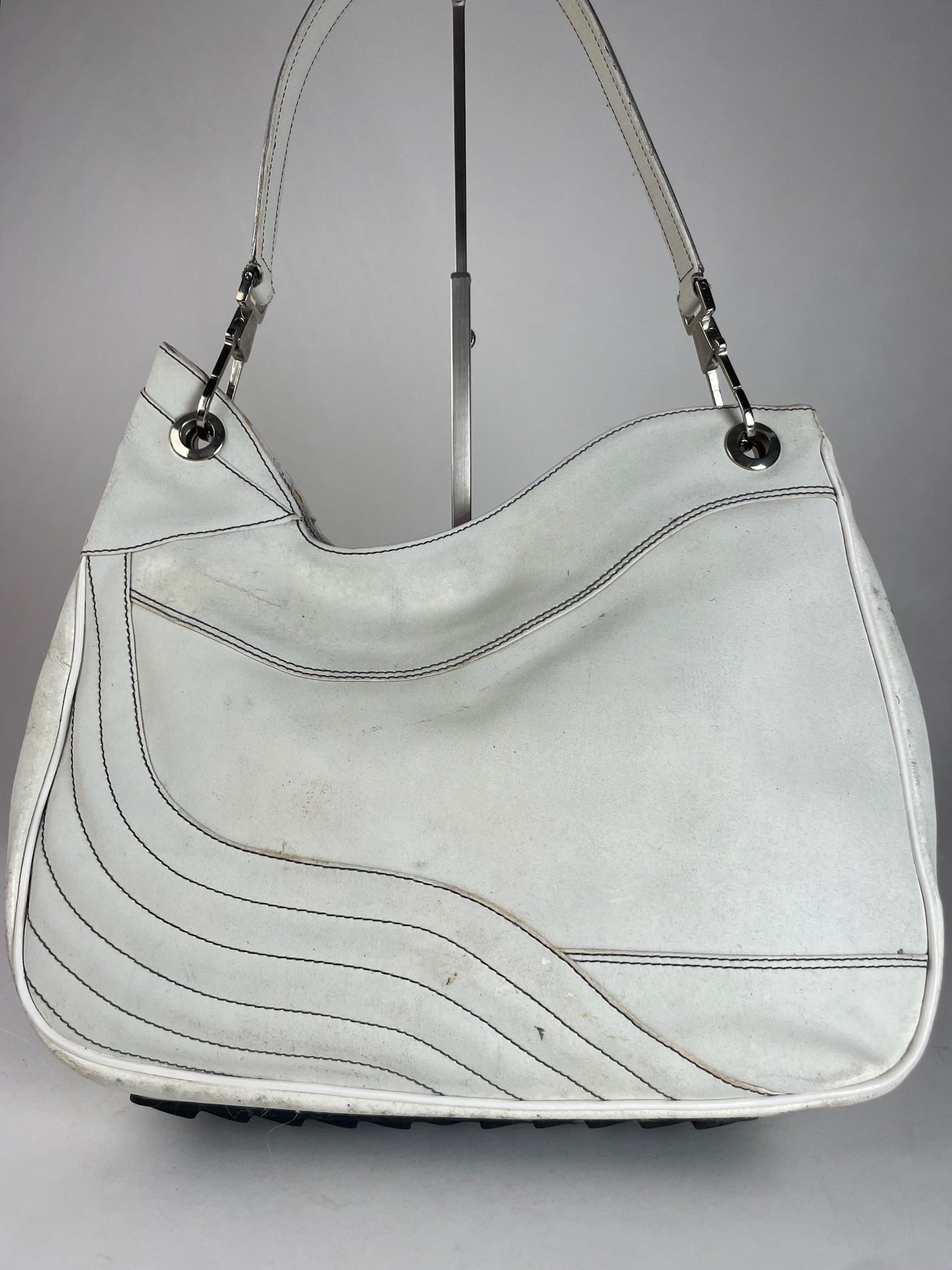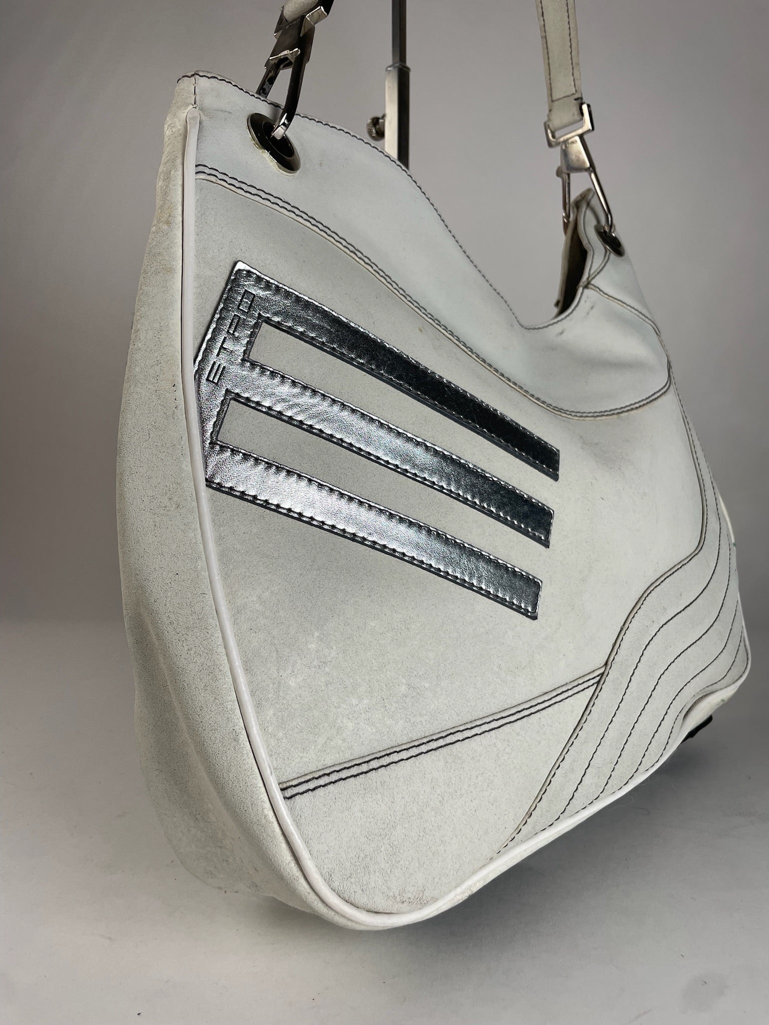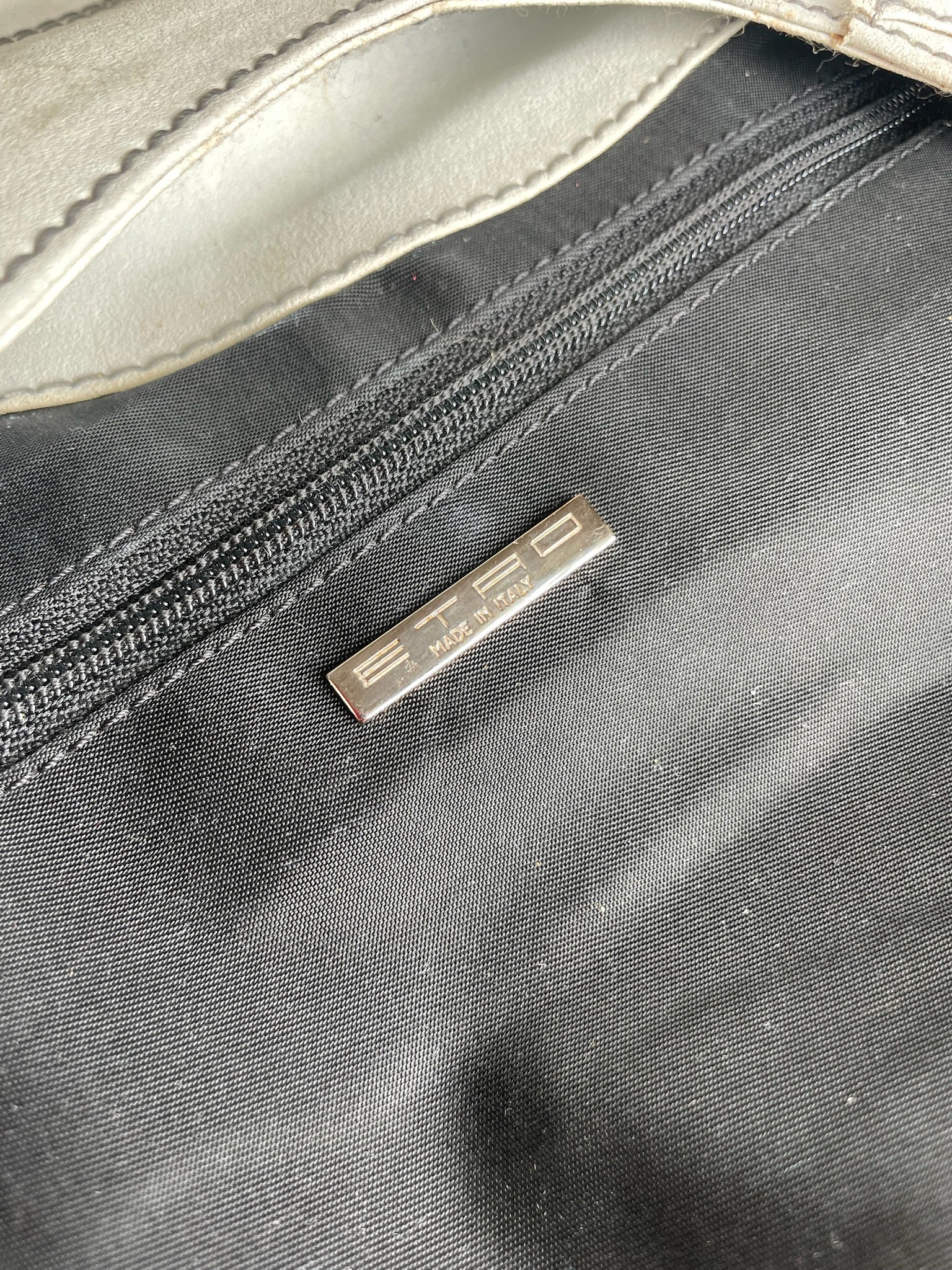 ETRO Vintage Handbag. This elegant vintage handbag is crafted of white and grey patterned leather and features a silver-tone Etro “E” appliqué in leather on the front. The bag has a medium-length top handle allowing it to be worn over the shoulder and is finished with silver-tone steel hardware. The interior opens to a black canvas lining. Made in Italy.