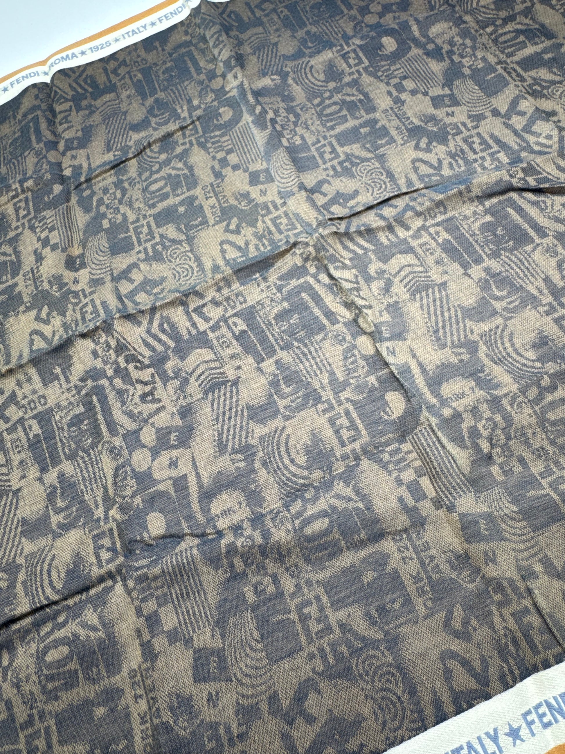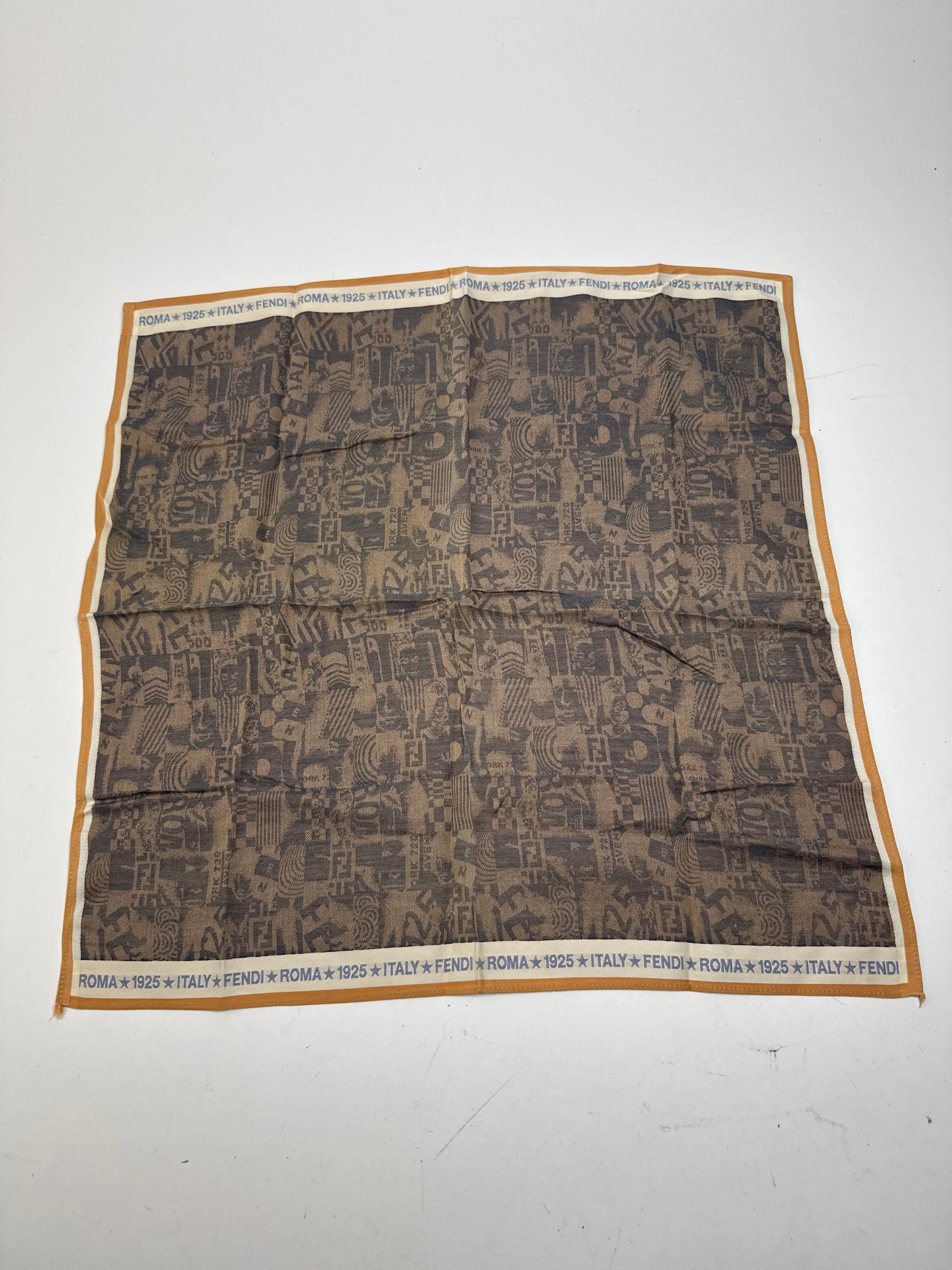 FENDI Vintage Silk Canvas Scarf. This chic scarf is finely crafted of brown silk-canvas blend material with an avant-garde inspired pattern. It features a subtle orange border and is adorned with “FENDI ROMA ITALY 1925” lettering throughout. This unisex accessory adds a bold yet elegant touch to any look.