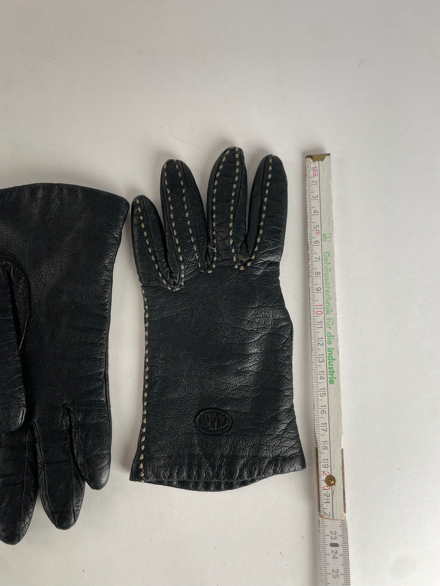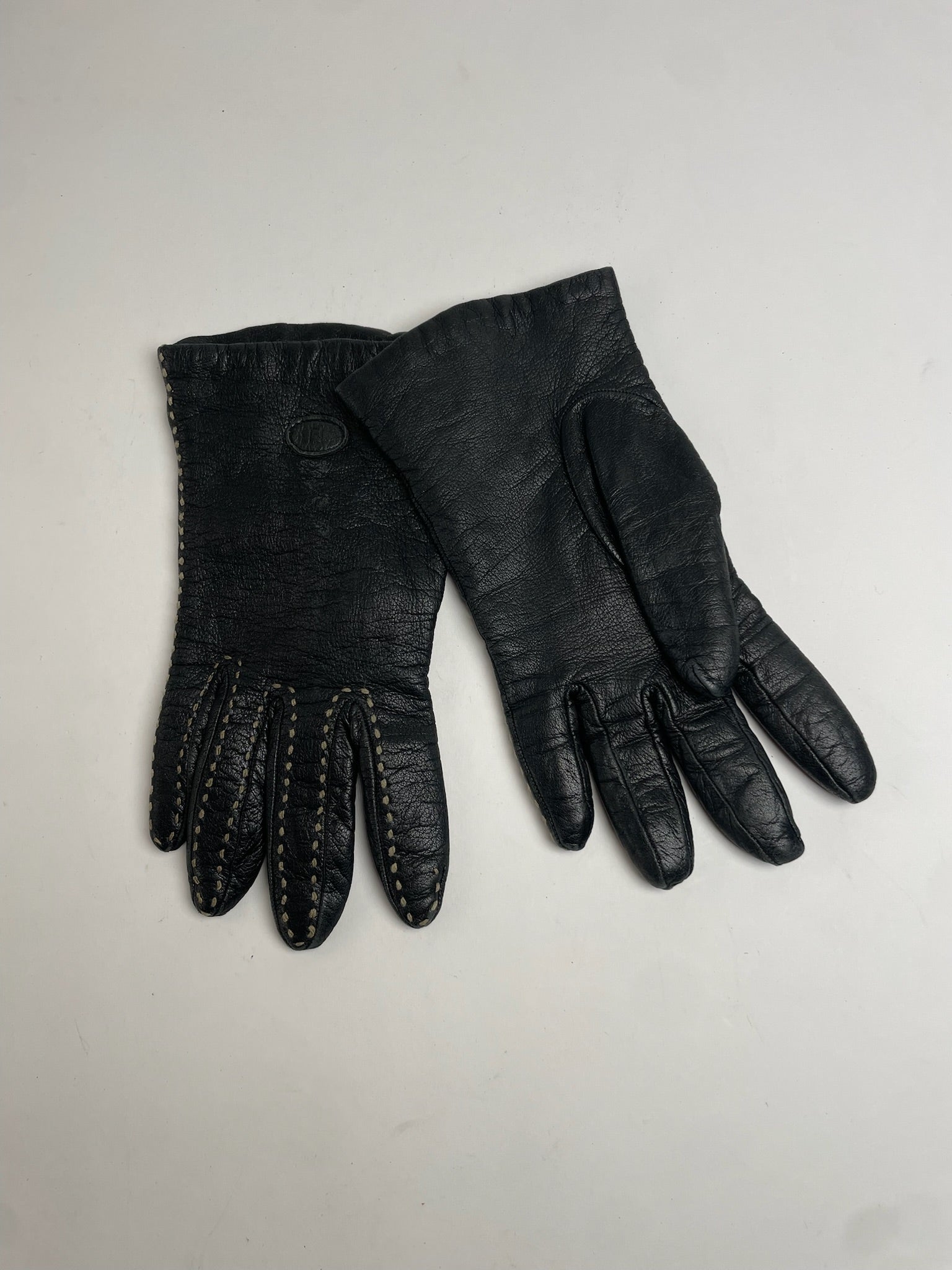 FENDI Vintage Leather Gloves. These chic gloves are crafted of black leather and feature embossed FENDI FF applications at the wrists. They are detailed with subtle grey stitching and are lined with beige-brown wool for a warm and comfortable feel.