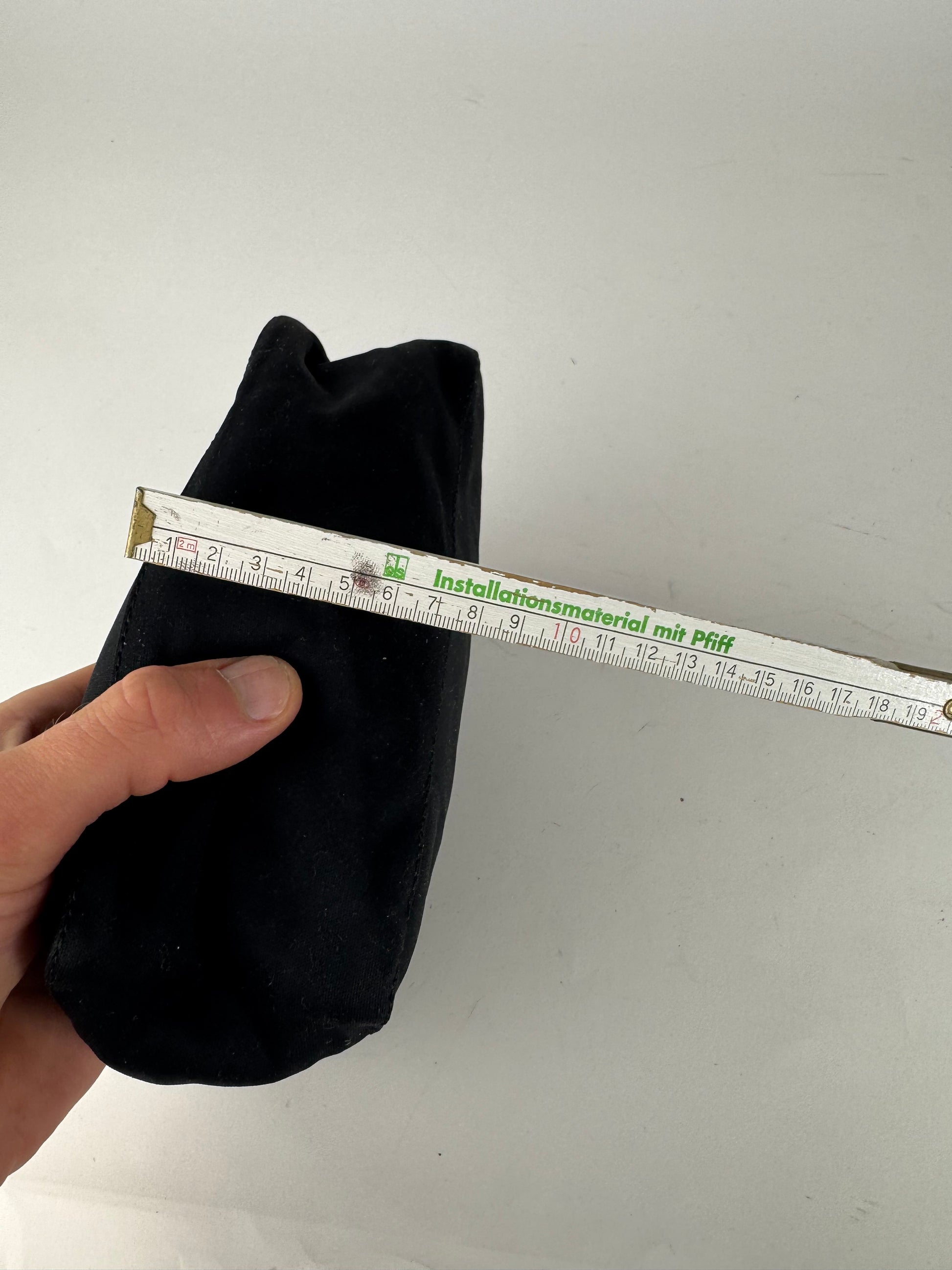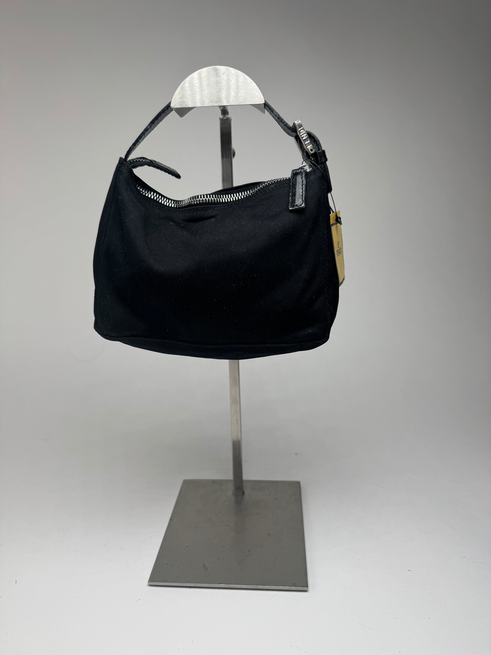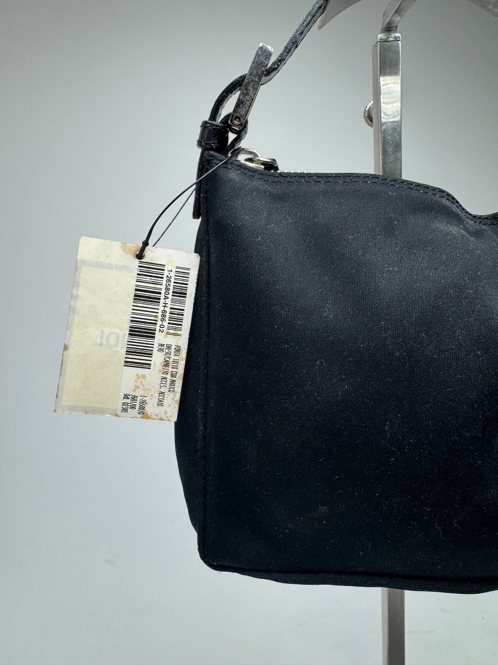 This mini Baguette bag is crafted from black canvas and comes with its original tag. The design features silver-tone steel hardware and a compact silhouette. Please note that the interior lining has suffered water damage, affecting its condition. Made in Italy.