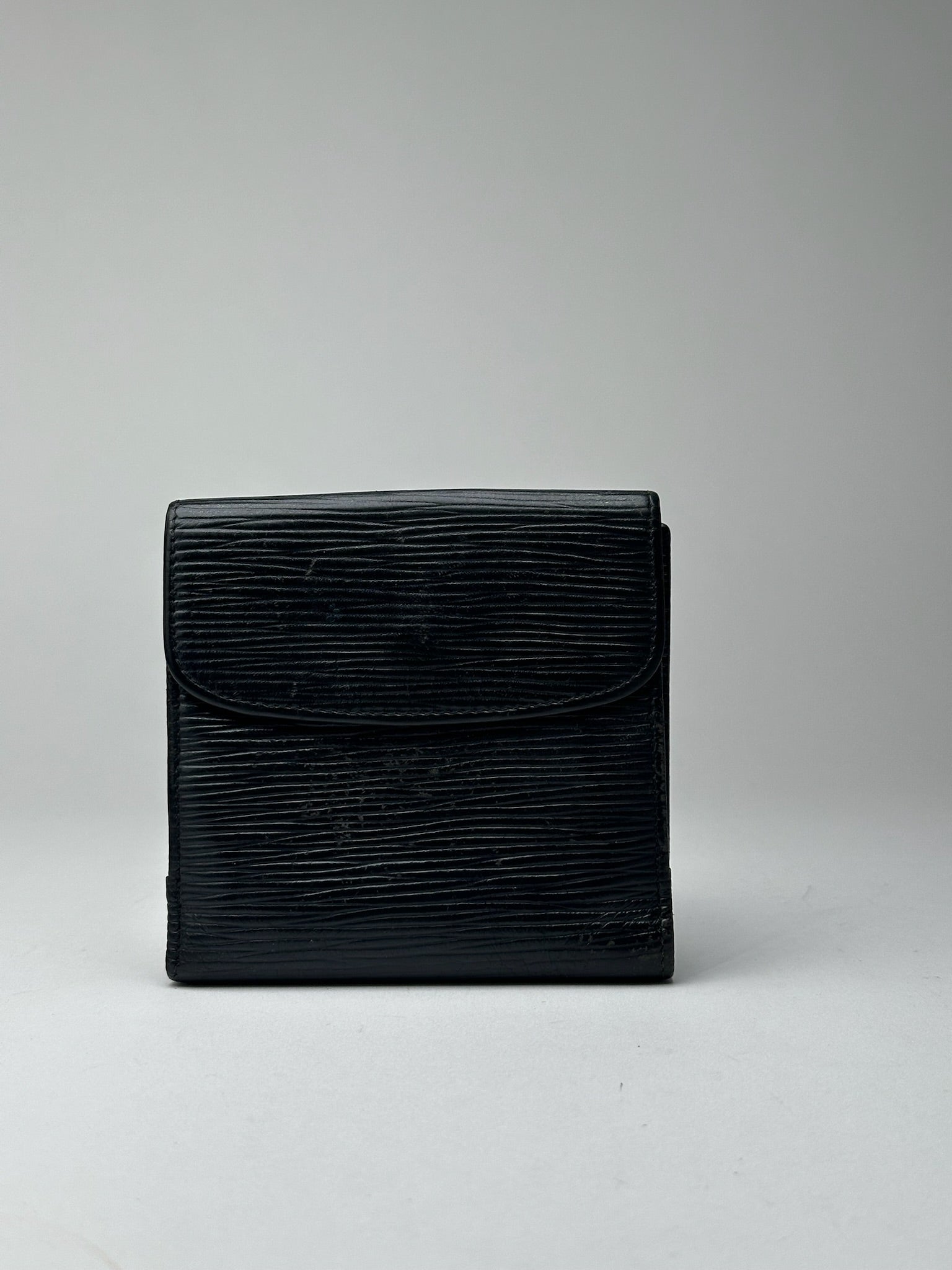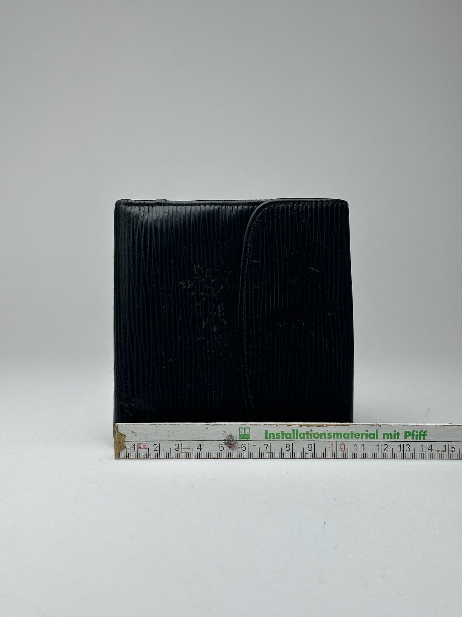 FENDI Vintage Epi Leather Wallet. This chic wallet is finely crafted of black Epi leather. It features a snap button closure and opens to a dark brown canvas interior with compartments for cards, coins, and bills.