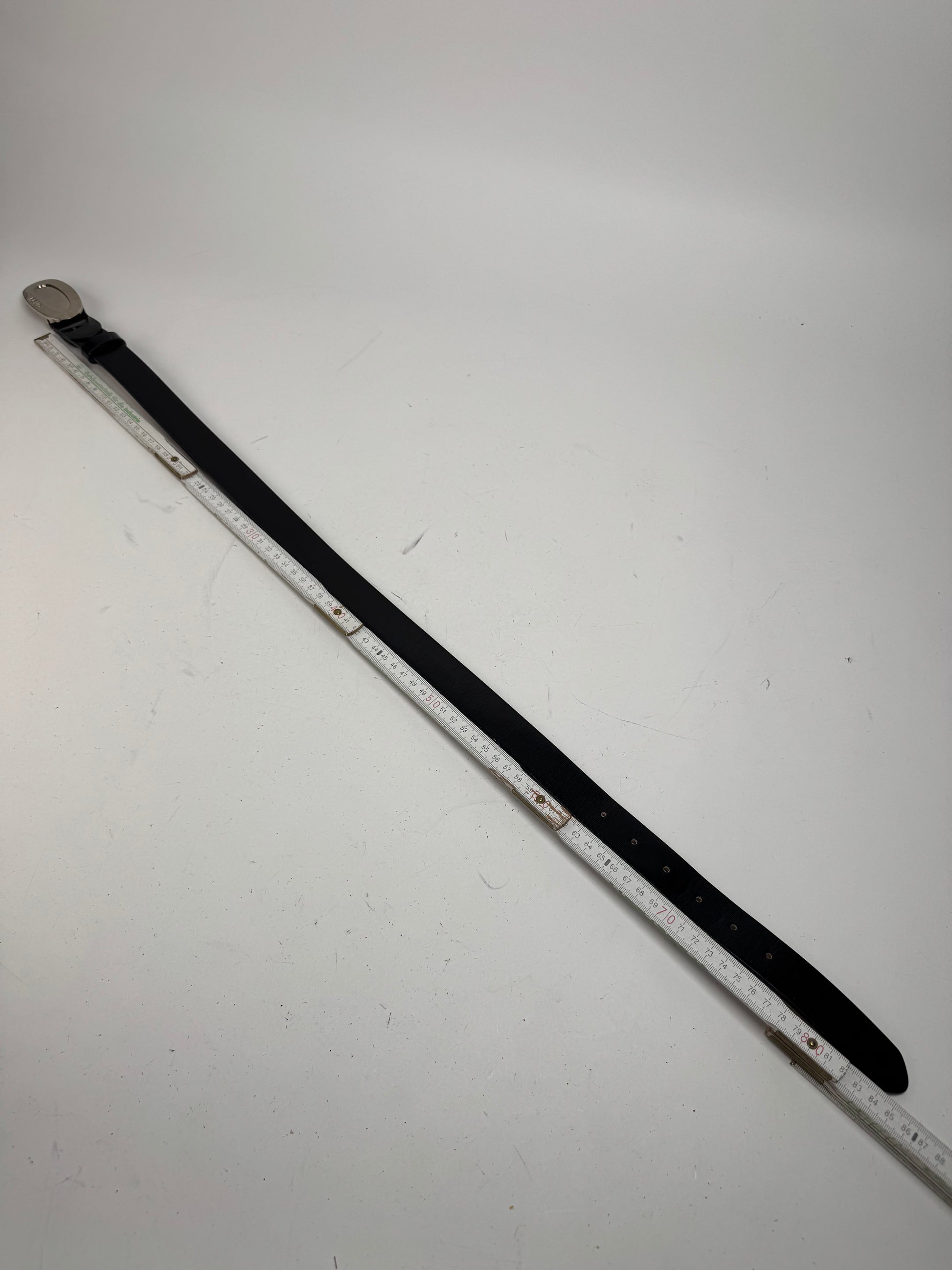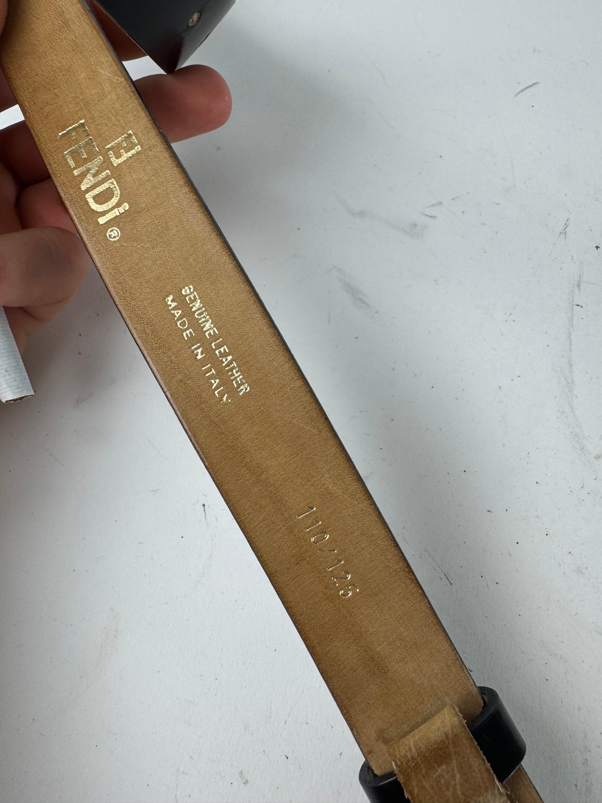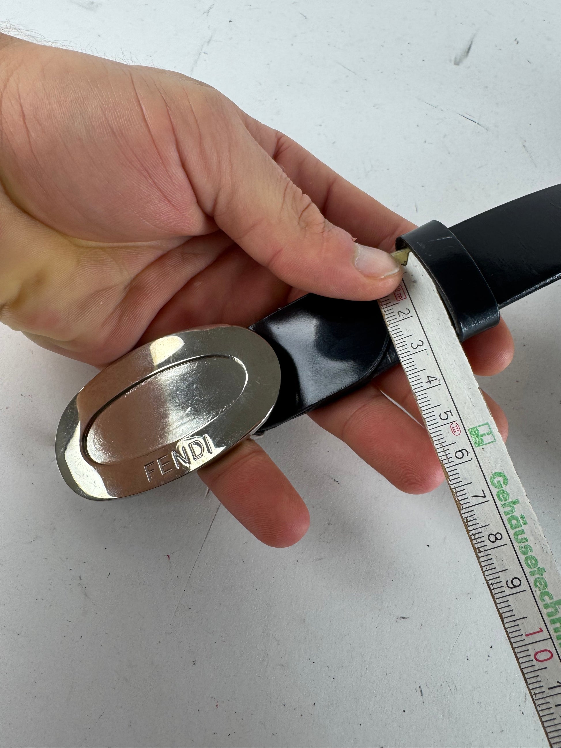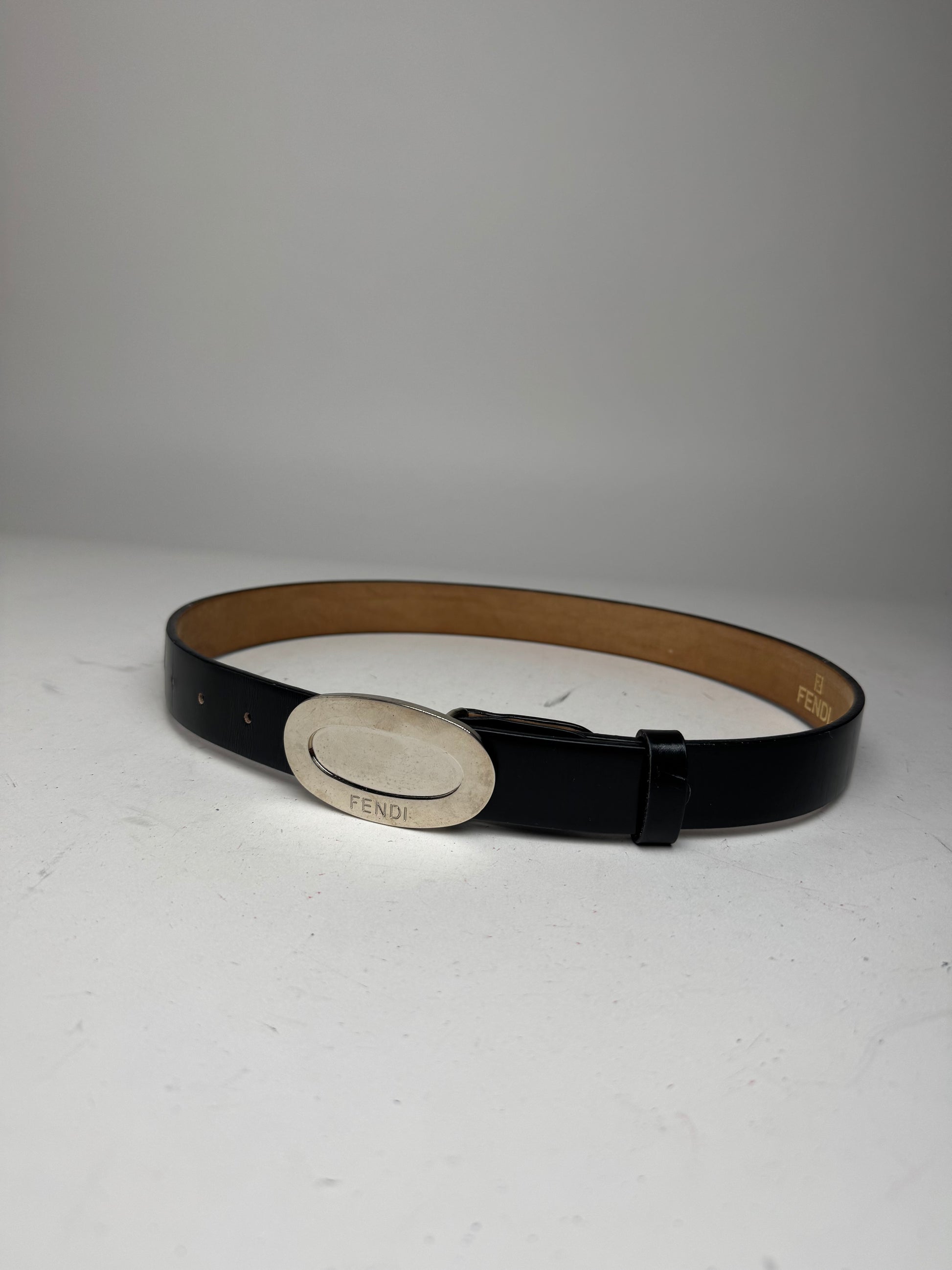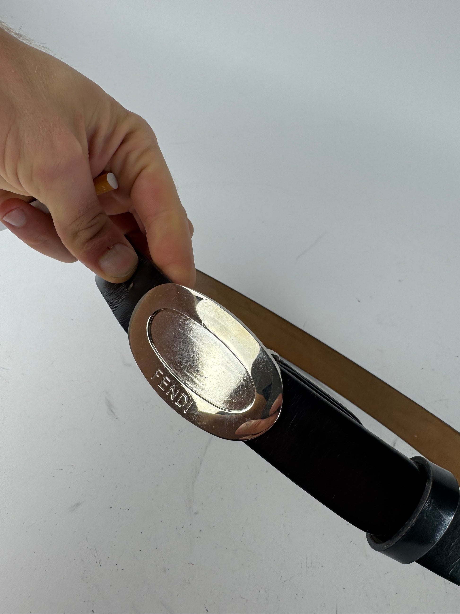 This refined vintage belt is finely crafted from smooth black leather and features an oval silver-tone steel buckle engraved with the Fendi logo. The interior is lined with beige leather, reflecting Fendi’s timeless Italian craftsmanship and minimalist sophistication.