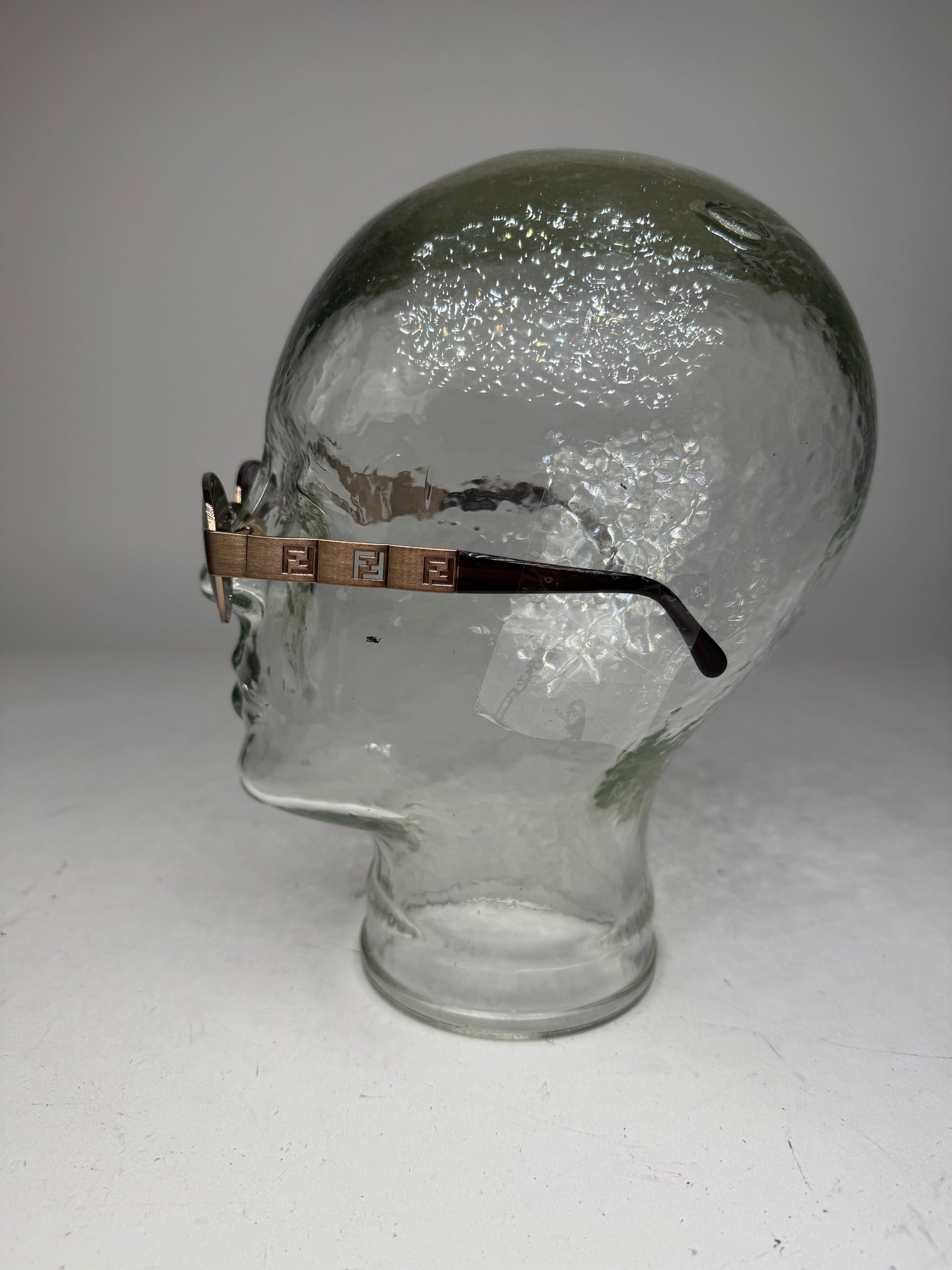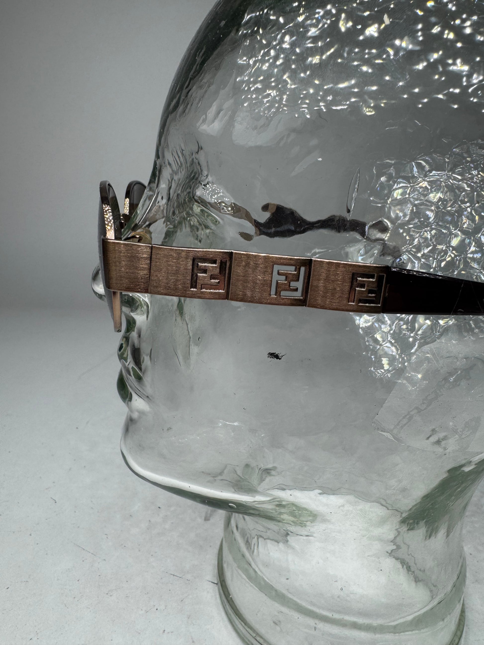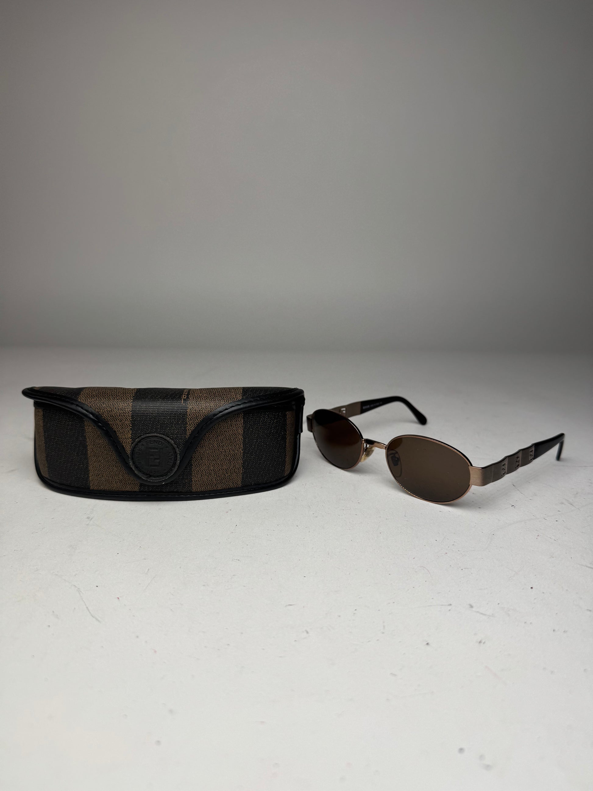 FENDI Vintage Sunglasses. This chic accessory is finely crafted of bronze-toned steel and black plastic. The sunglasses feature slightly curved temples with embossed Fendi FF logos on the steel sections and dark brown tinted lenses.