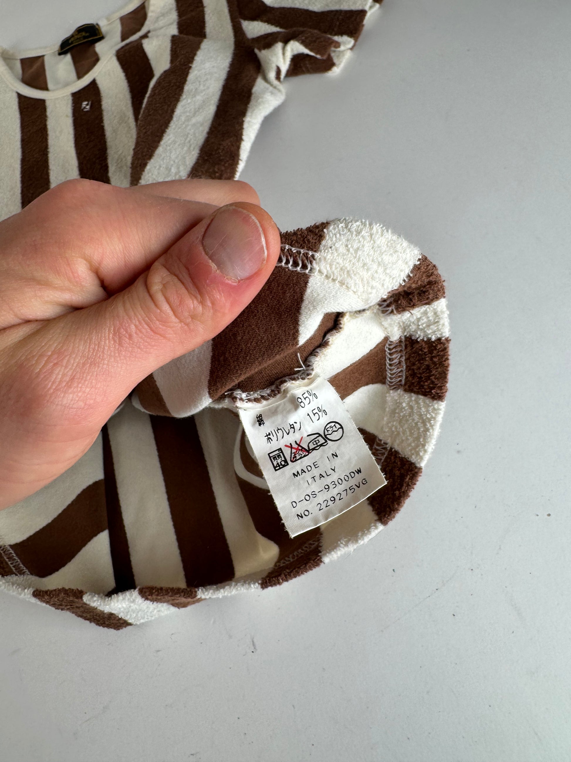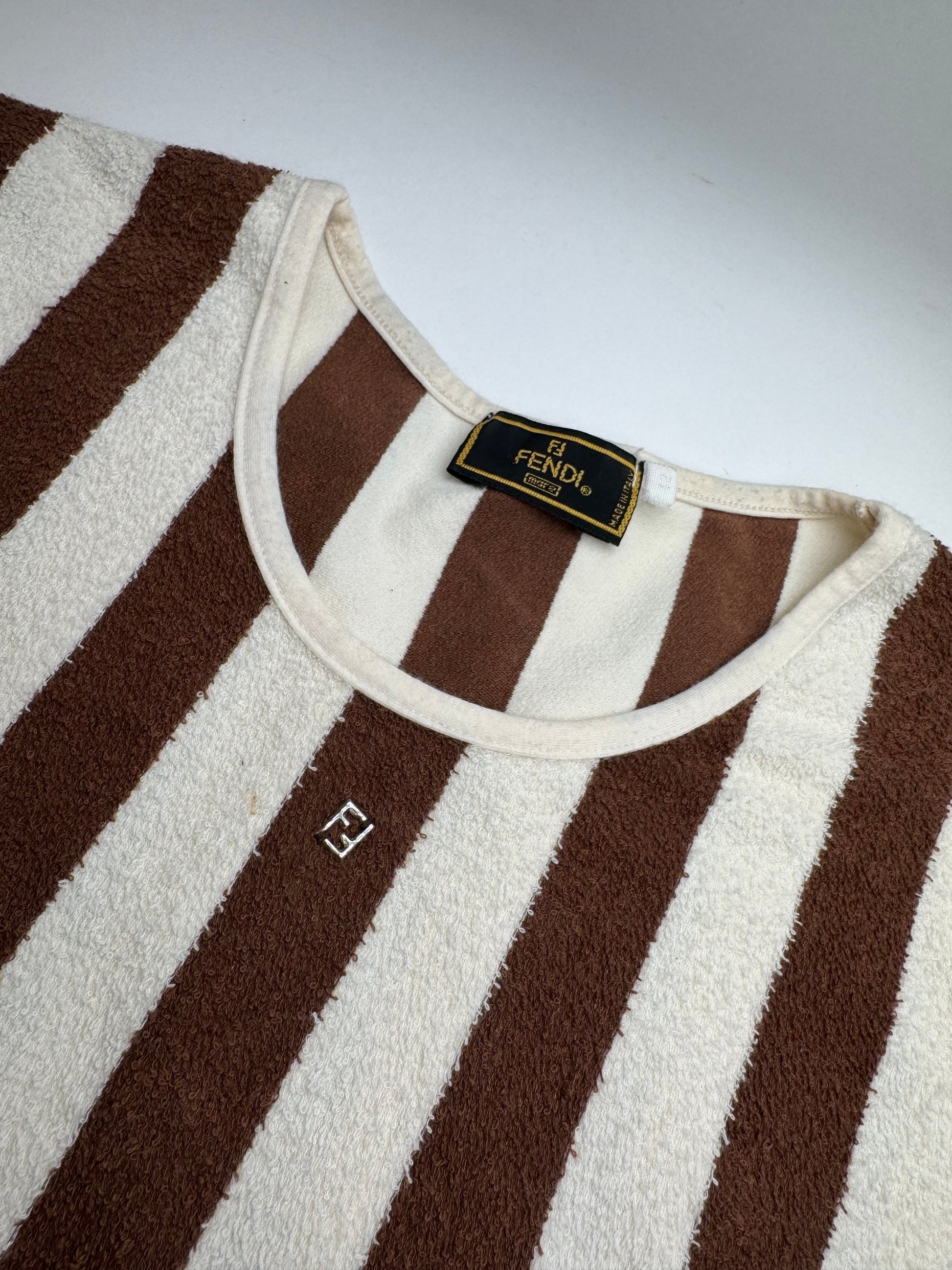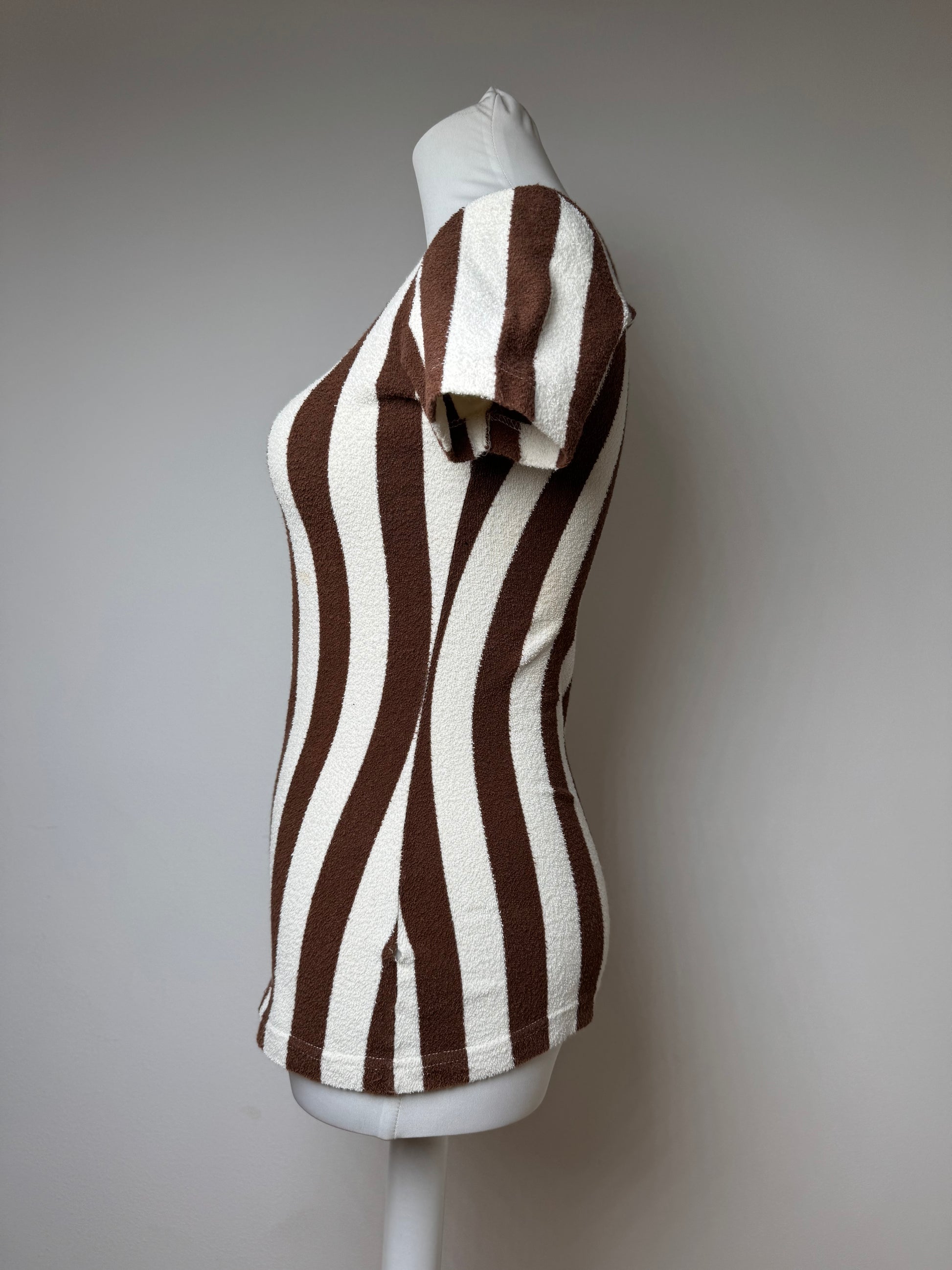 This unique shirt is crafted from a stretch terry-like fabric in white with horizontal brown stripes. Made in Italy, it offers a fitted, retro-inspired look. Size is S/M.