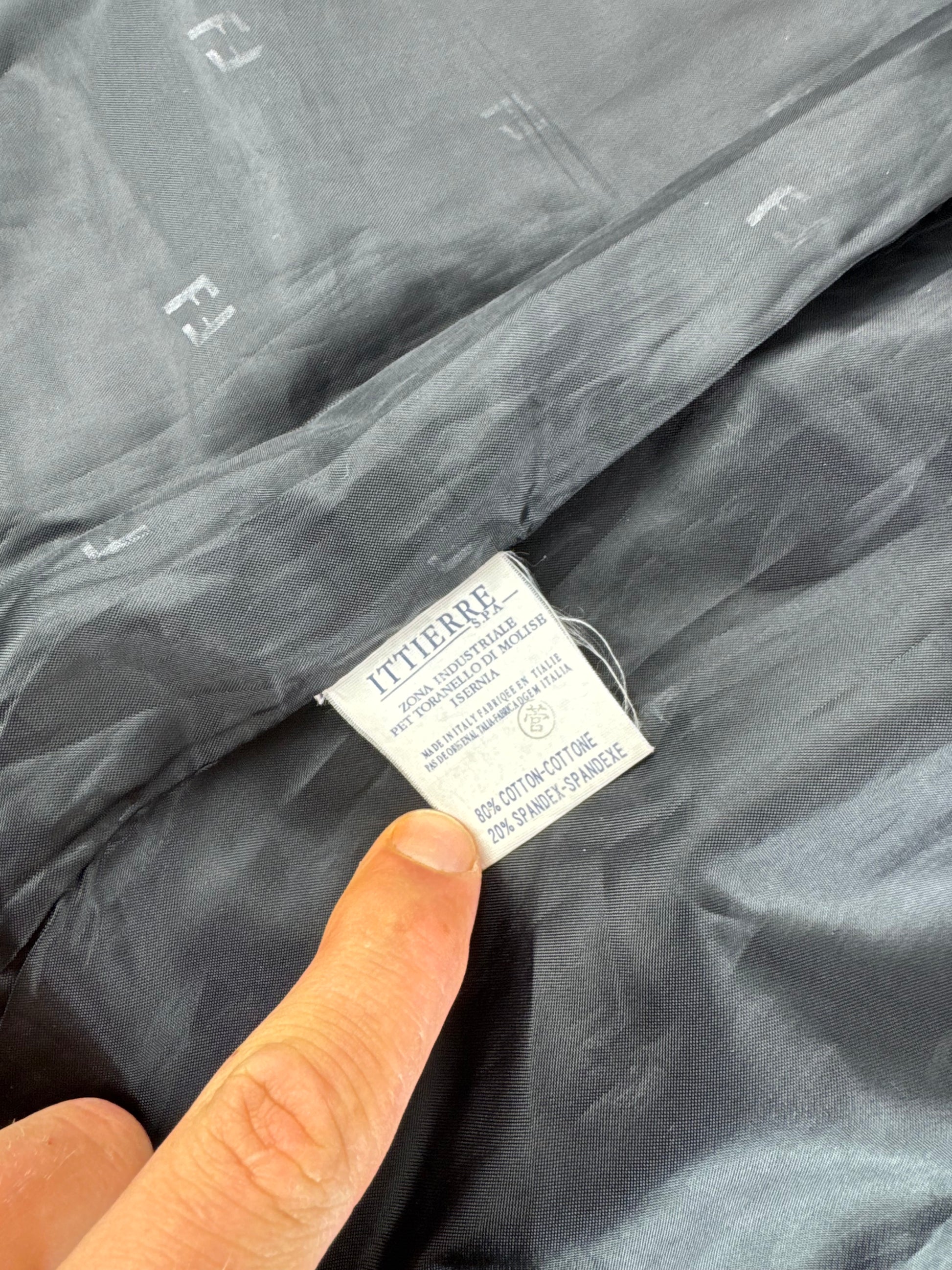 FENDI Vintage Anthracite Canvas Trench Coat. This stylish vintage trench coat is crafted from anthracite-colored canvas made of 80% brown wool and 20% spandex. It features brown wooden buttons engraved with the Fendi logo, a matching belt, and a bold FENDI lettering across the back. The interior is lined in black canvas with the iconic FF monogram. Made in Italy, this piece combines statement branding with timeless tailoring.