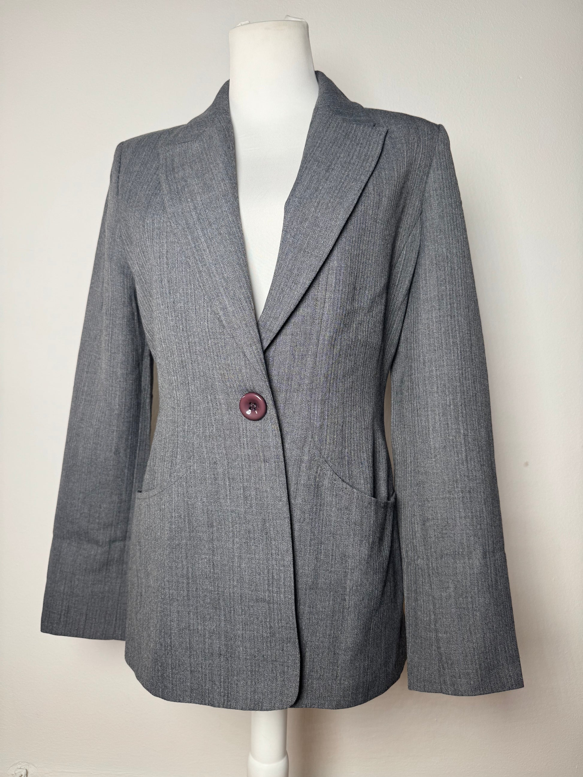 This chic blazer is finely crafted from grey 100% lana wool and features a single lilac plastic button closure. The interior is lined with grey viscose. The piece is likely from the 1980s and presents a classic, structured silhouette.
