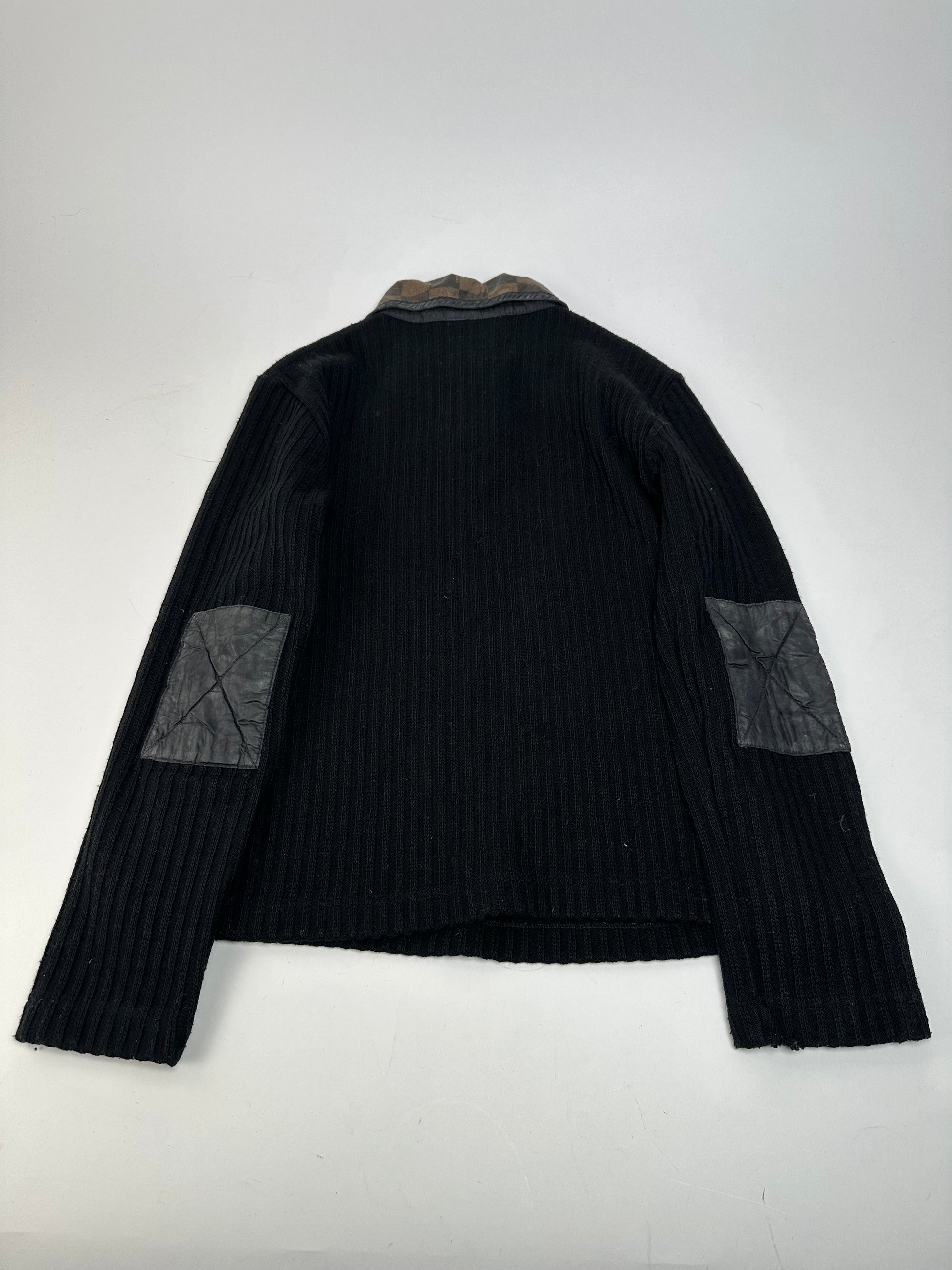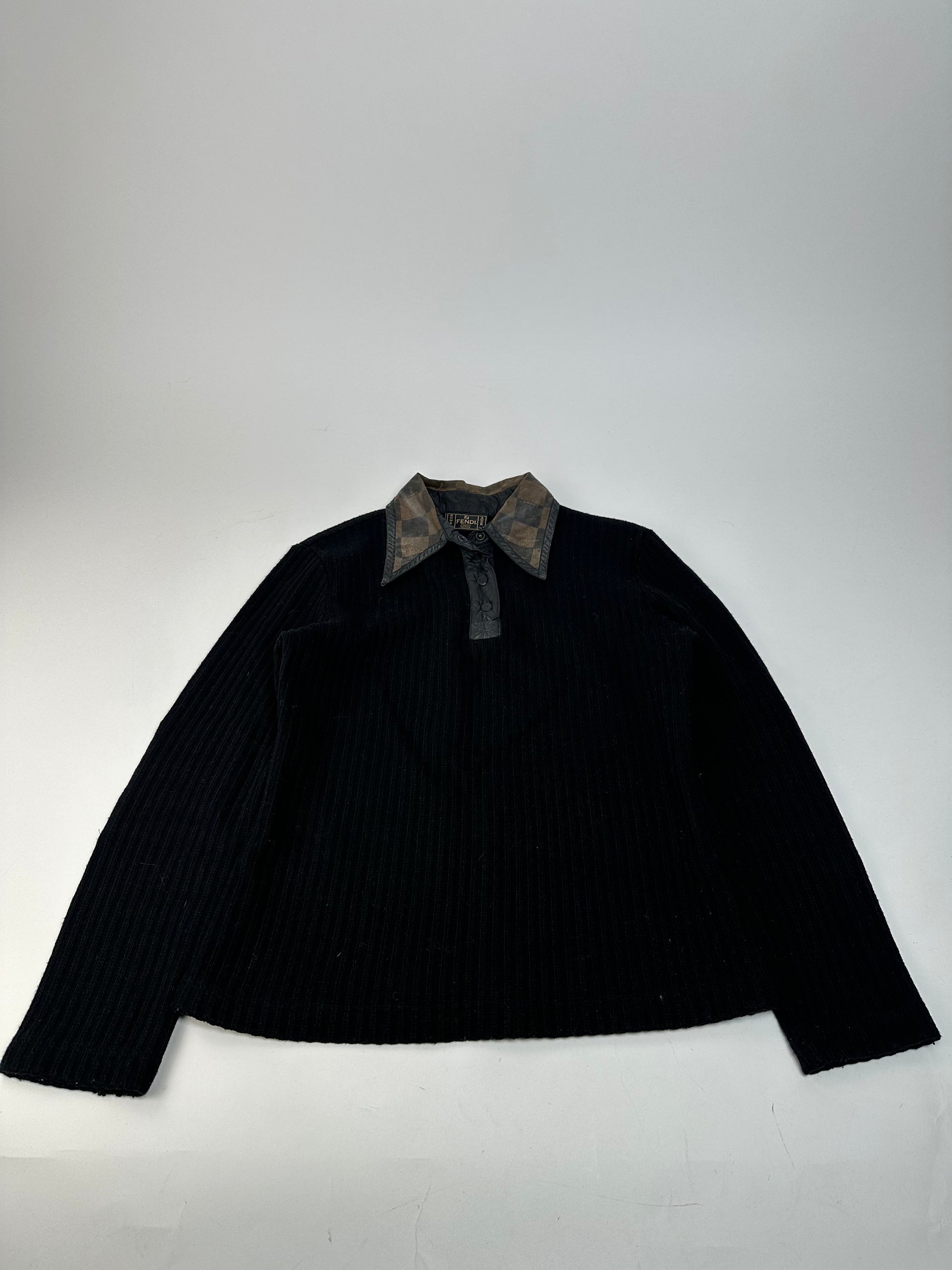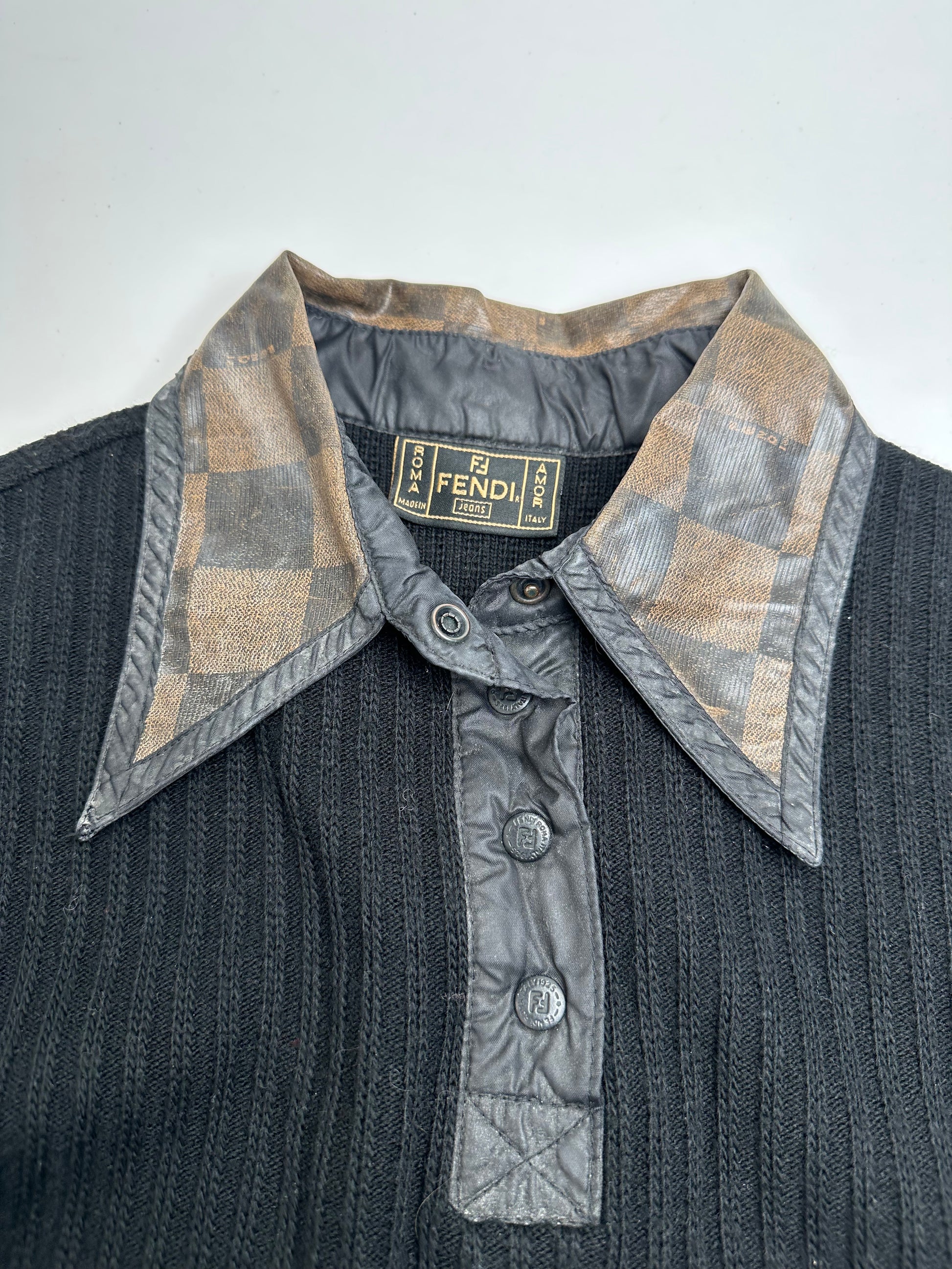 FENDI Vintage Sweater. This refined sweater is crafted of black wool and features a shirt-style collar in brown vegan leather with a checkerboard pattern. The design is detailed with anthracite-tone steel buttons engraved with the Fendi FF logo. The mannequin in the photos is size 38/M.