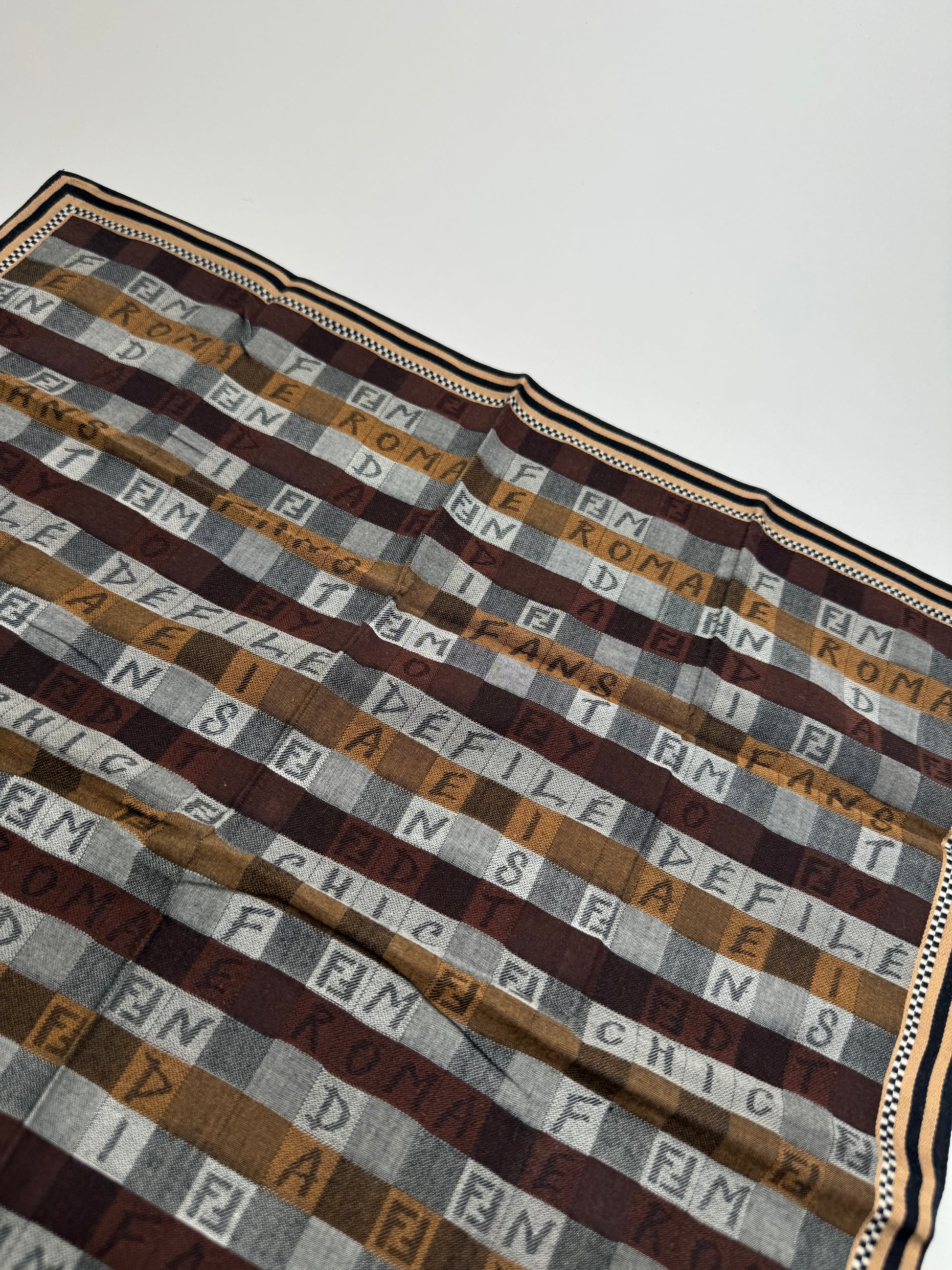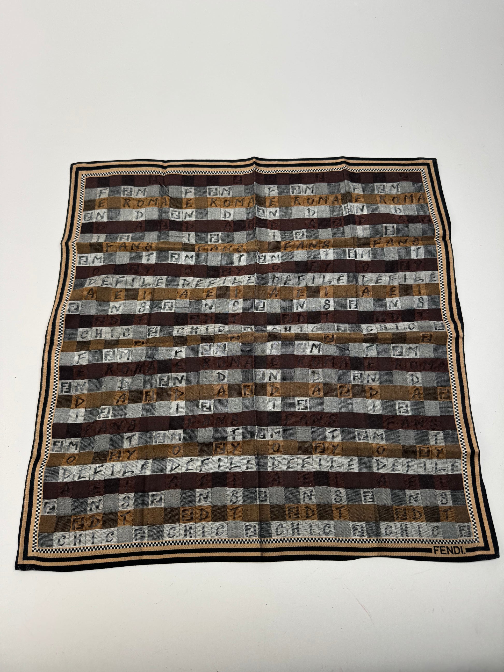 This vintage scarf is finely crafted of canvas and silk-blend fabric in a grey-brown-black chessboard pattern featuring Fendi script logos and FF monograms throughout. The border is designed with beige and black stripes. This unisex accessory offers a bold yet timeless statement.
