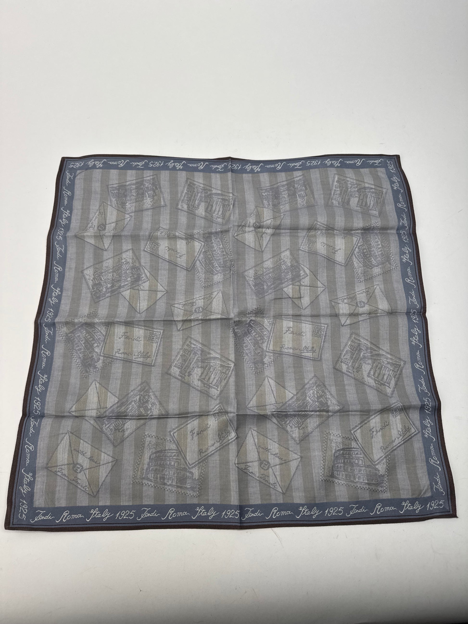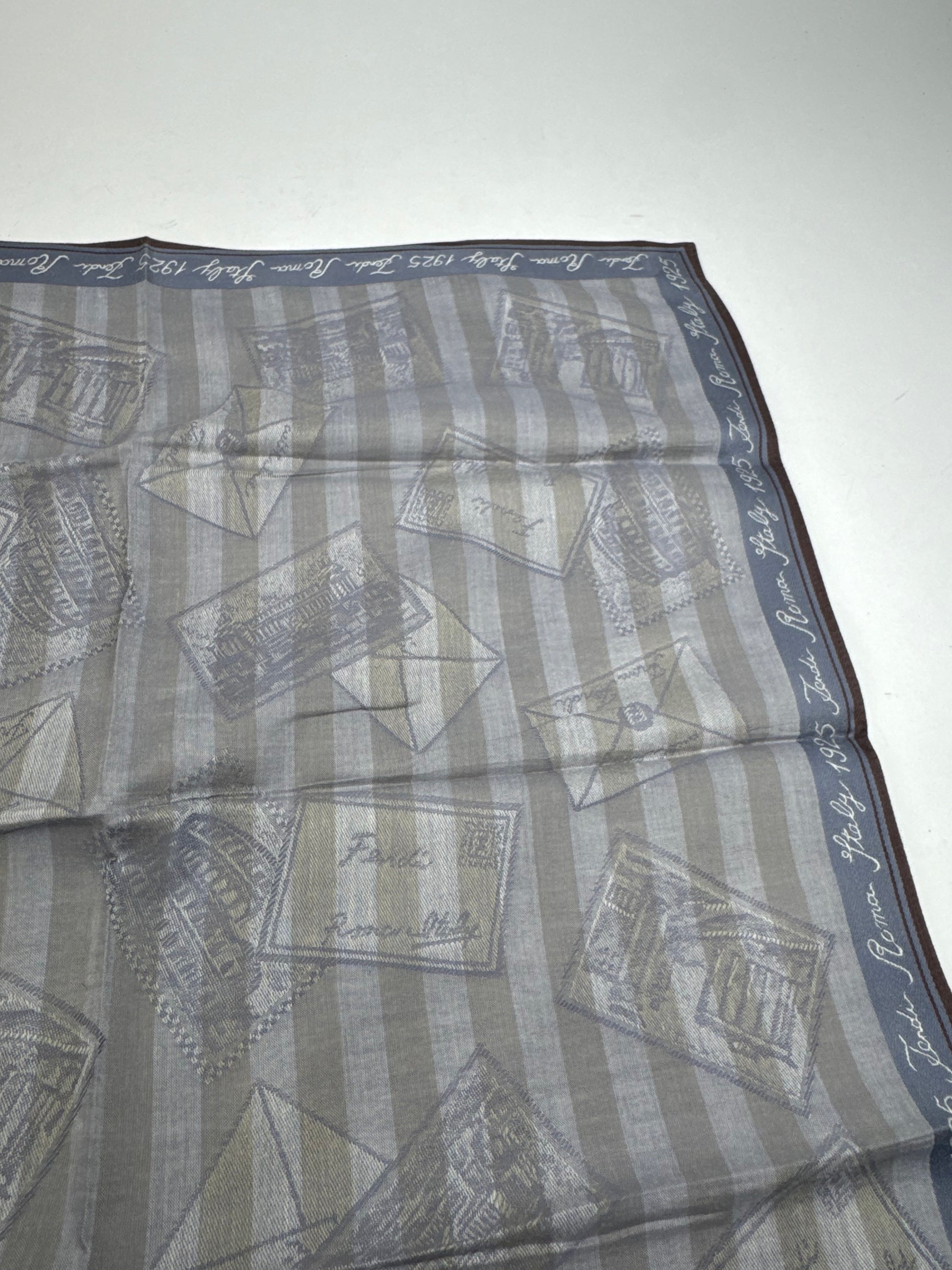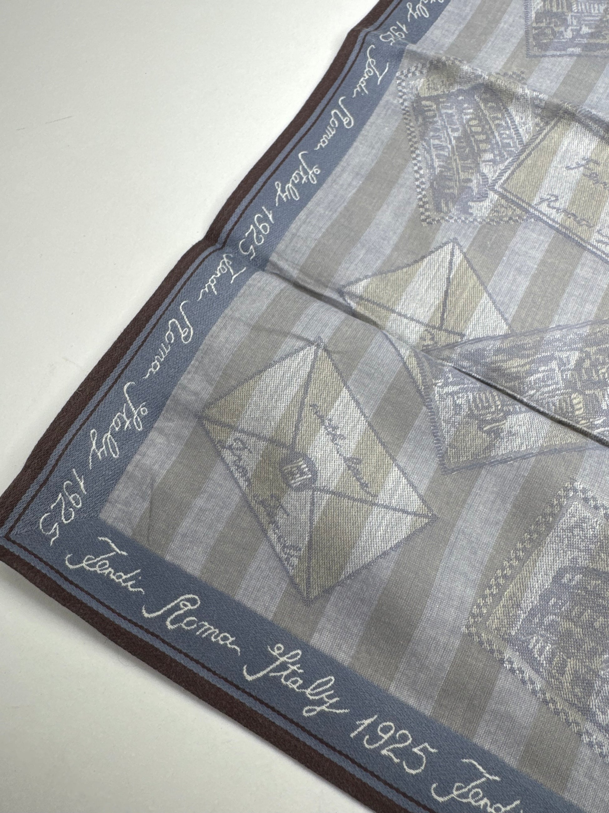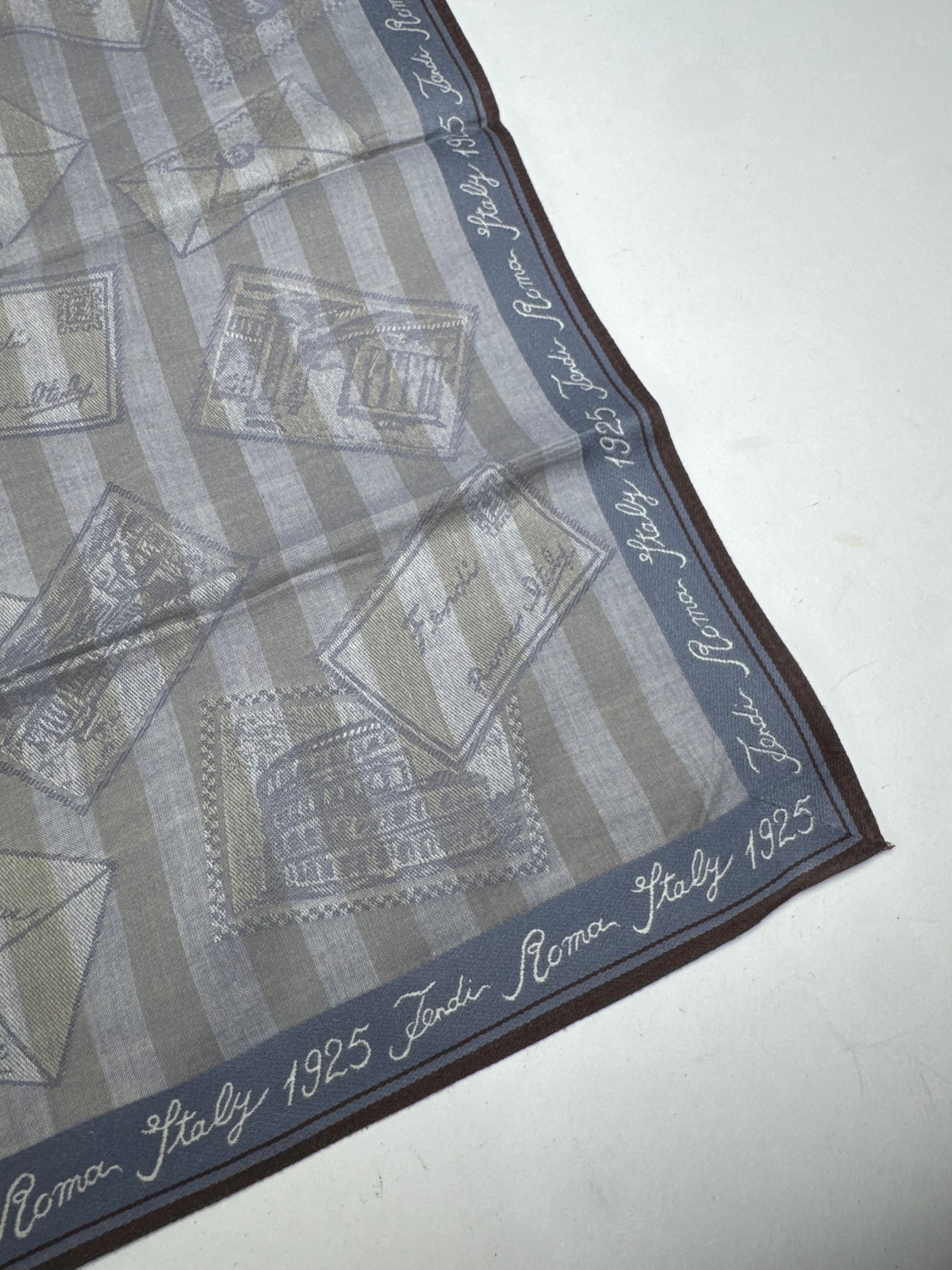 This vintage scarf is finely crafted of silk and canvas in a grey and blue striped pattern, featuring playful postcard and stamp-inspired logo prints throughout. The border is detailed with white “FENDI ROMA ITALY 1925” lettering.