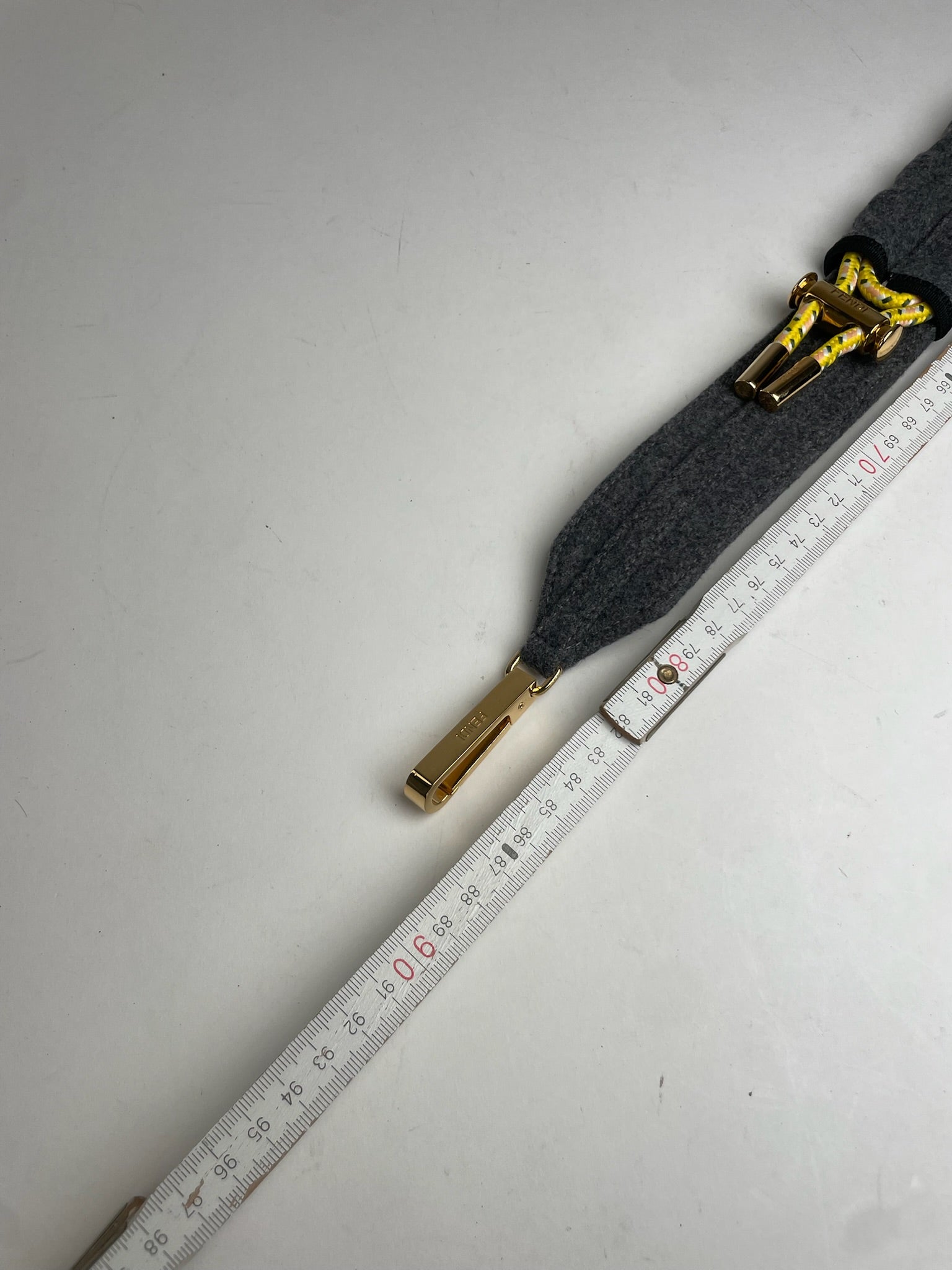 FENDI Vintage Belt. This distinctive vintage belt is crafted from grey wool and features gold-tone steel metal tips, complemented by a yellow, blue, and white cord drawstring says closure, reflecting Fendi’s playful yet refined approach to luxury design.